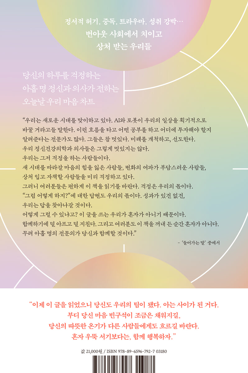 아홉 명 정신과 의사가 함께 쓴 오늘날 ‘우리 마음 차트’ 하루를 시작하고 마무리하면서 가뿐하게 ‘기분 좋다’라고 이야기하는 이들은 많지 않을 것이다. 하루 종일 바쁘게 지냈지만 무엇도 썩 잘해낸 것 같지 않고, 지친 채로 집에 돌아가는 길에 소셜 미디어 속에서 마주한 타인의 얼굴은 나와 달리 반짝반짝 빛난다. 온라인 커뮤니티에는 누가 어디에 투자해서 ‘대박’이 났다는 이야기뿐이고, ‘나만 어떤 흐름을 놓치고 있다’는 두려움인 포모 증후군(Fear of Missing Out, FOMO)에 시달린다. 불안감 속에서 집중력은 사라지고, 허기진 마음을 채우고자, 혹은 불안을 회피하고자 우리는 무언가를 먹고, 마시고, 보고, 사고, ‘질 낮은 도파민’에 빠져든다. 옆 사람도, 옆옆 사람도 지쳤다. 거대한 분노와 트라우마가 이어진다. 팬데믹은 지나갔다지만 사람 사이 ‘연결’이 끊어지고 소셜 미디어 속 ‘친구 맺기’가 진짜 관계를 대체한 지금, 한국사회의 정신건강 지표는 나날이 악화되고 있으며, 슬프게도 정신건강의학과는 ‘호황’이다. 그래서 ‘글 쓰는 정신건강의학과 의사회’가 모였다. 각자의 진료실에서, 누적되는 환자들의 호소를 들으며 위기감을 느꼈고, 한 개인의 아픈 마음은 거대한 사회 변화를 살피지 않으면 해결되기 어렵다는 공감 아래 대화를 나누고, 글을 모았다. 사람 사이 연결이 사라진 시대, 손절 문화 속 ‘정서적 허기’ 배고프지 않은데 계속 음식을 찾게 되는 강렬한 욕구, ‘가짜 배고픔’을 느낀다는 이들이 많다. 이 허기는 사실 마음 속 ‘빈 공간’, 외로움을 채우고 싶다는 몸의 신호일지도 모른다. 광풍처럼 몰아치던 일들이 지나가고 위안이 필요한 순간에, 정서적 허기는 불현듯 우릴 찾아온다. 우리는 ‘연결된 외로움’ 속에서 살고 있다. 소셜 미디어 속에 너무 많은 사람들이 있지만, 그들과 따뜻한 온기를 나누지는 못한다. 애정 욕구는 원시시대부터 늘 ‘함께’하며 생존을 보장받고 정서적 안정을 누려왔던 인간의 기본값이다. 그러나 코로나19 이후, 비대면 ‘손절’ 문화 속에서 우리는 공감 받고 인정받고 사랑받는 기본적인 애정 욕구를 충족하지 못했다. 마음속에 빈 공간이 생기면 ‘무엇으로든 이 헛헛함을 채우고 싶다’는 갈망이 생기고, 그렇게 중독에 빠진다. 가볍게는 쇼츠와 릴스 중독, 혹은 담배나 술, 마약 같은 물질 중독이 바로 우리 사회 거대한 정서적 허기의 증거이다. · “내가 기억하는 공동체 삶이란 이런 것이었다. 경제적으로 풍족한 집을 소셜 미디어가 아닌 내 눈으로 볼 수 있었다. 잘사는 집에도 어려움이 있고 아픔이 있고 상처가 있었다. 우리 집보다 못사는 집에도 정이 있고 인격과 사랑이 있고 희망이 있음을 알 수 있었다. 감기에 걸리면 똑같이 아팠고, 부모님 사이에 냉기가 흐르면 아이들은 어느 집 할 것 없이 우울하게 등교를 했다. 경제적 격차가 눈에 보였지만, 반전의 기회도 늘 있어 보였다. 옛날이 살기 좋았다는 얘기는 그런 얘기다. 서로의 인생을 알 수 있었고, 이야기를 나눌 기회가 많았다. 어쩌다 보니 오늘날 우리는 ‘따로’ 살게 되었다. 계층 간에도 멀어졌지만, 같은 계층에서도 따로 살고 있다. 그래서 안에서도 밖에서도 어디서도 마음을 채울 수가 없다.” (48~49쪽, 1장 「감정적으로 허기진 사람들」) 남의 성공 이야기가 너무 많이 들리는 사회에서 나만 뒤처질 수 없다는 압박감 현대 한국사회 마음 건강을 이해하는 핵심 키워드 중 하나는 포모 증후군이다. 소셜 미디어 속 잘 가꿔진 이미지, 전국 전 세계 단위로 들려오는 자극적인 소문으로 사람을 만난다. 우리는 누군가의 화려한 삶, 성공과 성취를 보며 남들에 발맞춰 생산성을 끌어내야 한다는 압박감을 느낀다. 무엇이 우리의 일상에 침투하는지 미처 깨닫지 못한 채, 한탕 성공에 집착하며 투자(도박) 중독에 빠지고, 누군가는 자신의 집중력을 의심하며 스스로 ADHD라 진단 내린다. ‘남들보다는’ 혹은 ‘남들만큼은’이라고 곱씹으며 상대적 불안 속에 스스로를 괴롭힌다. · “남의 이야기는 우리의 한탕 심리를 자극한다. 중독을 벗어나기 위해서는 이런 이야기들과 나의 ‘거리감’을 인식하는 것도 중요하다. 코인으로 수십 억 벌어 강남 집 산 사람의 이야기는 잘 기억하지만, 잃은 사람 이야기는 이상하게 다들 잊는다. 남의 성공담은 아주 특수한 사례일 뿐인데도, 우리 사회에서는 100명 중 잃은 99명의 사례를 접하기도 어려울뿐더러 뇌가 나의 편향에 따라 ‘선택적 기억’을 한다. 전해 오는 이야기도 문제지만, 남의 삶의 결말까지 우리가 다 알 수 없다.” (112~113쪽, 3장 「우리가 빠진 것은 투자일까, 도박일까」) 내가 불안할 때 ‘너와 나’도 불안해진다 관계 위기를 회복하는 법 정신건강 위기의 시대일수록 사람 사이의 단단한 연결이 필요하지만, 우리를 흔드는 외부의 자극이 많은 오늘날 많은 이들이 ‘나’를 먼저 살피지 못해 관계의 위기를 겪기도 한다. 한쪽에서는 부부의 위기가 시청자의 구경거리가 되고, 또 어디선가는 나날이 높아져만 가는 양육의 기준에 지쳐가는 엄마가, 그래서 흔들리는 가족이 있다. 인내심을 가지고 찬찬히 관계