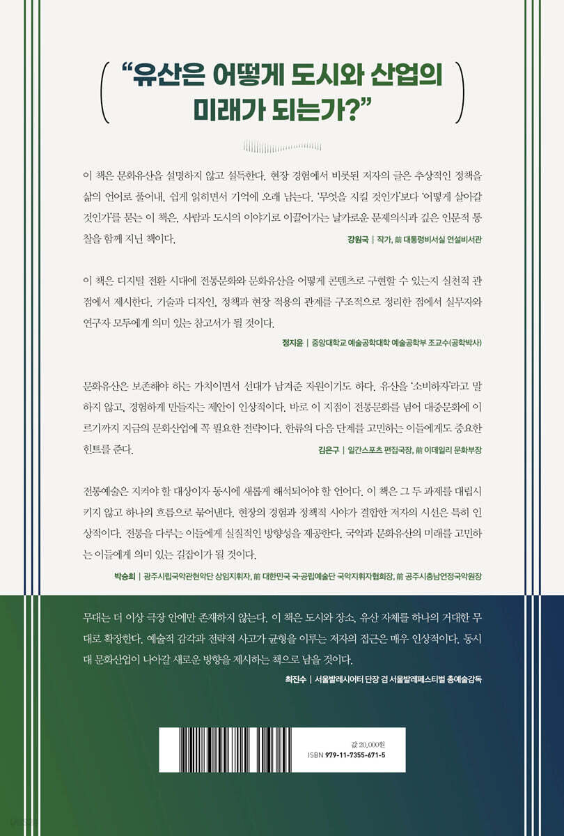 문화유산은 보존해야 하는 가치이면서 선대가 남겨준 자원이기도 하다. 유산을 ‘소비하자’라고 말하지 않고, 경험하게 만들자는 제안이 인상적이다. 바로 이 지점이 전통문화를 넘어 대중문화에 이르기까지 지금의 문화산업에 꼭 필요한 전략이다. 한류의 다음 단계를 고민하는 이들에게도 중요한 힌트를 준다. - 김은구 (일간스포츠 편집국장, 前 이데일리 문화부장)