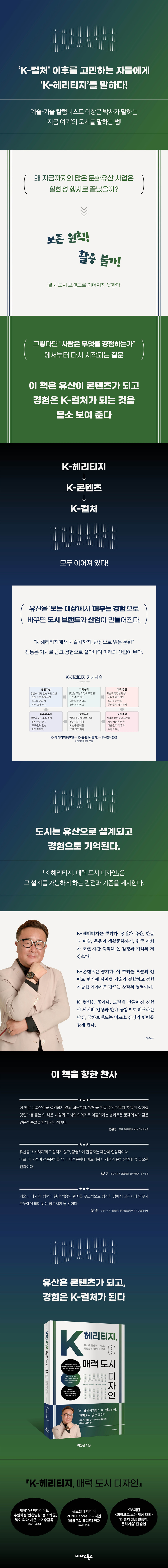 K-헤리티지에서 K-콘텐츠, 다시 K-컬처까지. 유기적으로 이어지는 선순환 구조로 ‘지금 여기’의 도시를 말하는 법 딱딱한 이론이 아닌 대중의 언어로. 관점으로 읽고 현장에서 답하는 실전형 문화 교양서! * 예술경영학박사(Ph.D.) ㆍ 예술-기술 칼럼니스트(Art & Technology) * 2021~2022 세계유산 미디어아트 - 수원화성 시즌 1~2 총감독(연출제작단장) * 2024~2025 구 송도역사 복원 디지털실감영상관 및 미디어타워 예술감독 * ZDNET Korea 오피니언 연재 ㆍ KBS대전 〈과학으로 보는 세상 SEE〉 출연 이 책은 전통문화와 문화유산을 단순히 지켜야 할 대상이 아니라 도시를 설계하고 미래를 디자인하는 문화 자산으로 바라본다. 저자는 문화유산을 과거에 머무는 대상이 아니라 동시대의 경험과 만나며 도시의 서사와 브랜드를 새롭게 만드는 살아 있는 자산으로 바라본다. 문화유산은 그렇게 도시 디자인의 힘으로 거듭난다. 무엇보다 『K-헤리티지, 매력 도시 디자인』은 학술서나 정책보고서가 아닌 누구나 읽고 현장에서 활용할 수 있는 대중 교양서를 지향한다. 각 장은 문제 제기부터 사례, 실행 방향까지 자연스럽게 이어진다. 이를 통해 K-헤리티지의 개념이 우리의 생활과도 아주 가까이 있음을 보여준다. 도시 실무자, 관광, 콘텐츠, 예술계 종사자, 전공자 그리고 도시의 방향에 관심이 있는 독자에게 이 책은 ‘도시의 유산을 새롭게 읽는 법’을 제공할 것이다. “유산은 보존으로 남고, 경험으로 살아나며, 산업으로 이어져 미래를 만든다.” 전통과 현대의 만남 위에서 던지는 첨예한 문제의식 ‘국가유산은 오늘의 삶을 어떻게 바꾸고 있는가.’ 공간이 전하는 이야기 속에서 도시의 기억과 미래를 말하다 만화 원작의 드라마 〈궁〉이 오랜 기간 대중의 사랑을 받은 이유는 무엇일까. 전통적 공간이었던 ‘궁’을 현대적 감각으로 재해석했을 때 생기는 시너지. 그 힘이 K-헤리티지의 가능성을 보여준다. 유산과 기술, 문화는 각기 뿌리와 줄기, 꽃처럼 연결되어 하나의 생태계를 이룬다. 한 도시의 문화는 과거의 시공간에 머무르지 않는다. 세계화의 흐름 위에서 더 멀리 나아가야 한다. 저자는 현장 전문가의 시선으로 무엇을 바꾸고, 어떻게 경험하게 할 것인가를 묻는다. 관점을 전환하는 순간, 밤의 유적은 불 꺼진 장소가 아니라 창작과 축제의 공간이 된다. 유산은 ‘보는 대상’에서 ‘경험하는 공간’으로 확장되며 생명력을 얻는다. 도시의 현재를 새롭게 바라보고 미래의 방향을 고민하는 이들에게 『K-헤리티지, 매력 도시 디자인』은 전통문화와 문화유산을 경험과 산업, 도시의 미래로 확장해 바라보는 기준을 제시한다. 아울러 K-컬처 이후의 다음 장면을 설계하려는 독자에게 필요한 질문을 던진다. |
