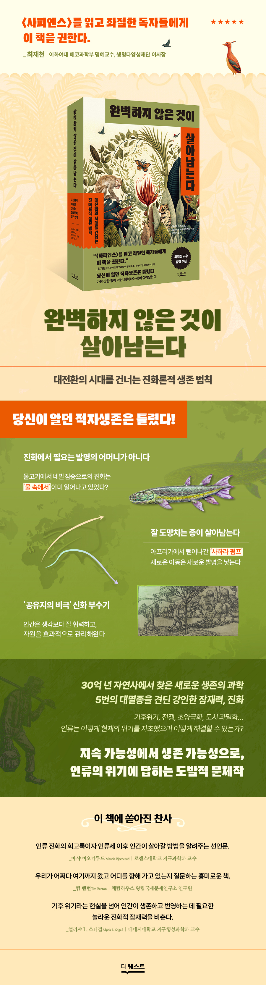 적자생존이 모든 진화의 원칙이었을까? 30억 년 자연사를 관통하는 생존의 핵심 전략은 불완전함과 유연함이었다. 환경과의 불일치에 적응하고 살아남은 '적당함'은 인류세의 위기를 극복할 진화적 회복력을 일깨워 준다.