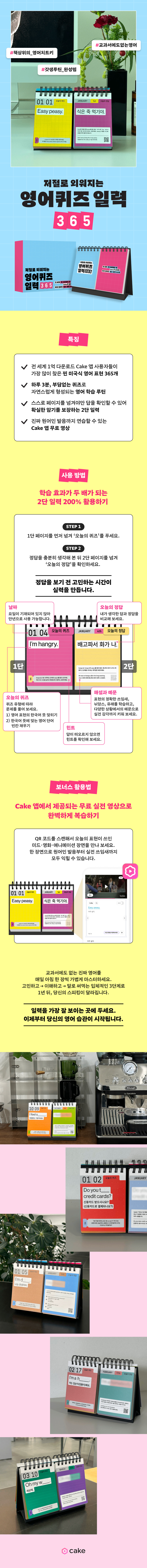 어떤 영어 표현의 뜻을 단순히 읽기만 하는 것과, 스스로 그 뜻을 깊게 고민해 본 뒤 정답을 확인하는 경험은 완전히 다른 결과를 가져온다. 능동적인 학습이 반복될수록, 영어는 단순한 지식이 아니라 자연스럽게 입 밖으로 나오는 ‘실력’이 된다. 『저절로 외워지는 영어퀴즈 일력 365』는 이러한 학습 원리가 매일의 루틴이 되도록 설계되었다. 왼쪽 페이지에서 ‘오늘의 퀴즈’를 풀고 오른쪽 페이지에서 ‘오늘의 정답’을 확인하는 간단한 반복이 쌓이면, 일력 속 표현들은 어느새 필요할 때 바로 떠오르는 ‘내 영어’가 될 것이다. “하루 두 장, 나만의 365일 영어 루틴” 영어 실력은 한 번에 많은 시간을 들이기보다 매일 짧게라도 꾸준히 학습할 때 더 확실하게 쌓인다. 매일 재미있는 퀴즈 하나로 나만의 영어 루틴을 만들어보자. 1년 동안 쌓이는 365개의 경험은 단순한 지식을 넘어, 나만의 살아있는 ‘영어 감각’으로 발전할 것이다. 하루 5분이면 충분하다. 작은 실천을 꾸준히 이어가는 사람만이 느낄 수 있는 변화가 있다. 지금부터 매일 한 장씩 넘기며, 『저절로 외워지는 영어퀴즈 일력 365』를 나만의 데일리 루틴으로 굳혀보자. “Cake 앱의 리얼 클립으로 완벽한 마무리” 각 페이지의 QR 코드는 해당 표현이 등장하는 Cake 앱의 리얼 클립으로 연결된다. 미드·영화·애니메이션 영상을 통해 원어민의 실제 발음과 사용 맥락을 확인할 수 있어 책에서 학습한 표현이 실제 대화에서 어떻게 쓰이는지 확인하고, 반복 재생 기능을 활용하면 원어민 속도에 맞춰 여러 번 따라 말해볼 수 있다. 이처럼 『저절로 외워지는 영어퀴즈 일력 365』는 읽기(input)에서 말하기(output)까지 확장되는 학습 경험을 통해 균형 잡힌 영어 학습 루틴을 제공한다. |