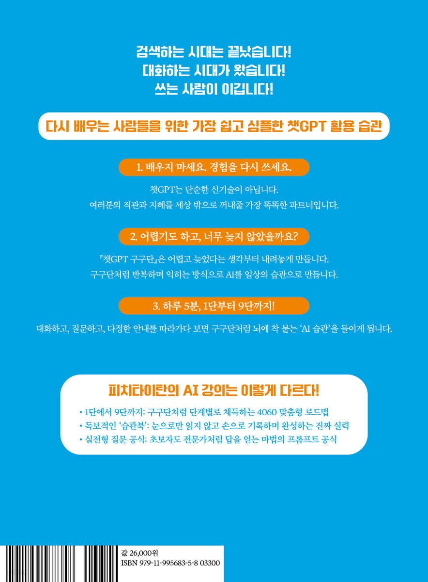 새로운 걸 배워야 한다는 생각이 들면, 우리는 종종 ‘내가 해낼 수 있을까?’ 하는 불안을 먼저 느낀다. 그 감정이 배우는 속도를 늦추고, 시도조차 막아버린다. 두려움의 정체는 결국 ‘모름’이다. 우리는 모르는 것 앞에서 두려움을 느끼지만, 그건 뇌의 자연스러운 반응이다. 처음 만나는 상황에서는 누구나 긴장한다. 심리학에서는 이런 긴장을 반복적으로 경험할수록 점점 익숙해지는 과정을 습관화(Habituation)라고 부른다. 낯선 자극에 조금씩 노출되면, 그 낯섦은 이내 평범한 일상이 된다. 새로운 도구를 배울 때도 똑같다. 처음엔 어렵고 복잡해 보여도, 매일 조금씩 해보면 금세 두려움이 줄어든다. --- p.14, 「기술보다 어려운 건 ‘두려움’이었다」 중에서 구구단을 외우듯, AI도 단계별로 조금씩 익혀나가면 절대 어렵지 않다. 사람의 뇌는 새로운 정보를 구조화된 패턴 속에서 가장 빠르게 익힌다. 이것을 ‘스캐폴딩(Scaffolding, 발판 학습)’이라고 부른다. 높은 건물을 한 번에 짓지 못하듯, 배움에도 중간 발판이 필요하다. 『챗GPT 구구단』은 바로 그 발판의 개념으로 설계되었다. 한 번에 모든 기능을 배우는 대신, 각 단마다 익혀야 할 핵심 개념 하나씩만 집중한다. 이해와 실습, 그리고 작은 성공의 경험이 누적되면서 자연스럽게 전체 구조가 몸에 밴다. 한 번에 다 하려 하지 말고, 조금씩, 자주, 반복하면 된다. 하루 5분, 한 가지 질문, 한 문장 대화. 그것이면 충분하다. 구구단을 처음 배울 때도 그랬다. 한꺼번에 9단까지 외운 게 아니라 “2단은 쉽네, 3단은 조금 빠르네, 5단은 재미있네” 하며 매일 조금씩 늘려갔다. 그 느린 반복이 결국 완성을 만들어 냈다. 이 책 역시 같은 원리를 따른다. --- p.20, 「구구단처럼 챗GPT를 쓸 수 있다면 」 중에서 이 책의 매 ‘단’마다 마지막에는 습관북(Habit Book)이 있다. 습관북은 단순한 노트가 아니다. 당신이 배운 것을 ‘행동으로 옮기고, 기록으로 남기는 도구’다. 많은 사람들이 새로운 걸 배우지만 금세 잊는다. 그 이유는 ‘기록하지 않기’ 때문이다. 기억은 흩어지지만, 기록은 남는다. 습관북은 바로 그 차이를 만들어 준다. 오늘 던진 질문 한 줄, 인상 깊었던 답변 한 줄, 당신의 짧은 소감 한 줄. 이 세 줄이 모이면 그것이 당신의 AI 학습 루틴이 된다. --- p.65, 「행동을 기록으로 남겨라」 중에서 |