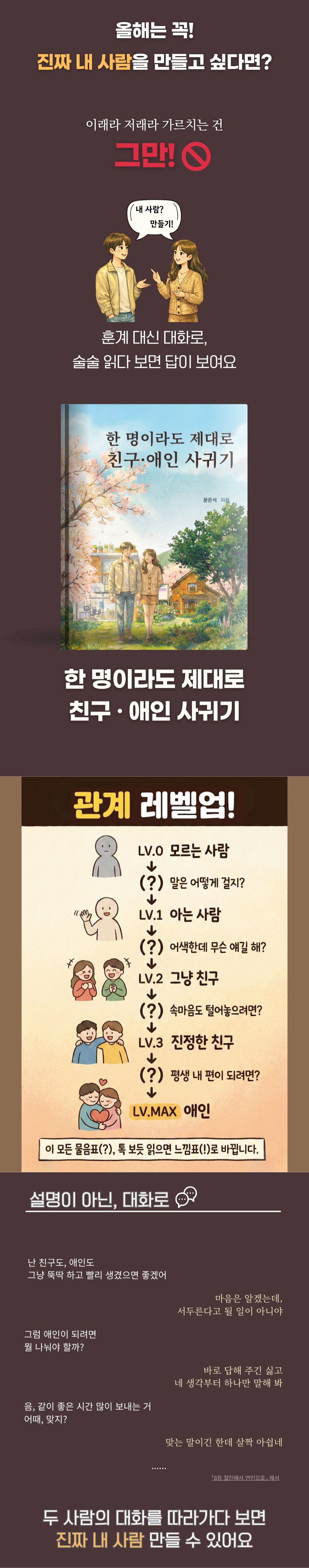 청소년과 청년을 위하여 학생들을 상담하다 보면 “사람과 사귀는 법”을 제대로 배워 본 적이 없는 친구들이 참 많습니다. 이 책은 인사, 잡담, 연락하기 같은 작은 기술에서 시작하여, 다툼과 화해, 이별까지 자연스럽게 이어집니다. 딱딱한 이론이 아니라 젊은이 눈높이에 맞는 대화와 이야기로 가득해서, 청소년과 청년에게 부담 없이 추천할 수 있는 인간관계 안내서입니다. 특히 두 인물의 대화를 메신저 앱 대화처럼 구성하여 독자 편의성을 높인 것이 인상적이었습니다.