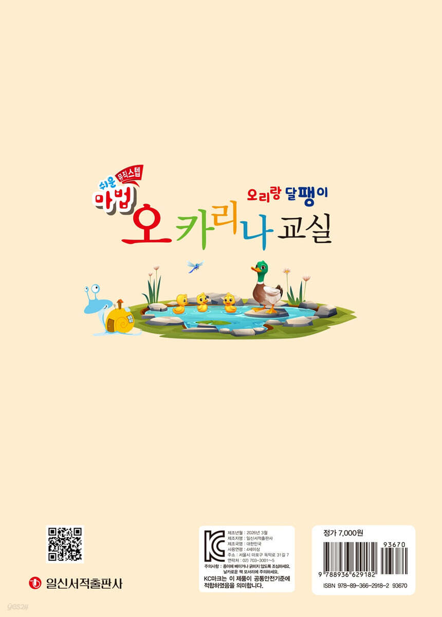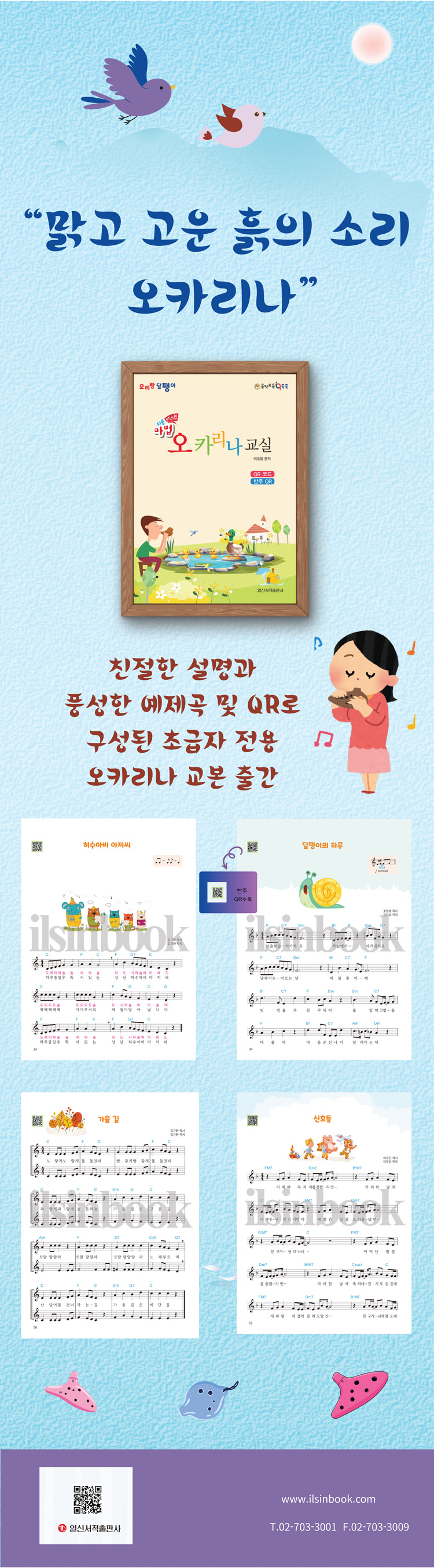 오카리나 음역과 종류 오카리나 운지 연주 자세 호흡법, 텅잉, 아티큘레이션 기초 음악이론 〈‘가운데 도~시’ 음 익히기〉 ‘솔, 라, 시’ 연습 비행기 / 거미 ‘파, 미, 레, 도’ 연습 꼬마벌 / 나비야 / 통통통통 / 작은별 / 올라간 눈 / 똑같아요 〈‘위의 도, 레’ 음 익히기〉 ‘위의 도, 레’ 연습 징글벨 / 허수아비 아저씨 / 퍼프와 재키 / 루돌프 사슴코 [이론] 조표와 임시표 〈‘시플랫’ 음 익히기〉 시플랫 연습 숲 속을 걸어요 / 바람이 불어오는 곳 / 풍선 / 달팽이의 하루 [이론] 바장조와 사장조 〈‘파샤프’ 음 익히기〉 파샤프 연습 빙고 / 생일 축하 노래 / Baby Shark / My Heart Will Go On [이론] 박자표(6/8박자), 덧줄과 덧칸 〈‘위의 미, 파-아래 라, 시’ 음 익히기〉 ‘위의 미, 파’ 연습 고요한 밤 거룩한 밤 / 학교 가는 길 / 아기 공룡 둘리 / 꼭 안아줄래요 ‘아래 시, 라’ 연습 그대로 멈춰라 / 네 잎 클로버 [부록] 연주곡 모음 가을 길(2중주) 캐롤 메들리(3중주) 위풍당당 행진곡(3중주) 신호등(독주) |