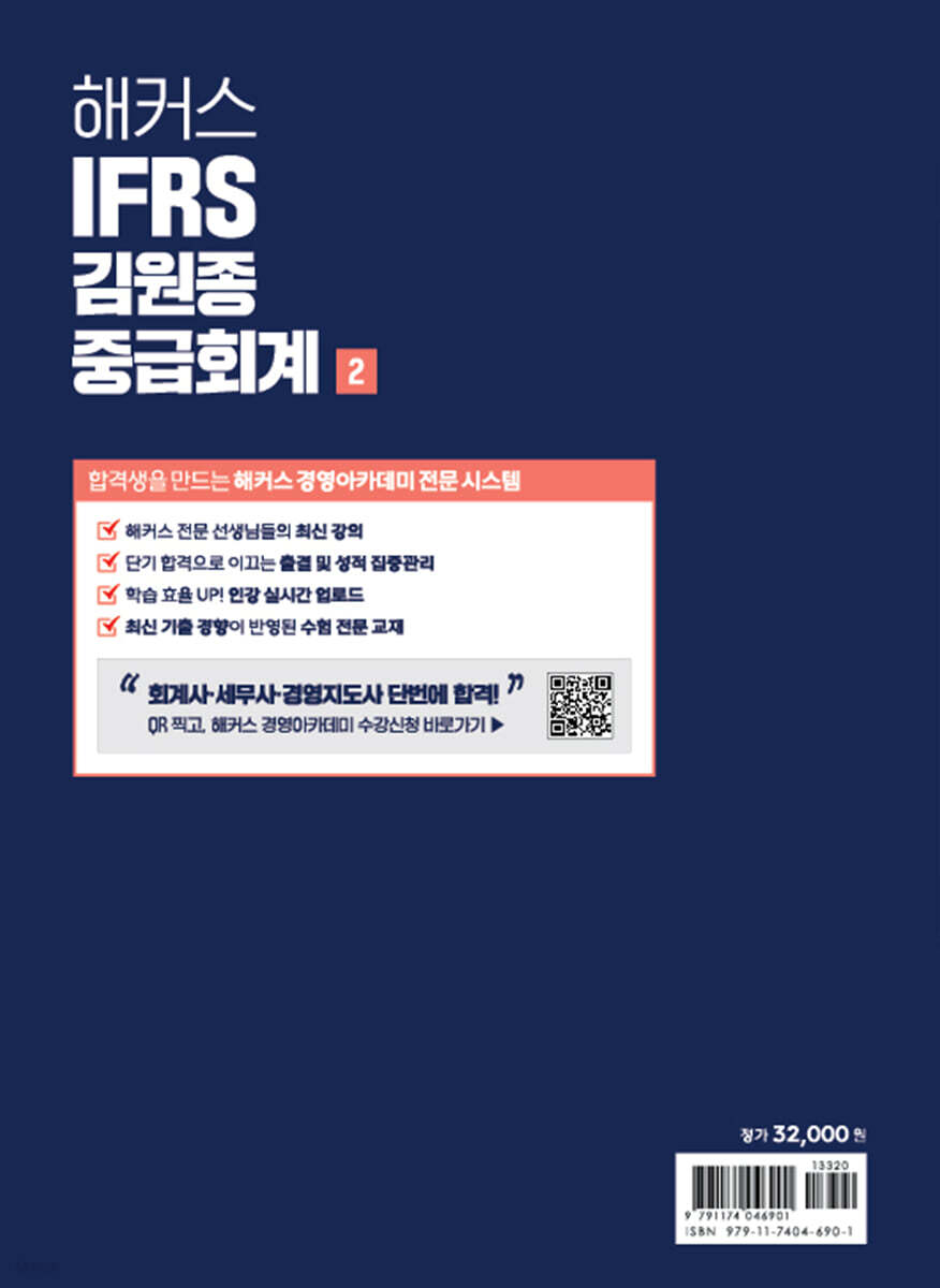 주간동아 선정 2023 한국브랜드만족지수 교육(온·오프라인) 회계사 부문 1위 최신 국제회계기준 반영! 공인회계사/세무사 1, 2차 시험 대비를 위한 중급회계 기본서! [이런 분들에게 추천합니다] 1. 공인회계사/세무사 1, 2차 시험을 준비하는 모든 분들 2. 핵심 이론 정리부터 실전 문제풀이까지 한 번에 끝내고 싶은 분들 [해커스 교재만의 특장점] 1. 공인회계사/세무사 시험의 최신 출제경향과 국제회계기준을 모두 반영하였습니다. 1) 공인회계사/세무사 시험 최신 출제경향을 분석하여, 출제 가능성이 높은 내용을 본문에 수록하였습니다. 2) 지엽적인 내용은 보론으로 수록하여 전략적인 학습이 가능합니다. 3) 최근 제/개정된 국제회계기준 내용을 충실히 반영하여 시험에 철저히 대비할 수 있습니다. 2. 어렵고 방대한 중급회계 이론을 이해하기 쉽게 구성하여 기본기를 탄탄하게 다질 수 있습니다. 1) 어렵게 느껴질 수 있는 중급회계 내용을 ‘산식/그림/표’ 등 다양한 요소로 시각화하여 쉽고 빠르게 이해할 수 있습니다. 2) 핵심 이론을 요약한 'POINT'로 학습한 내용을 다시 한 번 정리하며 기본기를 다질 수 있습니다. 3. 순차적 문제풀이를 통해 기초 다지기부터 실전 대비까지 완성할 수 있습니다. 1) '예제' 및 'O, X 연습문제'를 통해 학습 수준을 점검할 수 있습니다. 2) '객관식 연습문제'를 통해 학습한 이론을 적용하여 1차 시험에 대비할 수 있습니다. 3) '주관식 연습문제'를 통해 서술형으로 답안을 작성해 보며 2차 시험에 대비할 수 있습니다. 4. 유형별 일관된 문제풀이 방식 및 상세한 해설로 실전에서 통하는 문제풀이 방법을 체계적으로 학습할 수 있습니다. 1) 유형별로 일관된 문제풀이 방법으로 빠르고 정확하게 노하우를 익힐 수 있습니다. 2) '별해', '참고', '저자견해' 등 다양한 코너를 활용한 상세한 해설로 문제 응용력을 향상시킬 수 있습니다. [동차 합격을 위한 해커스만의 추가 학습 콘텐츠 - 해커스 경영아카데미(cpa.Hackers.com)] 본 교재 인강(교재 내 할인쿠폰 수록) |
