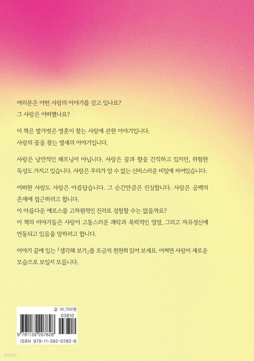사랑이 이 공백을 수식하며 채워 줄 수 있을까? 사랑으로 잃어버린 존재의 한 모금을 마셔 볼 수 있을까? 인간은 비록 주체로서의 자기 삶을 살지 못하지만 우리는 사랑을 욕망하면서 살아가야 한다. 그 욕망은 불을 쫓는 불나비처럼 죽음을 충동한다. 우리가 진정 욕망하는 것은 그러나 결코 채울 수 없는 저 너머의 환상이다. 사랑은 신기루처럼 멀고 세이렌처럼 위험하다. - 머리말 전문 |