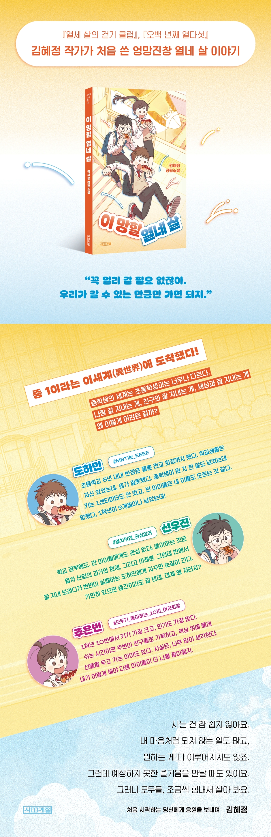 주인공 도하민은 초등학교 6년 내내 학급 회장을 맡았고, 6학년 때는 전교 회장이었다. 졸업과 동시에 이사를 하면서 새로운 동네에서 중학교에 입학하게 되었는데 하민이는 그리 걱정하지 않았다. 친구 사귀기도, 학교생활도 늘 자신있었으니까. 그런데 첫날부터 뭔가 잘못되었다. 입학식에 부모님이 오신 것도, 꽃다발을 받은 것도 하민이뿐이었다. 중학교는 입학 첫날부터 6교시까지 수업을 했으며, 수업마다 선생님이 바뀌었다. 학원까지 마치고 집에 오면 가방을 벗을 힘도 없다. 과목도 많고 아이들도 많고 학원도 많다. 중학생이 되고 나니 다 많아지고 다 늘어났다. 중학교는 초등학교와 완전히 다른 세계였다! 이세계를 꿈꾸지 말았어야 했다. 더구나 지금 도착한 이세계는 판타지가 아닌 현실이다. 그러니까 나는 영영 이곳에 도착하기 전으로 돌아갈 수 없다는 뜻이다. 한마디로, 망했다. (7쪽) 중학교라는 이세계(異世界). 하민은 웹소설이나 웹툰에서 마주하던 흥미로운 세계관이 현실에 펼쳐진 기분이다. 그런데 처음부터 다시 시작할 수도 없고 전으로 돌아갈 수도 없다. 김혜정 작가는 청소년이라면 누구나 공감할 절묘한 비유로, 이제 막 중학교에 들어선 청소년들의 현실을 생생하게 그려 냈다. 하룻밤 자고 일어나면 한 살 더 먹는다든가, 하루가 지났는데 학년이 바뀐다든가 하는 일은 해마다 일어난다. 모든 어린이 청소년은 해마다 새로운 세상에서 새로운 관계를 만들어 내야 한다. 그 고충을 이렇게까지 속속들이 알아주다니! 새로운 교실 문 앞에서 심호흡을 해 본 십 대라면 누구나 하민이의 앞날을 지켜볼 수밖에 없다. “나는 내가 너무 별로다” 초등학교 때의 인기를 회복하려는 하민의 시도는 족족 실패한다. 회장 선거에 나가서 공약을 랩으로 발표했는데 아무도 웃어 주지 않았고, 축구 시합에서 활약해 자기를 증명하려 했지만 다른 아이들이 훨씬 더 축구를 잘했으며, 선생님과 아이들에게 가까워지려고 농담을 할 때마다 분위기가 차게 식었다. 아이들을 대신해서 반 대항 축구경기를 연습하게 해 달라고 나섰다가, 담임 선생님이 축구경기 출전 자체가 취소됐다. 같은 반 여자 회장인 주은빈 무리에게 밉보여 키가 작다고 놀림받기까지 한다. 아빠는 남들 신경 쓸 필요 없다는 뻔한 말만 한다. 호빗이라고 놀림받는 중학교 1학년의 귀에는, 정말 말도 안 되는 소리다. 방학이 된다고 뭐가 크게 달라질까. 내가 나라는 건 변함이 없는데. 방학에도 나는 그대로 나일 텐데. 내가 나를 좋아할 수 없는 것보다 더 끔찍한 일이 있을까. 나는 내가 너무 별로다. (92쪽) 청소년들에게 가장 큰 고민이 뭐냐고 물으면 늘 1위를 차지하는 대답이 바로 ‘관계’다. 청소년은 하루의 대부분을 또래들과 학교에서 보내고, 또래들과의 관계 속에서 자기 자신을 확인하기 때문이다. 관계에 실패할수록 학교에서 나의 존재가 희미해질수록, 자기 자신을 싫어하게 되는 하민이의 모습은 그러한 십 대들의 마음을 고스란히 담아냈다. 그럼에도 불구하고, 우리를 구하는 것은 옆자리에서 늘 두꺼운 기차 책만 들여다보고, 사람에는 영 관심 없어 보이던 선우진이 하민이에게 불쑥 고백한다. 하민이가 주은빈 무리에게 괴롭힘을 당하게 된 ‘엉뚱한 오해’는 자기 때문에 생겼다고. 그러나 하민은 선우진을 원망하지 않는다. 잘못한 건 괴롭히는 아이들이지, 선우진이 아니니까. 그 일을 계기로 선우진과 하민이는 점점 가까워지고, 학교에서 유일하게 이야기를 나누는 상대가 된다. 그리고 하민이도 의식하지 못하는 사이 교실은 점점 견딜 만한 곳이 되어 간다. 거기에 하루아침에 ‘거짓말쟁이’로 몰려 친구들과 멀어진 주은빈이 합류하면서, 절대 친해질 수 없을 것만 같던 세 사람의 이상한 동행이 시작된다. 수행 평가 과제 때문에 일요일마다 공원에서 만나 쓰레기를 주우며, 세 사람은 본의 아니게 서로에 대해 알게 된다. 선우진은 초등학교 때 괴롭힘을 당한 적이 있고, 하민이는 선우진을 진짜 친구로 생각하며, 주은빈은 거짓말을 하지 않았다는 것. 하민이는 자신이 겪은 일, 선우진과 주은빈이 겪은 일을 곱씹어 보고 자기 자신을 돌아본다. 언젠가 아빠가 들려준 조언도 떠오른다. “너는 네 주인이야. 너만 너의 주인이야.”라던. 그렇다면 시작은 나 자신이어야 하지 않을까? 문득 사람이 사람을 대하는 것도 비슷하다는 생각이 들었다. 누군가 한 사람을 함부로 대하면 다른 사람들도 그 사람을 함부로 대해도 된다고 여긴다. 잘 알지도 못하면서 오해하고 미워하고 싫어한다. 때론 그 구멍의 시작이 자신일 수도 있다. 내가 나를 막 대하면 다른 사람도 용케 그걸 알고 나를 막 대할지도 모른다. (147-148쪽) “꼭 멀리 갈 필요 없잖아. 우리가 갈 수 있는 만큼만 가면 되지.” 선우진과 도하민, 주은빈의 관계가 한층 깊어지는 계기는 세 사람만의 ‘짧은 여행’이다. 성적 때문에 우울해하는 선우진을 북돋우기 위해, 세 사람은 KTX를 타기로 한다. 서울역까지는 기차로 한 정거장, 17분이 걸렸다. 그나마 학원 시간 때문에 밖으로 나가지도 못하고, 기차역 상점에서 핫도그만 하나 산 채 부랴부랴 돌아오는 기차를 