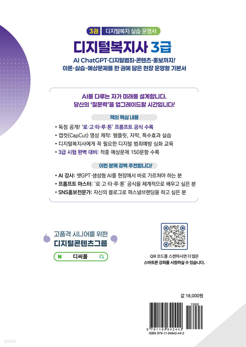 디지털복지사의 실천력을 높이는 맞춤형 안내서 『디지털복지사 3급 3권』은 빠르게 변화하는 디지털 환경 속에서 생성형 인공지능(AI)과 다양한 디지털 도구들을 복지 현장에서 어떻게 활용할 수 있는지를 체계적으로 안내하는 실천형 교재입니다. 1권의 이론, 2권의 실습을 기반으로, 3권에서는 AI와 콘텐츠 제작 도구들을 활용하여 디지털복지사의 실전 적용 능력을 강화합니다. 책은 ‘AI 쉽게 이해하기’를 시작으로, 블로그 글쓰기와 편집, ChatGPT를 활용한 질문 전략과 요약, 이미지·영상 생성, 챗봇 설계 등 현장에서 바로 사용할 수 있는 다양한 실습으로 구성되어 있습니다. 또한 각 영역별 문제풀이를 통해 학습 내용을 점검하고, 실제 활용 능력을 확장할 수 있도록 돕습니다. 특히 이 책은 디지털 기술을 단순히 배우는 수준을 넘어, 복지 대상자에게 직접 안내하고 활용할 수 있는 수준의 역량을 키우는 데 중점을 둡니다. 디지털복지사가 AI 시대에 필요한 기술과 태도를 균형 있게 갖출 수 있도록 설계된 현장 밀착형 콘텐츠입니다. 생성형 AI와 디지털복지의 만남, 실천과 융합을 이끄는 디지털복지사 교육서 『디지털복지사 3급 3권』은 생성형 AI(ChatGPT 등)와 다양한 디지털 콘텐츠 도구를 복지 실천에 접목함으로써, 디지털복지사가 실제 현장에서 바로 활용할 수 있는 기술과 적용 능력을 체계적으로 높이는 실전형 교육서입니다. 이 책은 기술에 대한 막연한 두려움을 줄이고, 디지털을 통해 사람을 도울 수 있다는 자신감을 심어주는 데 중점을 둡니다. 책의 구성은 ‘AI란 무엇인가’라는 기초 이해부터 시작하여, ChatGPT를 활용한 질문 작성법, 요약·번역 기능 활용, 블로그 글쓰기와 편집, 챗봇 설계, AI 기반 이미지 및 영상 생성까지 폭넓게 다루고 있습니다. 실습은 복잡한 용어를 최소화하고, 시니어와 초보자도 따라 할 수 있도록 단계별 안내와 시각 자료로 구성되어 있어, 교육자나 실무자가 현장에서 바로 적용하기에 매우 유용합니다. 이 책의 핵심 가치는 ‘단순한 기술 습득’이 아닌, 디지털복지사로서 타인을 지원하고 안내할 수 있는 실천력과 응용력을 함께 키울 수 있다는 점에 있습니다. 실습 과정을 통해 학습자는 단순히 기능을 배우는 것이 아니라, 기술을 통해 어떻게 사람을 도울 수 있을지에 대한 관점과 태도를 함께 배우게 됩니다. 또한 책 후반부에는 AI와 관련된 실제 응용 문제들이 포함되어 있어, 학습 내용을 되짚고 자신의 이해 수준을 점검할 수 있습니다. 문제는 단순 지식이 아닌 사례 기반의 사고력과 적용 능력을 평가하도록 설계되어, 디지털복지사 자격시험을 준비하는 학습자뿐만 아니라, 실제 업무를 수행하는 실무자에게도 매우 실용적인 학습 자료가 됩니다. 『디지털복지사 3급 3권』은 AI 시대에 디지털 기술을 활용하되, 항상 사람을 중심에 두는 복지 실천 철학을 바탕에 두고 있습니다. 이 책은 단순한 도구 사용법을 넘어, 디지털복지사가 왜 필요한지, 어떻게 변화하는 사회에 기여할 수 있을지를 보여주는 교육서이자 실천 지침서입니다. 복지기관, 평생학습관, 디지털배움터, 교육청 주관 디지털 역량교육 등에서 실습 교재로 활용되며, 교사, 강사, 현장 실무자 모두에게 실질적인 도움을 주는 구성으로 설계되었습니다. 기술과 복지의 연결점을 찾고자 하는 모든 이들에게, 이 책은 현장과 교육을 이어주는 가교가 되어줄 것입니다. |