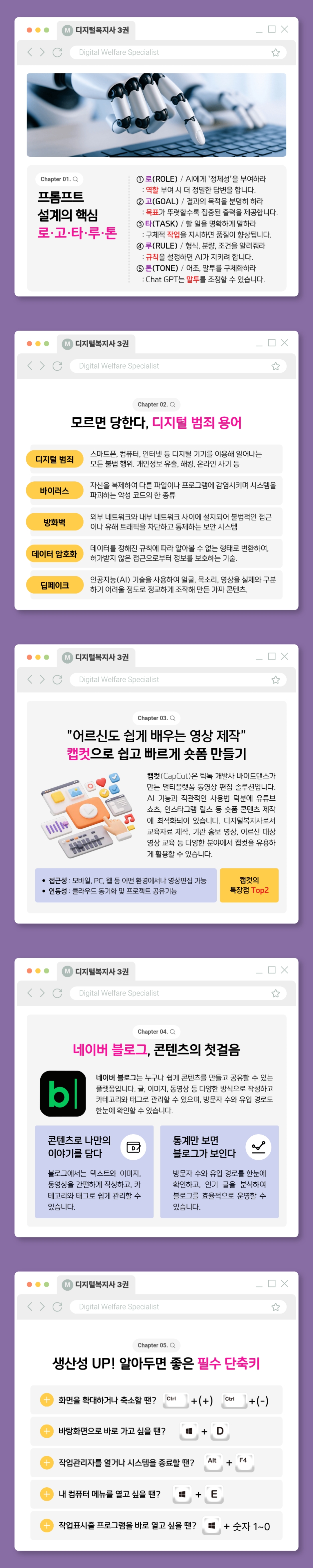 서문: 디지털 시대, 삶의 만족도를 높이는 새로운 복지 패러다임 AI 제대로 활용하기 (ChatGPT) 1. AI 쉽게 이해하기 2. AI 장점과 단점 / 유료 무료 차이 3. AI 챗GPT 고급음성 시작하기 - 주요 기능 - ChatGPT 활용 로고타루톤 AI 챗GPT를 제대로 활용하는 프롬프트 작성법 - 프롬프트란 무엇인가? - 프롬프트는 왜 중요한가? - 효과적인 프롬프트의 핵심 원칙 (실전 적용 중심) - 실전 프롬프트 작성 5단계 체크리스트 - 예시 프롬프트 비교 - AI 시대, 프롬프트는 ‘질문력’이다 - 로·고·타·루·톤 구조로 쉽게 배우는 챗GPT 명령어 전략 - 핵심은 ‘로·고·타·루·톤’ 구조 - 과학적으로 검증된 기법과 ‘로고타루톤’의 결합 - 프롬프트 완성 예시 - 실전 프롬프트 예시 ① ② ③ 디지털 범죄 예방과 안전 - 디지털 범죄의 개념 - 디지털 범죄 유형 - 디지털 범죄 용어 - 디지털 범죄 예방 관련 사이트 캡컷(CapCut) 활용 실무 스마트폰 하나로 끝내는 영상편집 - 캡컷의 특장점 - 캡컷앱 설치 및 로그인 - 미디어(영상, 사진) 가져오기 - 캡컷(CapCut) 편집 화면 인터페이스 - 캡컷(CapCut) 홈 화면 - 편집(분할,삭제) - 화면 비율, 배경 변경 - 텍스트 추가 - 텍스트 편집효과 - 장면전환(Transitions) 효과 - 오디오: 배경음악 넣기 - 템플릿으로 영상 만들기 디지털복지사가 꼭 알아야 할 컴퓨터 활용 마우스 포인터 원형커서 만들기 _ 윈도우11 - 크롬 브라우저 [홈 버튼 및 북마크바] 활성화하기 - 크롬 브라우저 [검색엔진 및 시작 페이지] 설정하기 - 크롬 브라우저 [다운로드 폴더] 위치 변경하기 - 크롬 브라우저 [열린 탭, 최근에 닫은 탭] 보기 - 크롬 브라우저 [설정 초기화] - 광고없이 유튜브 보기_크롬 확장 프로그램 설치 - LiveWiki_크롬 확장 프로그램 설치 - LiveWiki_웹사이트 사용법 네이버 블로그 홈 화면 편집 - 네이버 블로그 글쓰기 - 네이버 클립 만들기 - 네이버 블로그 통계 일반인들이 가장 궁금해 하는 저작권 FAQ 컴퓨터 단축키 활용하기 1. PC 폴더 복사하기 / 붙여넣기 2. 내 컴퓨터 열기 3. 화면 확대, 축소, 기본값 4. 노트북 바탕 화면 바로가기 5. 작업표시줄 프로그램 바로열기 6. 작업관리자 또는 시스템 종료 멀티미디어 삽입 및 프레젠테이션 발표 준비하기 1. 오디오 파일 편집과 배경 음악 설정하기 2. 비디오 삽입과 편집하기 3. 다중 화면 사용하기 4. PPT 슬라이드 쇼 녹화 하기 5. 비디오 파일 만들기 가장 유용한 10가지 파워포인트 단축키 활용하기 1. 글자 크기 늘이기 / 글자 크기 줄이기 2. 글자 효과 단축키 3. 글자 정렬 4. 일정한 간격으로 도형을 복제하는 Ctrl + D 5. 그룹화하기 / 그룹해제 6. 서식복사 / 서식붙여넣기 7. 마지막 작업을 반복해 주는 F4 8. 마지막 작업을 반복해 주는 단축키 9. 슬라이드 쇼 보기 / 현재 슬라이드 쇼 보기 10. 저장하기 / 다른 이름으로 저장하기 화면 녹화 프로그램 활용하기 (오캠) 문제풀이 150 |