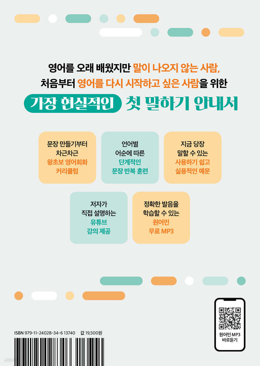 ‘영어의 기초 뼈대’ 세우는 방법 (1) 그날 배워야 하는 영어의 기초 뼈대를 배워 봅니다. 선생님이 직접 강의하듯 친절하고 알기 쉬운 설명으로 영어의 기초를 차근차근 익혀 보세요. (2) 앞에서 배운 내용을 토대로 실제 영어 문장을 익혀 봅니다. 영어는 어순이 중요하기 때문에 영어 어순에 따른 해석으로 함께 외워 보세요. 필요한 어휘는 별도로 실었습니다. (3) 영어의 어순에 따른 우리말 문장을 보면서, 바로 영어로 말할 수 있게 연습해 보세요. 빈칸에 써 보고 MP3도 들으면서 문장을 반복해서 익혀 봅니다. (4) 이제는 완전한 우리말 문장을 보면서 영어 문장을 정확하게 말할 수 있는지 직접 써 보세요. 우리말 문장을 보자마자 즉시 영어 문장이 나올 수 있을 때까지 연습하세요. (5) 유튜브 채널 ‘본즈 영어’에서 저자의 무료 강의를 들어 보세요. 책을 학습하고 영어를 말하는 것이 더욱 쉬워집니다. |