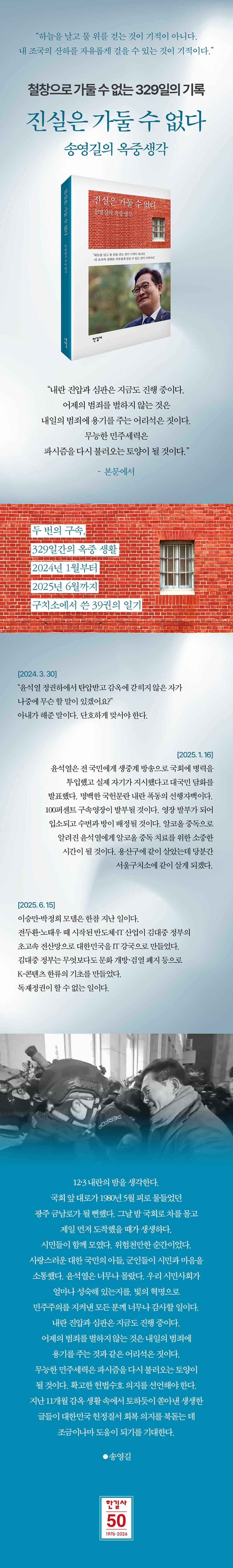 아내가 해준 말이다. 단호하게 맞서야 한다. 그래서 윤석열 검찰 범죄정권 타도를 다짐하는 『선전포고』라는 책도 썼던 것 아닌가. 예수님의 삶을 생각해본다. --- p.38 2022년 3월 9일은 대통령 선거 개표 전 출구조사가 발표되는 날이었다. 방송사마다 예측이 엇갈렸다. 이재명 후보 승리라는 출구조사 결과가 모 방송에서 발표되었다. 너무나 흥분되고 기뻤다. 기쁨을 옆에 있는 추미애 전 대표와 나누었다. 이낙연 전 대표를 보았다. 짧은 순간이었지만 나라가 무너진 듯한 당혹스러운 눈빛이었다. 나는 너무 당황했다. [2024. 3. 30] --- p.125 윤석열 대통령은 바뀌지 않는다. 박근혜 대통령의 길을 가고 있다. 김건희 여사를 단절하고 홀로 설 수 없다. 당부터 변화해야 한다. 충격이 필요하다. 윤상현 의원이 문화혁명의 예처럼 사령부를 폭격해야 한다고 말하는 인터뷰를 보았다. 지금이 바로 그때다. 그래야 합리적 보수주의의 공간이 열린다. [2024. 5. 23] --- p.148 윤석열은 전 국민에게 생중계 방송으로 국회에 병력을 투입했고 실제 자기가 지시했다고 대국민 담화를 발표했다. 명백한 국헌문란 내란 폭동의 선행자백이다. 100퍼센트 구속영장이 발부될 것이다. 영장 발부가 되어 입소되고 수번과 방이 배정될 것이다. 알코올 중독으로 알려진 윤석열에게 알코올 중독 치료를 위한 소중한 시간이 될 것이다. 용산구에 같이 살았는데 당분간 서울구치소에 같이 살게 되겠다. [2025. 1. 16] --- p.167 한·미·일 세 나라는 해상·공중 다영역 연합훈련 ‘프리덤 에지’(Freedom Edge)를 실시했다. 이로써 국가안보가 강화되는 것인가? 일본과 미국의 군사안보는 강화될지 모르지만 한반도의 군사적 긴장은 고조되어 제2의 청일전쟁, 러일전쟁 전야로 몰고 가는 것 아닌가? 북한을 상대하는 데 필요한 한미동맹을 왜 러시아와 중국을 상대로 한 군사동맹으로 발전시키려고 발버둥치는가? [2025. 2. 10] --- p.199 이제 거짓말 잔치가 끝나간다. 헌법재판소 탄핵 변론이 종결되었다. 3월 중 8 대 0으로 탄핵 인용, 파면 결정이 내려질 것이라 생각한다. 윤석열이 서울구치소에 있으면서도 경호차량의 호위를 받으며 요란하게 헌재를 다니던 일도 끝이 났다. 하루속히 파면 결정이 나야 서울구치소 교도관들과 수용자들의 불편도 해소될 것이다. [2025. 2. 28] --- p.242 검찰총장 출신 윤석열 내란수괴가 헌법재판소에 만장일치로 탄핵 결정된 날, 단 한 명의 검사도 개탄과 반성의 메시지가 없었다. 자신들의 이권에 대한 비판이 들어오면 이프로스 게시판에 너도나도 한마디씩 하던 2,500여 검사님, 나부터 탄핵하라고 외치던 용감한(?) 검사님들 다 어디 가셨나? [2025. 4. 27] --- p.304 대한민국은 더 이상 개도국이 아니라 선진국이다. 후발자 이익이 상실되었다. 이승만·박정희 모델은 한참 지난 일이다. 전두환·노태우 때 시작된 반도체·IT 산업이 김대중 정부의 초고속 전산망으로 대한민국을 IT 강국으로 만들었다. 김대중 정부는 무엇보다도 문화 개방·검열 폐지 등으로 K-콘텐츠 한류의 기초를 만들었다. 독재정권이 할 수 없는 일이다. [2025. 6. 15] --- p.378 |