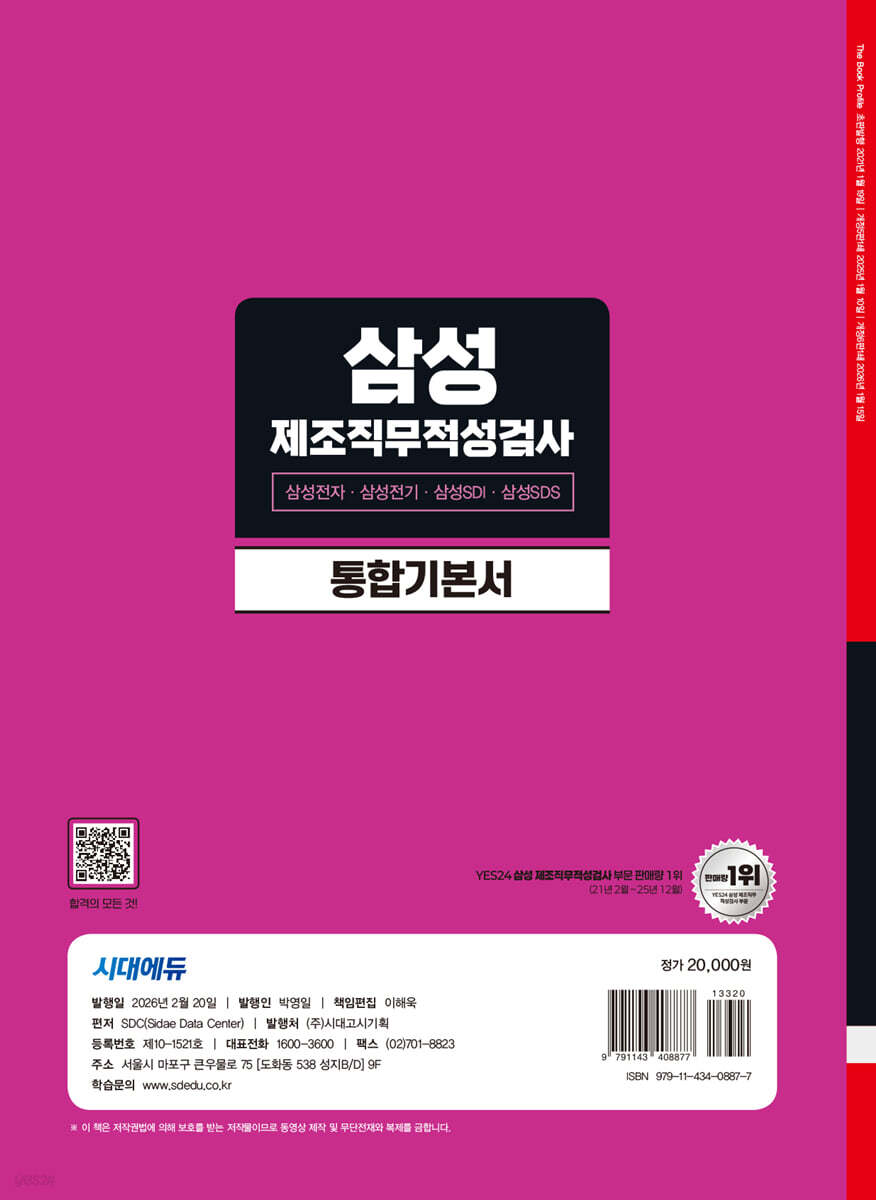 최신 출제경향을 알 수 있도록 2024~2025년 SK, 포스코, 현대자동차 등 2개년 주요기업 생산직 기출복원문제를 분석 및 복원하여 수록하였다. 또한 영역별 핵심이론 및 대표유형, 적중예상문제 구성을 통해 보다 체계적인 학습이 될 수 있도록 하였다. 최종점검 모의고사 2회분과 온라인 모의고사 2회분을 제공하여 최종적으로 실전처럼 연습할 수 있도록 하였다. 마지막으로, 인성검사와 면접 이론 및 실제 면접 기출 질문을 수록하여 최종 관문까지 대비할 수 있도록 하였다. 본서의 구성이 삼성그룹 제조직을 준비하는 모든 수험생들에게 좋은 길잡이가 되기를 바란다. |