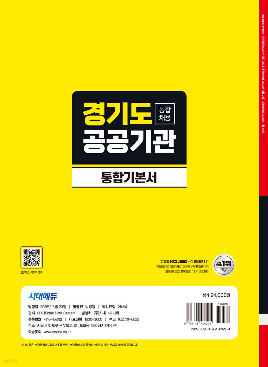 2026년 경기도 공공기관 통합채용 합격을 위해 시대에듀에서는 『2026 최신판 시대에듀 경기도 공공기관 통합채용 통합기본서』를 출간하였다. 2026년 경기도 공공기관 통합채용에 대비하기 위한 기본서이다. 2025년 경기도 공공기관 통합채용 NCS 기출복원문제 및 2025년 주요 공기업 NCS 기출복원문제를 수록하여 경기도 공공기관 통합채용의 최신 출제경향과 공기업별 필기전형의 전반적인 유형과 경향을 파악할 수 있도록 하였으며, 직업기초능력평가 대표기출유형 및기출응용문제를 수록하여 체계적으로 필기시험에 대비할 수 있도록 하였다. 또한 철저한 분석을 바탕으로 구성한 최종점검 모의고사 2회분과 온라인 모의고사 3회분을 제공하여 자신의 실력을 점검할 수 있도록 하였다. 끝으로 채용 가이드와 경기도 공공기관 통합채용 면접 기출질문을 수록하여 채용 전반에 대비하는 데 부족함이 없도록 하였다. |