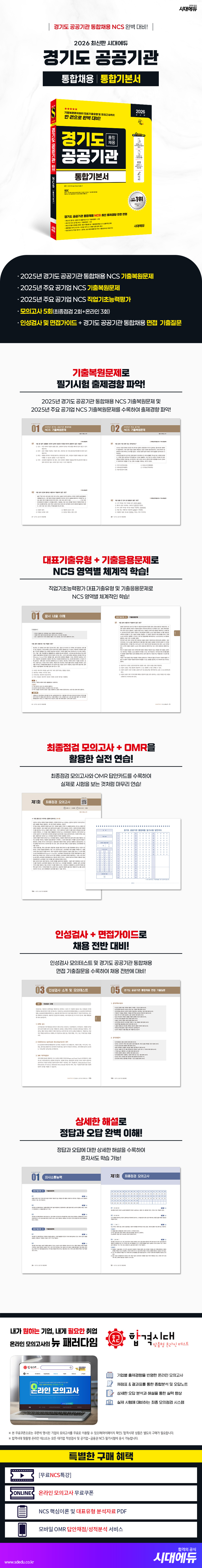 경기도 공공기관은 2026년에 신입사원을 통합채용할 예정이다. 경기도 공공기관의 채용절차는「원서접수→필기시험→서류전형→면접시험→최종합격자 발표→임용」순서로 이루어진다. 필기시험은 인성검사와 직업기초능력평가로 진행되며, 그중 직업기초능력평가는 의사소통능력, 수리능력, 문제해결능력, 자원관리능력, 조직이해능력 총 5개의 영역을 평가한다. 또한, 기관마다 지원자격 및 필기시험 합격자 선정기준이 상이하므로 반드시 지원하고자 하는 공공기관의 확정된 채용공고를 꼼꼼하게 확인하여야 한다.