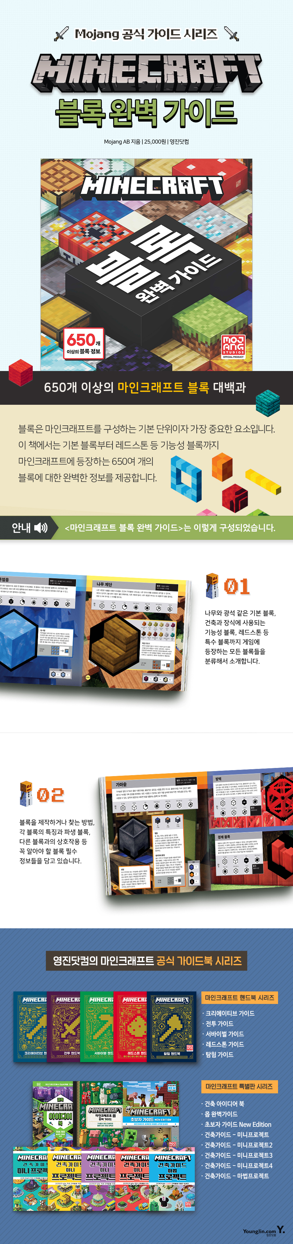 블록은 마인크래프트를 구성하는 기본 단위이자 가장 중요한 핵심 요소입니다. 이 책에서는 나무와 광석 같은 기본 블록부터 건축과 장식에 사용되는 기능성 블록과 레드스톤 등 특수 블록까지 마인크래프트에 등장하는 650여 종의 주요 블록에 대한 완벽한 정보를 제공합니다. 월드 블록, 식물 기반 블록, 건축 및 장식 블록, 기능성 블록, 레드스톤, 특수 기능 블록 등 6개 계열로 나누어 각 블록의 기본 정보와 주의해야 할 점, 제작하거나 찾는 방법, 파생 블록 및 다른 블록과의 상호작용 등 게임에서 꼭 알아야 할 심층적인 블록 정보들을 수록했습니다. 또한 투명도 및 경도, 가연성, 재생 및 획득 용이성 등 블록의 특성을 이미지로 알기 쉽게 표현하고, 잘 알려지지 않은 흥미로운 사실과 각 블록을 활용하는 방법에 대한 전문가의 깊이 있는 조언까지 모두 담겨 있습니다. 여기서 얻은 블록 정보들을 통해 여러분의 마인크래프트 경험을 한 단계 업그레이드하고, 자신만의 창의력을 마음껏 발휘해 보세요. |