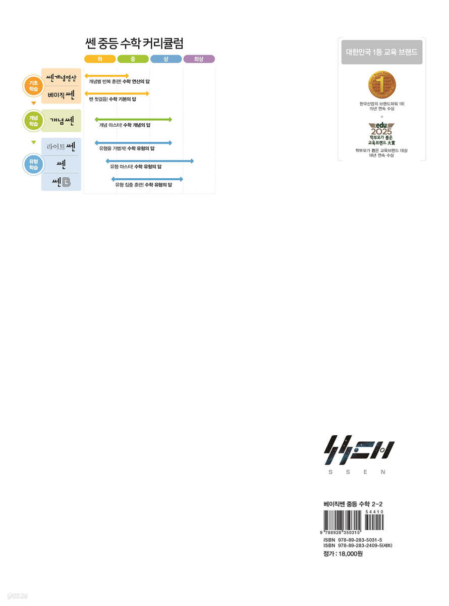 2. 쉬운 개념 학습+기본 문제 반복 훈련 3. 기본&핵심 유형 집중 훈련 4. 꼭! 나오는 학교 시험 기출문제로 실전 감각 UP! 〈베이직쎈〉은 쉽고, 체계적으로 수학 기본기를 강화할 수 있는 수학 기본기 강화 훈련서입니다. 개념 학습과 기본 문제 반복 훈련, 기본&핵심 유형 집중 훈련을 통해 기본기를 다지고, 완성할 수 있도록 하였습니다. 수학 기본기 강화 훈련서 〈베이직쎈〉과 함께 슬기로운 수학 생활을 하시길 바랍니다. |