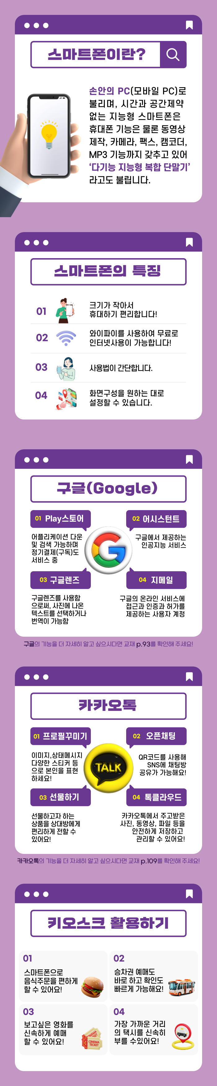 · 4차 산업혁명 시대 스마트폰 활용을 제대로 배우고 익혀야 하는 이유 · 스마트폰 개요 · 스마트폰 운영체제, 제조사, 통신사, 디바이스 정보 알아보기 · 스마트폰 화면 및 전원 켜고 끄기 · 스마트폰 주요 버튼과 아이콘 모양 이해하기 · 스마트폰 각 부분의 명칭 알아보기 · 스마트폰 조작 방법 알아보기 · 스마트폰 화면 구성 (잠금화면, 홈 화면, 앱스화면) · 상태 알림줄 - 아이콘 설명 · 알림창 및 빠른 설정창 살펴보기 · 소리/진동/무음 바꾸기 · 화면 자동 꺼짐 시간 조절하기 · WI-FI(와이파이)로 네트워크 연결하기 · 모바일 데이터 사용 및 차단하기 · 화면 글자 크기 조절하기 · 저장공간 확인 및 확보하기 · 최근 실행 앱 확인하기 · 디바이스 케어로 스마트폰 최적화하기 - 스마트폰 기기 최적화하기 - 홈 화면에 디바이스 케어 위젯 추가하기 · 연락처 활용 - 연락처 추가 및 즐겨찾기 사용하기 - 최근 기록 사용하기 - 그룹 추가하기 · 화면 페이지 편집 - 홈페이지 추가 및 삭제 - 홈 화면 순서변경 및 홈페이지 변경 · 폴더 관리하기 - 폴더 만들기 · 위젯(Widget) 활용하기 - 다이렉트 전화걸기 및 돋보기 스마트폰 기본 앱 활용 · 시계 앱 활용하기(알람) · 문자메시지 - 음성녹음하고 저장된 음성파일 확인하기 - 빠른음성 문자 보내기 (빠른음성 바로가기가 없을 때) - 말로 문자 보내기 (삼성 ONEUI 5.1버전) - 말로 문자 보내기 (삼성 ONEUI 6.1버전) · 카메라 설정법 - 카메라 빠른 실행 · 카메라 앱의 촬영모드별 옵션 · 포토에디터 사용법 · 스냅시드 · 갤러리에서 사진 및 동영상 확인하고 앨범 만들기 · 갤러리에서 앨범 만들기 · 갤러리에서 사진 편집하기 · 휴지통 · 즐겨찾기 기능 · 지메일 계정 설정하기 · 구글 Play 스토어 활용하기 · 구글 어시스턴트 활용하기 · 구글 어시스턴트 뉴스 듣기 · 구글 렌즈 제대로 활용하기 카카오톡 활용 - 카카오톡 친구탭 설정하기 - 내 프로필 편집하기 - 친구 목록 관리하기 - 전체 설정 메뉴 살펴보기 - 채팅탭 메뉴 살펴보기 - 채팅방 폴더 만들기 - 새로운 채팅 시작하기 - 팀채팅 만들기 - 비밀채팅 - 채팅방 설정 - 지금탭 알아보기 - 그룹채팅방 만들기 - 오픈프로필 만들기 - 1:1 보이스톡하기 - 보이스톡 내용 확인하기 - 그룹 보이스톡하기 - 1:1 페이스톡(영상통화) 하기 - 그룹 페이스톡(그룹영상통화) 하기 - 채팅방에서 음성메시지 보내기 - 맞춤법 교정하기 - 자동 문자 번역하기 - 채팅방 메시지 수정 및 삭제하기 - 중요내용 책갈피 설정하기 - 채팅방에서 이모티콘 전송하기 - 채팅방에서 사진 및 동영상 전송하기 - 주고 받은 사진 및 동영상 저장하기 및 확인하기 - 저장공간 확보하기 - 채팅방 나가기 - 위치 보내기 - 송금하기 - 결제하기 - 톡클라우드 - 쇼핑(선물하기) 유튜브 및 동영상 편집 · 유튜브 앱 제대로 활용하기 - 유튜브 광고 차단 - 시크릿 모드 사용하기 - 계정 전환과 유튜브 설정 · 광고 없이 유튜브 재생하기 - 브레이브 브라우저 · 네이버 앱 제대로 활용하기 · 네이버 MYBOX 앱 제대로 활용하기 · 멋진 카드뉴스 만들기 - 글그램 - 글씨팡팡 · 스마트폰에서 음악 및 동영상 다운받기 - 스텔라브라우저 · 나만의 감동 영상 편지 만들기 - 슬라이드 메시지 · 나만의 인생 영화 만들기 - 쉽게 따라 할 수 있는 영상편집 앱 - 캡컷(CapCut) · 이미지 합성 어플 활용하기 - 포토퍼니아 · 사진작가들이 가장 많이 사용하는 카메라 앱 - 피크닉 (풍경 사진에 최적화 된 앱) 키오스크 및 기타 유용한 앱 1. 버거킹 주문하기 2. 코레일 예매하기 3. 영화예매(CGV-비회원 예매) 4. 휴일날 병원이나 약국 찾기(응급의료정보제공) 5. 카카오택시 이용하기 6. 배달(배민 등) 앱 활용하기 7. 쇼핑(이마트, 네이버 앱 쇼핑) 8. 이마트몰 주문하기 9. QR-CODE 영상으로 볼 수 있는 키오스크 현장 - KTX 열차 예매 - KTX 예매 취소 - 무인 민원 발급기 - 베스킨라빈스 31 주문하기 - KFC 주문하기 - 맥도널드 주문하기 - 버거킹 주문하기 - EDIYA 음료 주문하기 - 농협 ATM 사용하기 - 무인 점포매장 이용하기 · 스마트폰, 요금제, 보험 선택하는 방법 · 유용한 앱 활용하기 - 스마트폰 하나면 노래방이 필요 없다(노래방 종결자) - LED전광판 - 꼭 알고 활용하면 좋은 유용한 앱 소개 · 어르신들이 꼭 알고 활용해야 할 디지털 범죄 예방 앱 - 세상에 이런일은 없다! - 디지털 범죄 - 모바일 범죄 예시 - 모바일 범죄 피해 예방 안전 수칙 · Ai 챗GPT 어렵지 않아요! - Ai란 무엇인가? - 스마트폰에서 ChatGPT 시작하기 - AI 추천사이트 · 유용한 사이트 소개 |