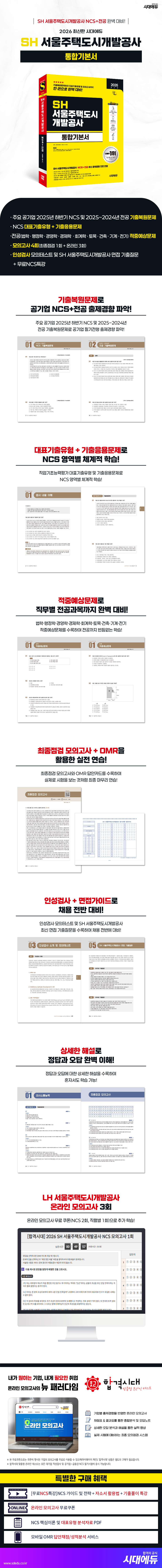 서울 시민의 주거 안정과 삶의 질 향상을 위해 헌신하는 SH 서울주택도시개발공사는 2026년에 신입사원을 채용할 예정이다. SH 서울주택도시개발공사의 채용절차는 「입사지원서 접수 → 서류전형 → 필기전형 → 면접전형 → 최종 합격자 발표」 순서로 이루어진다. 필기전형은 직업기초능력평가와 직무별 전공과목으로 진행한다. 그중 직업기초능력평가는 의사소통능력, 수리능력, 문제해결능력, 대인관계능력, 조직이해능력, 직업윤리 등의 총 6개 영역을 평가한다. 2025년에는 피듈형으로 출제되었으며, 전공과목은 직무별로 상이하므로 반드시 확정된 채용공고를 확인해야 한다. 또한 필기전형에서 고득점을 받기 위해 다양한 유형에 대한 폭넓은 학습과 문제풀이능력을 높이는 등 철저한 준비가 필요하다.SH 서울주택도시개발공사 합격을 위해 시대에듀에서는 채용을 대비하여 SH 서울주택도시개발공사 맞춤형 문제로 구성한 『2026 최신판 시대에듀 SH 서울주택도시개발공사 통합기본서』를 출간하였다. 상세한 해설로 혼자서도 학습이 가능하도록 하였으며, 온라인 모의고사를 무료로 응시할 수 있는 쿠폰을 제공하여 SH 서울주택도시개발공사 문제 유형에 대한 연습과 함께 자신의 실력을 점검할 수 있도록 하였다.