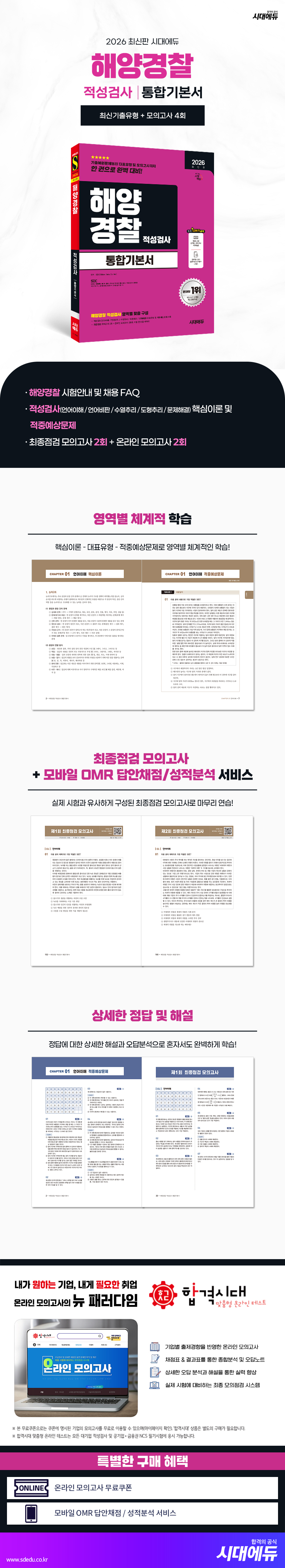 해양경찰 공무원 적성검사 대비를 위해 시대에듀는 『2026 최신판 시대에듀 해양경찰 적성검사 통합기본서』를 출간하였다.최신 출제경향을 반영한 PART 1 ‘핵심이론 - 대표유형 - 적중예상문제’ 구성을 통해 적성검사 영역을 체계적으로 학습할 수 있도록 하였다. PART 2 최종점검 모의고사 2회분과 더불어 OMR 답안지 및 모바일 OMR 답안채점/성적분석 서비스를 통해 실전같이 연습할 수 있도록 하였다. 또한 해양경찰 적성검사 온라인 모의고사 2회분을 제공하여 채용을 준비하는 데 부족함이 없도록 하였다.본서가 해양경찰 채용을 준비하는 모든 수험생들에게 좋은 길잡이가 되기를 바란다.