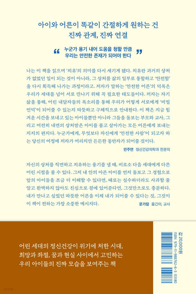 나는 이 책을 읽으며 ‘치유’의 의미를 다시 새기게 됐다. 치유란 과거의 상처가 없었던 일이 되는 것이 아니라, 그 상처를 삶의 일부로 통합하고 ‘안전함’을 다시 획득해 나가는 과정이라고. 저자가 말하는 ‘안전한 어른’의 덕목은 우리가 세대를 넘어 서로 만나기 위해 꼭 필요한 태도들이다. 저자는 자기 삶을 통해, 어린 내담자들의 목소리를 통해 우리가 어떻게 서로에게 ‘비빌 언덕’이 되어줄 수 있는지 따뜻하고 구체적으로 안내한다. 이 책은 지금 힘겨운 시간을 보내고 있는 아이들뿐만 아니라 그들을 돌보는 부모와 교사, 그리고 여전히 내면의 상처받은 아이를 품고 살아가는 모든 어른에게 보내는 지지의 편지다. 누군가에게, 무엇보다 자신에게 ‘안전한 사람’이 되고자 하는 당신의 여정에 저자가 여리지만 든든한 동반자가 되어줄 것이다. - 안주연 (정신건강의학과 전문의)