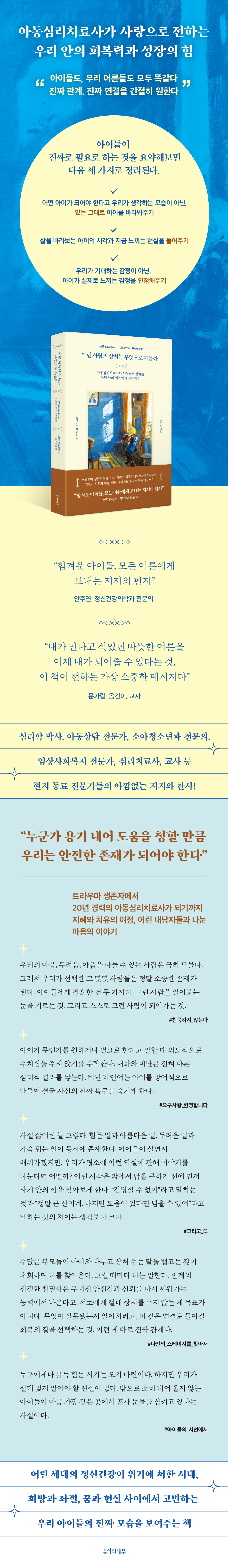 --- 「1장 〈문제를 오래 묻어두지 않기〉」 중에서 트라우마를 겪는 아이를 돕는 이들에게 하고 싶은 말은 아이가 마음을 열 수 있게 하는 방법을 찾아보라는 것이다. (…) 그리고 그만큼 중요한 것은 무엇을 하지 말아야 하는지 파악하는 일이다. --- 「7장 〈해리라는 내적 여행〉」 중에서 이 책을 쓰면서 하나만이라도 이루어졌으면 하는 소망이 있다. 어디선가 한 아이라도 진짜 들어줄 줄 아는 어른을 만났으면 좋겠다. 듣기 힘든 이야기여도 끝까지 들어주고 아이가 치유될 수 있도록 도와주는 그런 어른 말이다. (…) 마음이 시키는 대로 아이에게 다가가서 괜찮은지, 안전한지 물어봐주면 좋겠다. --- 「9장 〈나는 누군가에게 안전한 존재인가〉」 중에서 아이들의 애도 모임을 이끌면서 나 역시 내 이야기를 나누어야 할 때가 있다. 그럴 때마다 나는 아이들에게 도움이 되는 선에서 최대한 솔직해지려고 노력한다. “소중한 사람이 떠났을 때 무슨 감정을 느꼈나요?”라는 질문을 받으면 나는 늘 같은 대답을 한다. 안도감이었다고. (…) 나도 당연히 엄마가 살아 계시길 바랐지만, 엄마가 겪던 극심한 고통을 떠올리면서 이제 더는 그런 아픔에 시달리지 않는다는 사실에 안도하고 감사했다. 만약 떠난 사람과의 관계가 복잡했다면, 혹시라도 학대를 받았던 관계였다면 아이는 정말로 홀가분함이나 기쁨을 느낄 수도 있다. 우리 아이들은 이런 모든 감정이 괜찮다는 걸, 감정 자체에는 좋고 나쁨이 없다는 걸 반드시 알아야 한다. --- 「11장 〈아이의 애도를 돕기〉」 중에서 “엄마 아빠 일로 죄송해요. 이번 주에 선생님까지 끌어들였잖아요. 정말 죄송해요.” 나는 케일리의 눈을 바라보며 분명하게 말했다. “케일리, 잠깐만. 이건 네가 미안해할 일이 절대 아니야. 너도 부모님 싸움에 정말 지쳤지?” 아이가 놀란 듯 눈을 크게 뜨며 고개를 끄덕였다. “잘 들어. 이혼하는 가정에서 아이가 문제인 적은 한 번도 없었어. 정말이야. 지금 내가 겪는 어려움은 너 때문이 아니고, 너와 함께하는 상담에 대한 내 생각과도 아무 관계가 없어. 이건 네가 떠안을 몫이 아니야.” --- 「12장 〈아픔의 서사를 바꿔본다면〉」 중에서 아이를 도둑으로 의심했다가 나중에 자기가 둔 곳에서 물건을 찾았다면, 당연히 사과해야 한다. 아이와는 전혀 상관없는 일로 스트레스를 받다가 엉뚱하게 아이에게 화풀이했다면, 잘못을 인정하고 관계를 회복해야 한다. 지키지 못한 약속이 있다면, 솔직하게 잘못했다고 말해야 한다. (…) 나이가 어리다고 해서 부당한 대우를 받았을 때 존중받지 못할 이유는 없다. --- 「13장 〈어른에게도 필요한 내면 치유〉」 중에서 소셜 미디어 인플루언서들은 이를 이용해 교묘한 메시지를 끊임없이 보낸다. “난 너를 알아. 너를 이해해. 이걸 사면 우리와 같아질 거야.” 놀랍게도 이런 말에 아이들이 넘어간다. 세상에 존재감 없이 살고 싶은 사람은 없다. 아이들은 특히 어딘가에 속하고 싶은 마음이 크다. 우리가 “너의 진짜 모습을 난 알아”라고 많이 말할수록 아이들이 다른 사람의 시선으로 자신을 정의할 가능성은 줄어든다. --- 「16장 〈아이들이 어른에게 바라는 것〉」 중에서 |
