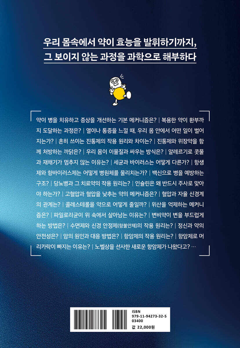 감수의 말 제1장 약이 효능을 발휘하기까지 과정 1 약이 효능을 발휘하려면? 2 눈에 보이지 않는 약의 ‘진짜 크기’ 3 복용한 약의 ‘여정’ 4 약효를 좌우하는 단백질 5 효소의 작용을 조절한다 6 정보를 전하는 ‘열쇠 구멍’ Column 지그재그, 이중선…? 구조식 보는 법 제2장 ‘발열’과 ‘통증’이 일어나는 이유 1 처방전 없이 살 수 있는 약과 처방전이 필요한 약 2 발열과 통증의 메커니즘 3 해열 진통제가 위장약과 함께 처방되는 이유는? 4 나노미터의 차이로 부작용을 막는다 5 진통제를 서로 비교하면? 6 메커니즘이 다른 ‘아세트아미노펜’ 7 절반은 ‘상냥함’으로 이루어져 있다? Column 임신 혹은 수유 중 약 복용 시 주의할 점 제3장 알레르기의 문을 닫다 1 침입한 이물질과 싸우는 세포들 2 콧물과 재채기가 멈추지 않는 이유 3 히스타민을 ‘차단’하라! 4 졸음을 덜 유발하는 약은 ‘물과 친하다’ Column 약을 함께 복용할 때 주의해야 할 조합 제4장 몸을 공격하는 세균·바이러스와의 싸움 1 세균과 바이러스, 닮은 듯 다른 존재 2 항생제의 작용 원리 3 내성균의 반격 : 세균은 어떻게 약을 무력화하는가? 4 바이러스를 겨냥하는 약, 어떻게 작동할까? 5 감염 전에 예방하기 Column 식전, 식후… 약을 복용하는 타이밍에 따라 무엇이 달라질까? 제5장 생활 습관병을 화학으로 푼다 1 당뇨병의 ‘당’은 포도당 2 당뇨병 치료제는 어떻게 작용할까? 3 고혈압이란 어떤 상태인가? 4 고혈압 치료제는 어떻게 작동할까? 5 콜레스테롤과 중성 지방을 조절하는 약 6 콜레스테롤과 중성 지방을 줄이는 네 가지 방법 Column 약에 영향을 미치는 음료 제6장 심오한 위장약의 세계 1 위산을 억제하는 메커니즘 2 위산 속에서도 살아남는 균을 처치한다 3 장을 달래는 법 4 변이 수분을 머금도록 하려면? Column 음식이 약에 미치는 영향 제7장 안전한 정신과 약은 어떻게 탄생했나 1 불면과 불안을 다스리는 오랜 약 2 벤조디아제핀 계열 약의 한계와 새로운 대안 3 수면 자체에 직접 작용하는 새로운 수면제 4 불안이 생기지 않도록 돕는 약 5 항우울제의 작용 원리 제8장 자기 몸에서 생겨난 세포와의 싸움 1 암의 ‘가속 페달’과 ‘브레이크’ 2 DNA 속을 들여다보면? 3 DNA를 표적으로 4 정확히 쏜다: 분자 표적 치료제의 원리 5 면역 관문 억제제 제9장 우리를 지켜야 할 면역이 병을 일으킬 때 1 자가 면역 질환이란? 2 그레이브스병 3 류머티스 관절염 마치며 참고문헌 |