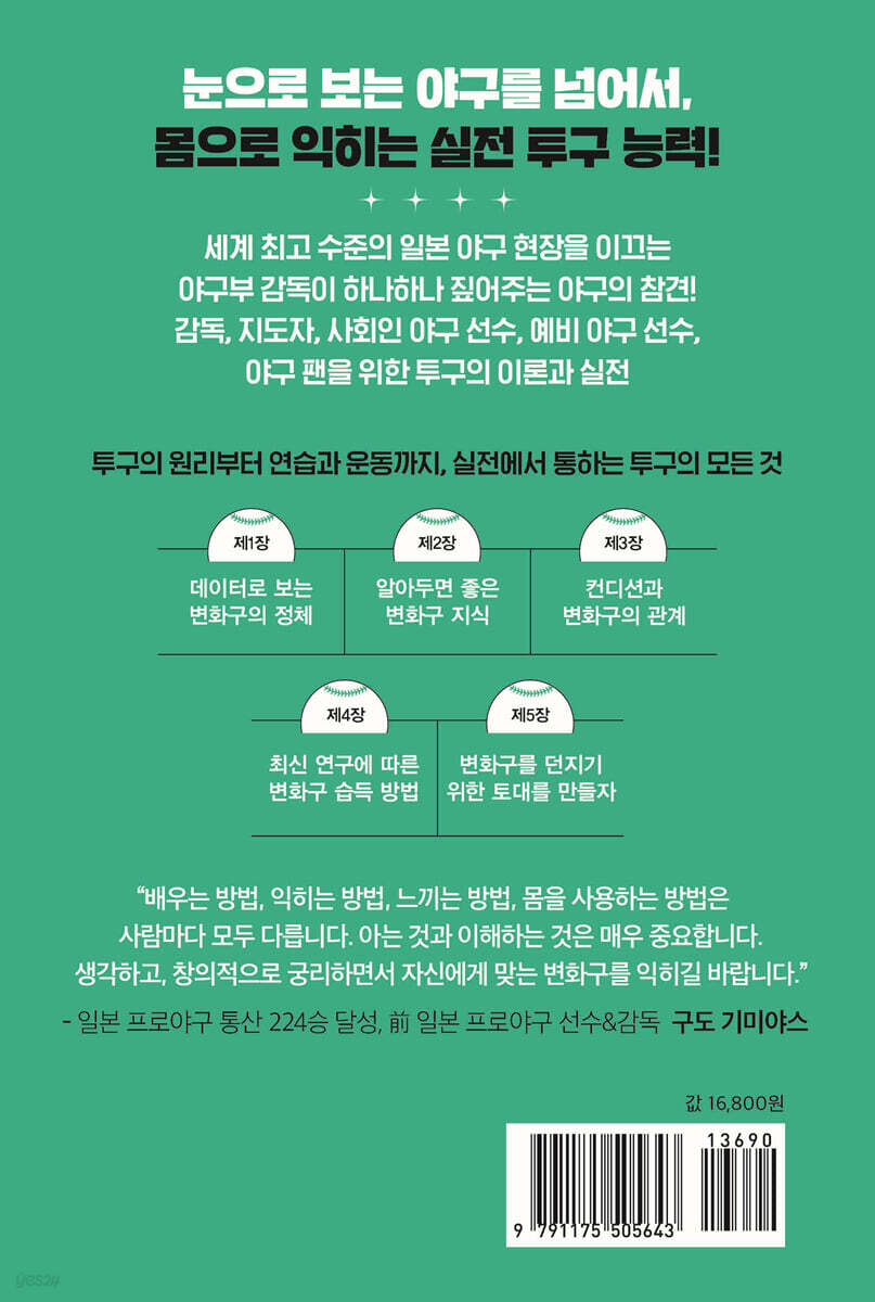 배우는 방법, 익히는 방법, 느끼는 방법, 몸을 사용하는 방법은 사람마다 모두 다릅니다. 아는 것과 이해하는 것은 매우 중요합니다. 생각하고, 창의적으로 궁리하면서 자신에게 맞는 변화구를 익히길 바랍니다. - 구도 기미야스 (일본 프로야구 통산 224승 달성, 前 일본 프로야구 선수&감독)