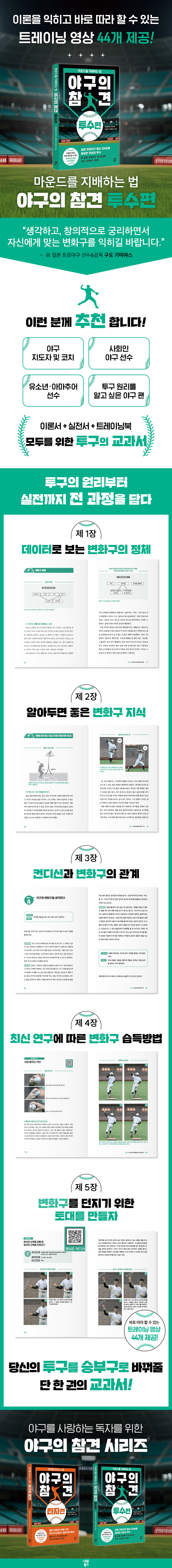 야구에서 투수는 모든 플레이의 출발점이자 경기의 흐름을 설계하는 핵심 포지션이다. 투구는 단순히 공을 던지는 행위가 아니라 구종과 코스의 선택, 체력과 흐름의 관리, 타자의 반응을 읽고 축적해 가는 반복된 판단의 과정이며, 이 선택들이 모여 한 경기를 만든다. 그럼에도 많은 투수들은 여전히 감각에 의존한다. 이 책은 투수라는 포지션의 의미와 투구의 본질을 구조와 원리로 풀어내며, 나만의 변화구를 찾는 방법을 제시한다. 여기에 현장에서 나온 시선과 경험을 담은 칼럼을 더해, 읽는 재미까지 놓치지 않았다. 데이터로 보는 변화구의 정체 이 책에서는 변화구를 직구까지 포함한 하나의 구종 체계로 정리하고, 각 구종을 데이터로 분석한다. 공의 속도, 회전수, 회전축 같은 숫자를 통해 ‘좋은 공’이 무엇인지 알아본다. 또한 변화구를 많이 던지는 것보다 자신에게 맞는 공을 찾고 관리하는 방법이 중요함을 강조한다. 구종 간의 관계, 볼 배합의 기본과 응용, 변화구가 점점 빨라진 이유까지 짚어주고, 컨디션이나 투구 상황에 따라 변화구의 질이 달라지는 점도 설명한다. 마지막으로 변화를 효과적으로 던지기 위해 필요한 몸 만들기와 관리 방법까지 다루고 있다. 최신 연구에 따른 변화구 습득과 반복 훈련 이 책에서는 실전에서 필요한 커브, 슬라이더, 커터, 포크, 스플리터, 체인지업 등 각 변화구를 단계적으로 익히는 방법을 소개한다. 처음 배우는 변화구부터 고속 변화구까지, 손가락 감각과 회전 느낌을 익히기 위한 구체적인 연습법을 제시한다. 이를 통해 투구의 이해를 돕는다. 전완, 어깨, 견갑골을 중심으로 한 기초 운동과 스트레칭, 케어 방법까지 투구의 전 과정을 체계적으로 다룬다. 44개의 영상으로 완성하는 실전 투구 트레이닝 이해를 더 돕기 위해 글과 그림 이외에도 44개의 트레이닝 영상이 QR코드를 통해 제공된다. 투구 동작의 핵심 구간을 눈으로 확인하며, 글로는 놓치기 쉬운 디테일까지 직관적으로 이해할 수 있다. 책과 영상을 함께 활용한다면 단순한 단순한 이론서를 넘어 자신만의 투구를 설계하고 관리할 수 있는 실전 지침서가 되어줄 것이다. 이 책은 이런 분들께 추천합니다 - 야구 지도자 및 코치 - 사회인 야구 선수 - 유소년·아마추어 선수 - 투구 원리를 이해하고 싶은 야구 팬 |
