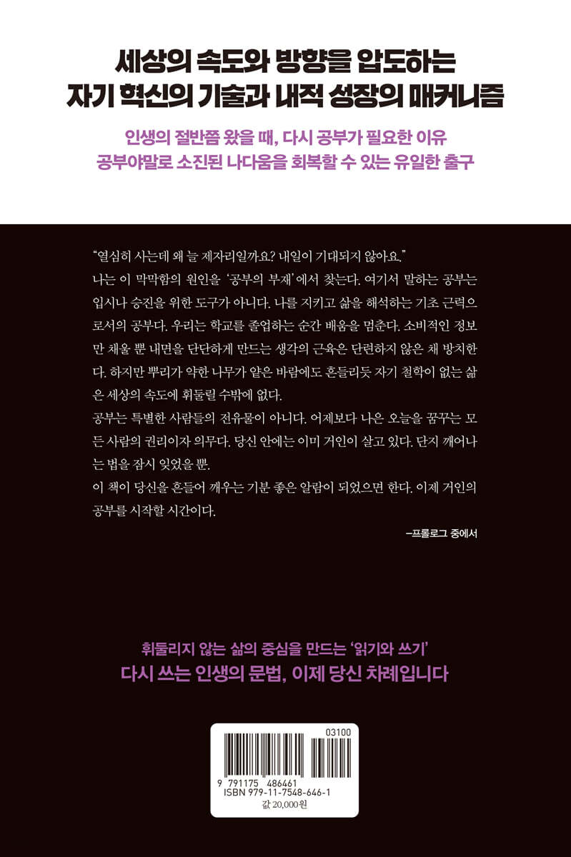 이것은 단순한 쾌락과도 구별된다. 쾌락이 감각의 소비라면 향유는 존재의 발견이다. 무언가를 깊이 음미하는 순간우리는 세상의 소음에서 벗어나 고유한 나와 마주한다. 이는 내가 무엇을 느낄 때 행복한지 내 가슴이 언제 뛰는지를 확인하는 과정이다. 그 충만한 순간에 우리는 어떠한 역할에만 매몰되지 않고 삶을 만끽하는 온전한 주인이 된다. --- 「제1장. 다시, 공부해야 하는 이유」 중에서 자기 수용은 ‘자기 긍정’과는 명확하게 구분해야 한다. 자신의 단점과 한계까지 모든 면을 평가 없이 받아들이는 것이 자기 수용의 본질인 반면, 자기 긍정은 자신의 강점과 성취를 긍정적으로 평가하는 태도다. 그래서 자기 긍정은 능력과 가치를 인지하고 긍정적인 자아상을 유지하는 데 도움이 되고, 자기 수용은 한계와 단점을 인식하고 기꺼이 받아들여서 건강한 정신 상태를 유지하는 데 필수적이다. 두 개념은 엄연히 다르지만 상호 보완적이며 함께 실천할 때 건강한 자아 발전과 행복에 기여한다. 외로움만큼이나 현대인을 괴롭히는 감정은 ‘불안’이다. 이 불안은 아이러니하게도 현대 사회의 풍요로움이 드리운 그늘이다. 과거와 비교할 수 없을 만큼 선택의 자유는 늘어났고 가능성은 활짝 열렸다. 하지만 ‘무엇이든 될 수 있다’는 가능성은 역설적으로 ‘무엇이라도 되어야 한다’는 무거운 기대를 낳았다. 기대는 높은데 현실의 내 삶이 거기에 미치지 못할 때 그 간극에서 불안이 싹튼다. 여기에 매일 쏟아져 나오는 타인의 성공 신화와 눈에 보이는 격차가 기름을 붓는다. 남들은 저만치 앞서가는데 나만 제자리인 것 같은 소외감과 열등감. 이것이 현대인의 불안을 더욱 짙게 만드는 주범이다. --- 「제2장. 생각과 감정을 배우다」 중에서 머릿속에 거대한 지식의 도서관을 지은 사람조차 그 문을 열고 세상 밖으로 지혜를 꺼내놓는 일 앞에서는 작아지곤 한다. 아무리 깊은 식견과 비판적 사고를 갖췄다 해도 그것을 언어로 벼려내지 못하면 상대의 마음에 가닿기 어렵다. 그래서 종종 억울한 일이 벌어진다. 진심을 다해 이야기했음에도 ‘도무지 말이 안 통하는 사람’이라는 차가운 평가를 받거나, 엉뚱한 논쟁에 휘말려 자신의 귀한 식견마저 폄하당하는 것이다. 이 안타까운 불통의 원인은 어디에 있을까? 단순히 말재주가 부족해서가 아니다. 우리가 소통의 가장 기초적인 문법, 즉 ‘대화’와 ‘토론’의 결정적인 차이를 간과하고 있기 때문이다. 이 두 가지의 결을 구분하지 못하고 혼용하는 순간, 우리는 사랑해야 할 때 싸우고 설득해야 할 때 감정이 상하고 만다. 말하기 공부의 첫 단추는 바로 이 지점에서 다시 끼워져야 한다. --- 「제3장. 관계와 소통을 배우다」 중에서 우리를 성장시키는 것은 공부하며 독파해야 하는 책이다. 고전, 인문 철학서, 전문 서적처럼 난해한 책들이다. 이런 책은 불친절해서 읽다가 자꾸 멈추게 만들고 모르는 용어가 튀어나와 우리를 긴장시킨다. 하지만 바로 그 멈춤과 긴장의 순간에 성장이 일어난다. 난해한 문장과 씨름하고, 앞뒤 맥락을 따져 묻고, 저자의 논리를 파헤치는 그 치열한 지적 투쟁이 뇌의 근육을 찢고 넓히기 때문이다. 나는 글쓰기가 두려운 사람들에게 ‘초초고’라는 개념을 제안한다. 이것은 초고 이전 날것의 글로, 문법도 맞춤법도 무시하고 머릿속 생각을 속사포처럼 쏟아낸 결과물이다. 초초고를 쓰는 과정은 명확하다. 먼저 쓰고 싶은 주제에 대해 키워드를 메모하며 생각을 정리한다. 그리고 그 뼈대 위에 살을 입힐 에피소드나 소재를 추가한다. 마지막으로 내가 이 글을 통해 전하고 싶은 핵심 메시지를 요약해본다. 준비가 끝났다면 이제부터는 질주다. 완벽한 문장을 만들려 하지 말고, 조사나 어미가 안 맞아도 좋으니 ‘우다다다’ 소리가 날 정도로 멈추지 않고 단숨에 끝까지 써 내려가야 한다. 중간에 멈추면 생각의 호흡이 끊긴다. 거칠더라도 한 호흡에 쏟아내야 글 전체를 관통하는 힘 있는 맥락이 살아난다. --- 「제4장. 읽기와 쓰기를 배우다」 중에서 시간이란 참으로 오묘한 존재다. 모든 이들에게 가장 공평하게 주어지는 자산처럼 보이지만 활용 조건은 불평등하다. 부족하다고 해서 어디서 빌려 쓸 수도 없고 억만금을 주어도 살 수 없다. 또한 이 시간을 어떻게 활용하느냐에 따라 하루의 결실뿐 아니라 인생의 향방까지 천차만별로 달라진다. 시간은 물리적 조건뿐 아니라 그것을 활용하는 주체의 조건과 융합되어 창조적 결과를 만들어내기 때문이다. 철학자들은 끊임없이 시간의 흐름과 정체에 대해 질문을 던져왔다. 뉴턴의 시간관은 지극히 물리적이다. 그는 ‘수학적인 시간은 그 자체로 흘러가는 본성상 등속이며, 어떤 외적 대상과도 관계하지 않는다’고 주장했다. 시곗바늘이 똑딱거리는 기계적인 시간, 누구에게나 똑같이 주어지는 절대 적인 시간, 즉 그리스인들이 말한 크로노스다. 대부분의 사람은 이 크로노스의 시간 속에서 쫓기고 견디며 살아가고 있다. 결국 회복탄력성은 특별한 위기 대처 능력이 아니라 평범한 일상의 루틴에서 비롯된다. 몸과 마음이 건강해야 시련을 이겨낼 힘도 생긴다. 나의 