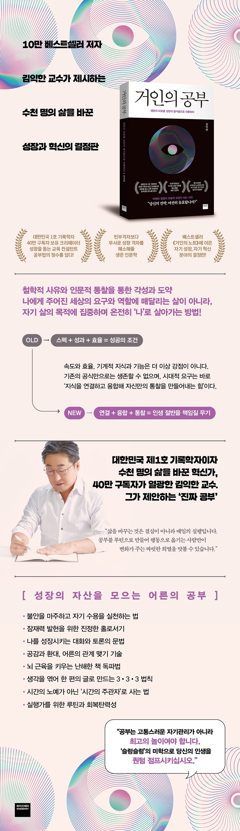 “당신의 생존 전략, 아직도 유효합니까?” 우리는 오랫동안 ‘경쟁에 최적화된 인간’을 이상형으로 삼아왔다. 더 빠른 성과, 더 높은 효율, 더 강한 스펙이 곧 생존의 조건으로 인식되어온 것이다. 많은 사람이 이 공식에 충실하게 살아왔고, 실제로 그 방식은 오랫동안 유효해 보였다. 그러나 인공지능을 비롯한 디지털 기술의 발전은 이 익숙한 공식을 무너뜨리고 있다. 속도와 효율, 기계적 지식과 기능은 더 이상 인간만의 강점이 아니다. 이러한 변화 속에서 인간에게 요구되는 것은 단순한 정보 축적이 아니라, 지식을 연결하고 융합해 자신만의 통찰을 만들어내는 힘이다. 그리고 여기서 비롯된 성장의 격차는 곧 생존의 격차로 이어질 가능성이 크다. 이것이 바로 김익한 교수가 말하는 ‘진짜 공부’를 시작해야 하는 이유다. 그는 공부의 의미를 크게 세 가지로 정리한다. 첫째, 나를 정확하게 들여다보는 힘을 기르는 과정이다. 둘째, 사유의 구조를 세워 논리적으로 사고하는 능력이다. 셋째, 무엇이든 실행에 옮길 때 거침없이 밀고 나가는 추진력이다. 많은 사람이 평가와 서열화를 위해 강제된 공부에만 매달려온 탓에, 이러한 공부의 의미와 기쁨을 제대로 경험하지 못해왔다고 그는 지적한다. 그 결과 ‘공부해도 달라지는 게 없다’는 체념과 회의가 쌓였고, 이는 공부와 성장을 가로막는 요인으로 작용해왔다. 《거인의 공부》는 세상이 요구하는 성공의 방정식에서 벗어나 ‘나’라는 존재를 제대로 이해하고 받아들이는 데서 출발할 것을 제안한다. 그제야 우리는 주어진 역할에 매달리는 삶이 아니라, 자기 삶의 목적에 집중하며 온전히 ‘나’로 살아갈 수 있다. 김익한 교수는 이러한 성장과 자기 혁신의 과정, 그리고 필요성을 설명하기 위해 다양한 철학자들의 사유와 인문적 통찰을 바탕으로 오늘의 삶을 다시 해석한다. 추상적인 이론을 나열하기보다 사유의 맥락을 짚어내고 이를 현실의 문제와 연결함으로써 독자가 자신의 삶에 직접 적용할 수 있도록 돕는다. 이 책은 우리 내면에 잠들어 있는 거인을 깨워 세상을 새롭게 바라보게 하는 동시에, 마침내 자신의 두 발로 서서 삶을 선택하도록 이끄는 성장 안내서다. 휘둘리지 않는 삶의 중심을 만들기 위해 ‘읽기, 쓰기, 사유하기, 실천하기’가 중요한 이유 《거인의 공부》는 개인의 내면에서 출발해 삶의 실천으로 이어지는 다섯 개의 장으로 구성되어 있으며, 한 사람의 사고와 태도가 어떻게 변화하는지 차근차근 따라간다. 먼저 1장에서는 숨 가쁜 성과 끝에서 마주한 공허함이 ‘공부의 부재’ 때문임을 짚는다. 공부를 경쟁의 수단이 아니라 ‘나’를 탐색하고 이해하는 과정으로 바라보며, 삶을 지탱하는 생각과 마음의 기초 체력을 기르는 것이 변화의 출발점임을 제안한다. 이어 2장에서는 성장을 가로막는 진짜 장애물이 외부 환경이 아니라 스스로 정해놓은 사고의 한계선임을 지적한다. 있는 그대로의 자신을 인정하고 이해하는 태도가 어떻게 변화와 성장을 가능하게 하는지를 보여준다. 3장에서는 단단해진 개인이 타인과 어떻게 건강한 관계를 맺을 수 있는지를 다룬다. 홀로서기는 고립이 아니라 관계의 전제 조건임을 강조하며 타인과의 소통, 연대, 공동의 학습을 통해 서로에게 선한 영향력을 주고받는 과정을 구체적으로 풀어낸다. 4장에서는 읽기와 쓰기를 중심으로 한 공부의 핵심으로 들어간다. 거인들의 독서란 지식을 소비하는 행위가 아니라 질문을 통해 사고의 방향을 점검하는 과정이다. 깊이 읽고 곱씹어 생각하고 자신의 언어로 기록할 때 비로소 독서는 사유로 이어진다. 쓰기 역시 결과를 만들기 위한 기술이 아니라, 생각을 구조화하고 자신을 점검하는 공부의 과정으로 제시된다. 이렇게 축적된 사유는 실천으로 이어질 때 비로소 삶을 변화시킨다. 마지막 5장에서는 생각과 결심을 가시적 결과로 옮기는 실행의 메커니즘을 다루며, 목표를 잘게 나누고 중간 결과물을 만들어 의도를 현실의 결과로 연결하는 방법을 살펴본다. 《거인의 공부》는 이 과정을 통해 변화를 위한 첫발을 내딛고, 진정한 성장과 자기 혁신의 즐거움을 경험하도록 돕는다. 공부는 혼자만의 성취에 머무르지 않고, 함께 배우고 나누는 연대 속에서 확장된다 2021년 말 시작된 온라인 성장 커뮤니티 ‘아이캔대학’에는 지난 4년여 동안 6,000명 이상이 참여해 공부했고, 그중 1,700여 명이 끝까지 과정을 완주했다. 특히 30명 이상이 자신의 이름으로 책을 출간하며 실제 삶의 변화를 증명했다는 점은 이 커뮤니티가 단순한 학습 공간을 넘어 삶의 방향을 바꾸는 장이었다는 사실을 보여준다. 《거인의 공부》는 바로 그 치열한 현장에서 축적된 배움과 성장, 그리고 사람들 사이의 연대가 응축된 결과물이다. 저자는 30분을 훌쩍 넘는 강의 60개와 여덟 권의 필독서, 생각력·연구력·실행력·관계력·향유력으로 이어지는 방대한 커리큘럼 가운데 삶을 변화시키는 데 꼭 필요한 핵심만을 선별해 한 권에 담았다고 말한다. 이 책이 말하는 변화는 비장한 각오나 전력 질주로만 이룰 수 있는 것이 아니다. 일시적인 몰입이나 과도한 긴장 상태에