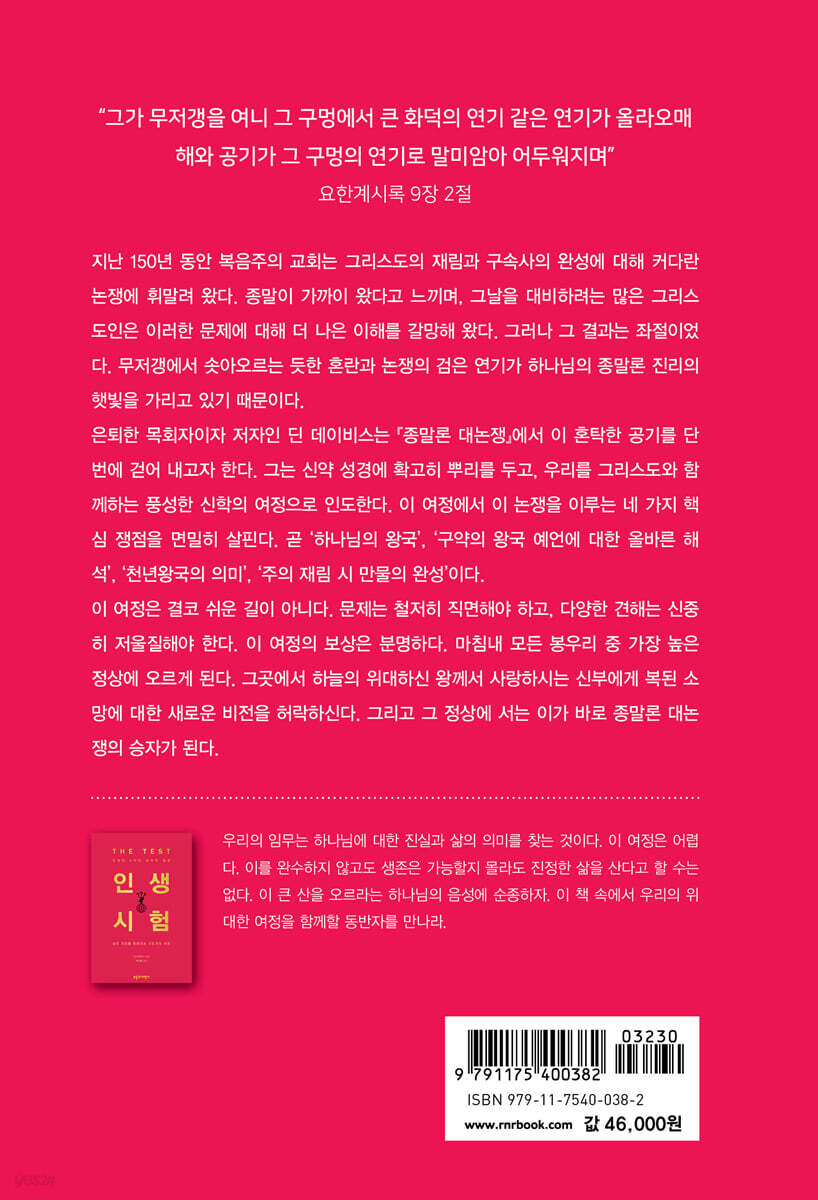 이 책을 정말 즐겁게 읽었다. 훨씬 더 방대한 분량의 『하늘의 높으신 왕』을 요약한 책이지만, 종말이라는 엄청나게 복잡한 주제를 다루는 여전히 두꺼운 책이다. 그럼에도 저자 딘 데이비스는 종말론 대논쟁에 익숙하지 않은 독자들에게도 큰 주제에 대한 핵심 개념을 간결하게 전달하는 데 탁월한 능력을 보여 준다. 아마도 오랜 연구 기간이나 목회 경험 덕분일 것이다. 어쨌든 데이비스는 이 주제를 간결하고 명료하게 논할 수 있다. 『하늘의 높으신 왕』을 읽어 본 나로서는 이 짧은 저작을 진심으로 높이 평가한다. 건전한 종말론을 사람들에게 소개하는 것을 좋아하지만, 720쪽에 달하는 『하늘의 높으신 왕』의 분량이 많은 이들을 겁먹게 한다는 사실을 깨달았기 때문이다! 이제 나는 『종말론 대논쟁』을 가리켜 이렇게 말할 수 있다. “이 책은 종말에 대해 알아야 할 모든 것을 알려 줄 것이다.” 게다가 정말 읽기 쉽다는 말을 덧붙일 수 있다. 딘의 새 책에 감사하며, 개인 연구, 교회 성경 공부, 심지어 신학교 수업에서도 활용하기를 진심으로 추천한다. - 니콜라스 포츠 (‘가스펠 포럼’(Gospel Forum) 팟캐스터, 플로리다 엘렌턴 킹스 크로스 교회 청소년 담당자)