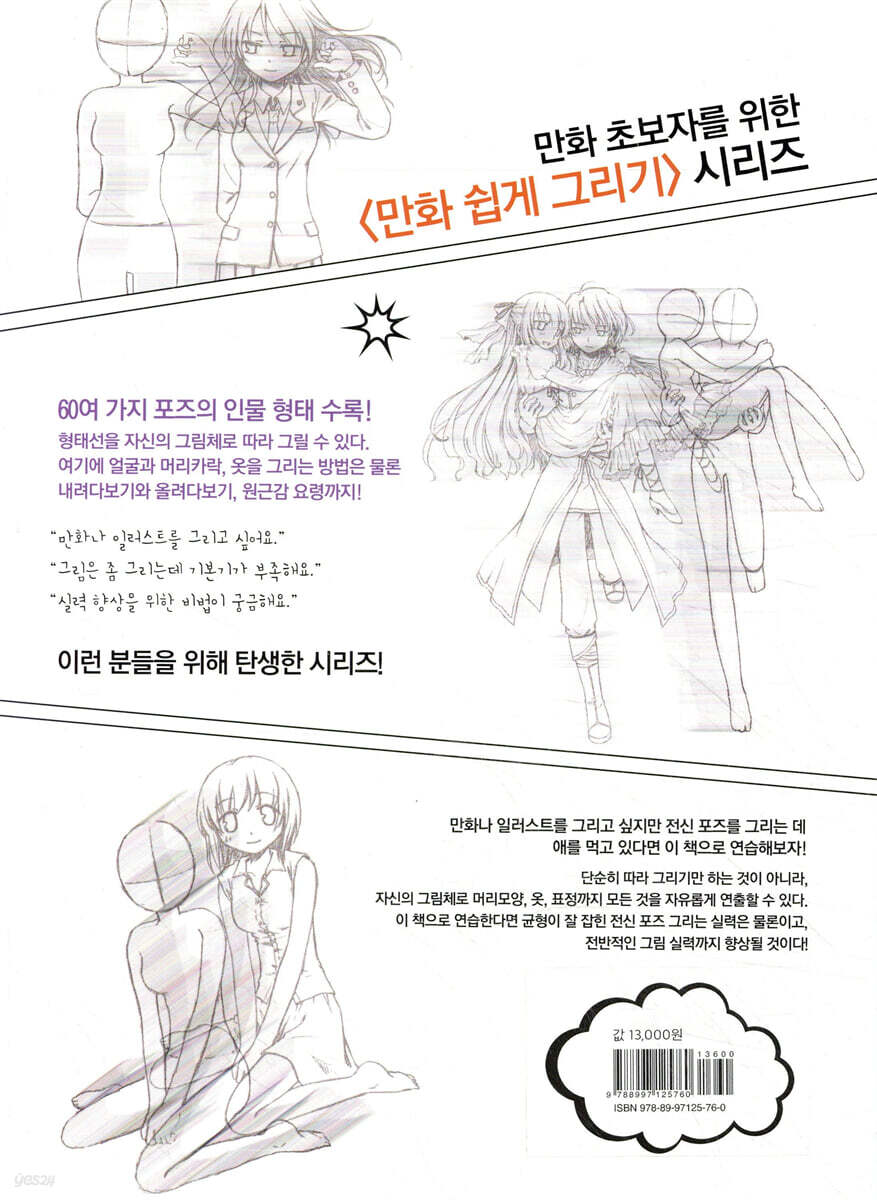 “그림을 잘 그리려면 어떻게 해야 할까?”아마도 많은 사람들이 데생이 가장 중요하다고 말할 것이다. 실제로 서점에는 여러 종류의 만화용 데생 책이 나와 있다. 그러나 데생을 열심히 연습하여 인체를 잘 그리게 되었다 해도 막상 자신의 캐릭터에 접목해서 그려 보면 어딘가 모르게 이상하다는 지적을 자주 받게 된다. 가령 머리가 너무 작다거나 팔이 너무 길다거나 식으로 말이다. 데생으로 인체의 형태까지 연습했는데 왜 이런 결과가 나오는 것일까? 도대체 균형이란 무엇일까? 어떻게 하면 균형이 잘 잡힌 그림을 그릴 수 있을까? 만화에서의 균형 감각은 단순히 데생으로 사물의 형태를 이해한다고 해서 터득되는 것이 아니다. 자신의 눈으로 ‘균형이 잘 잡힌’ 그림을 많이 보고 많이 그려야 한다. 그렇게 연습하다 보면 ‘이 정도면 됐어.’ 싶을 때가 오게 된다. 이 책에는 ‘균형이 잘 잡힌 인물의 여러 포즈’가 많이 실려 있다. 특히 책의 밑그림 위에 직접 연습할 수도 있다. 그러니 여기에 실린 인물의 형태를 따라서 자신의 스타일로 마음껏 그려보기 바란다. 그러면서 동시에 균형이 잘 잡힌 그림이 그렇지 않은 그림보다 훨씬 보기도 좋고, 그리기도 즐겁다는 사실을 느껴보기 바란다. 이 책에 실린 인물 형태를 다 따라 그리고 나면 그 전보다 ‘보기 좋다’는 것이 무엇인지를 알게 될 것이다. 여러분이 이 책을 통해 지금까지보다 ‘그림 그리는 일이 더 즐거워지기를’ 진심으로 기원한다.