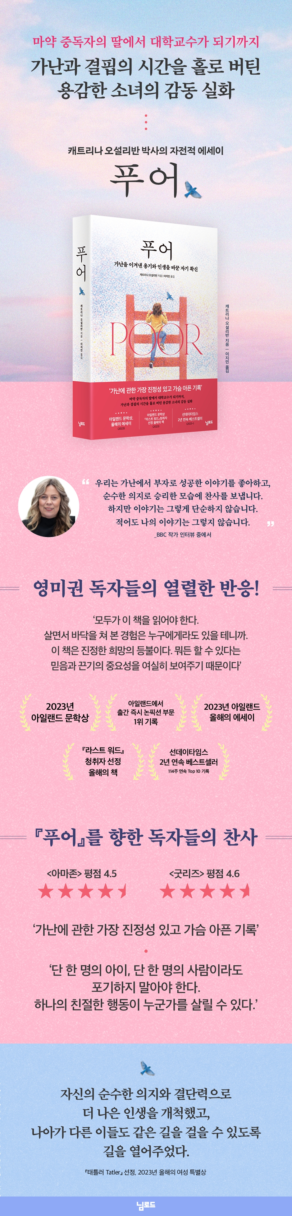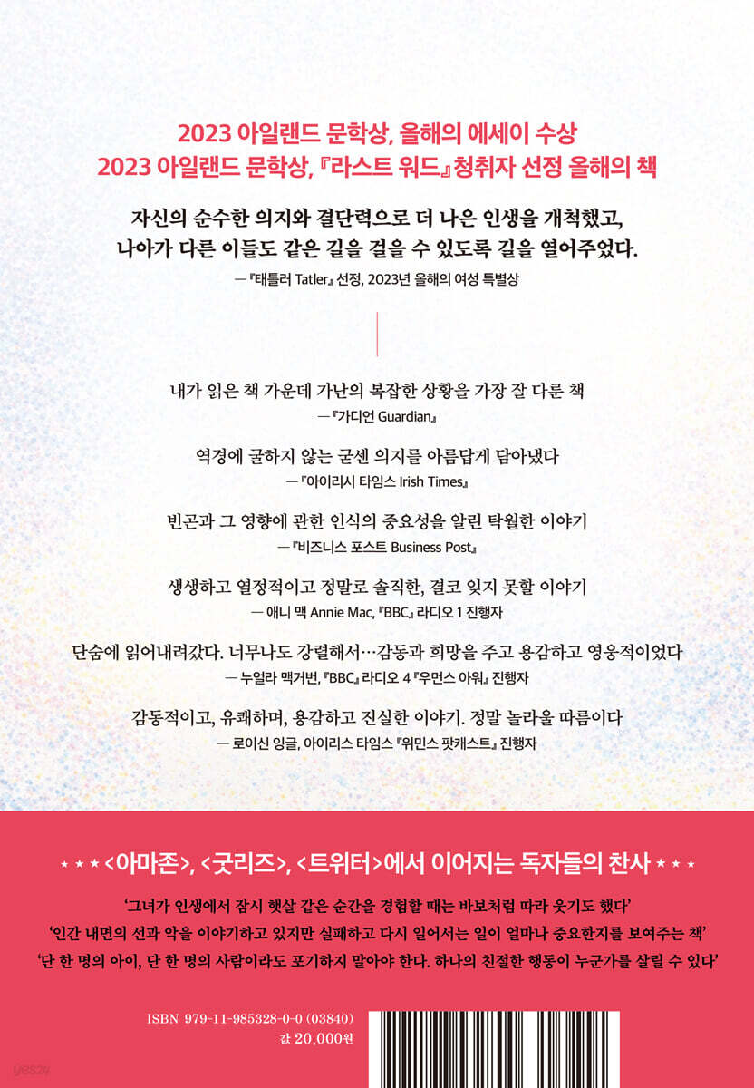 아일랜드에서 출간 즉시 논픽션 부문 1위 기록, 2023년 아일랜드 문학상, 『라스트 워드』청취자 선정 올해의 책, 선데이타임스 2년 연속 베스트셀러 (114주 연속 Top 10 기록) 자신의 순수한 의지와 결단력으로 더 나은 인생을 개척했고, 나아가 다른 이들도 같은 길을 걸을 수 있도록 길을 열어주었다. - 『태틀러 Tatler』 선정, 2023년 올해의 여성 특별상 내가 읽은 책 가운데 가난의 복잡한 상황을 가장 잘 다룬 책 - 『가디언 Guardian』 역경에 굴하지 않는 굳센 의지를 아름답게 담아냈다 - 『아이리시 타임스 Irish Times』 빈곤과 그 영향에 관한 인식의 중요성을 알린 탁월한 이야기 - 『비즈니스 포스트 Business Post』 생생하고 열정적이고 정말로 솔직한, 결코 잊지 못할 이야기 - 애니 맥, BBC 라디오 1 진행자 단숨에 읽어내려갔다. 너무나도 강렬해서 ... 감동과 희망을 주는 용감하고 영웅적인 이야기 누얼라 맥거번, BBC 라디오 4 『우먼스 아워』진행자 감동적이고, 유쾌하며, 용감하고 진실한 이야기 ... 정말 놀라울 따름이다 - 로이신 잉글, 아이리스 타임스 『위민스 팟캐스트』 진행자 2023년 올해의 책 중 하나로 선정: 〈아이리시 타임스〉, 〈아이리시 이그제미너〉, 〈비즈니스 포스트〉, 〈RSVP 매거진〉, 〈투데이 위드 클레어 번〉, 〈RTE 라디오 1〉, 〈더 라스트 워드〉, 투데이 FM 2023년 청취자 선정 올해의 책: 〈이안 뎀프시 모닝쇼〉, 투데이 FM *** 『푸어』를 향한 독자들의 찬사 *** ‘모두가 이 책을 읽어야 한다. 살면서 바닥을 쳐 본 경험은 누구에게라도 있을 테니까. 이 책은 진정한 희망의 등불이다. 뭐든 할 수 있다는 믿음과 끈기의 중요성을 여실히 보여주기 때문이다’ 〈아마존〉 평점 4.5 〈굿리즈〉 평점 4.6 ‘가난에 관한 가장 진정성 있고 가슴 아픈 기록’ ‘단 한 명의 아이, 단 한 명의 사람이라도 포기하지 말아야 한다. 하나의 친절한 행동이 누군가를 살릴 수 있다’ 어린 시절 캐트리나 오설리번 박사는 헤로인 중독자였던 부모 아래 극심한 빈곤 속에서 자랐다. 현재 그녀는 빈곤계층 소녀들의 교육 장벽을 극복하는 프로젝트를 연구하고 실행하는 명망 있는 교수가 되었다. 그녀의 책『푸어』는 가난의 ‘구렁텅이’에서 벗어나 다른 이들에게 영감을 주려는 그녀의 놀라운 성장 이야기를 담고 있다. 16세에 미혼모가 되고 노숙자가 될 처지였던 캐트리나에게 희망은 보이지 않았다. 그저 생존을 위한 절박함 만이 있었을 뿐이다. 가난하고 위험한 환경 속에서 어린 시절을 보낸 캐트리나는 빈곤계층은 무책임하고 부도덕하다는 일반화된 편견을 몸소 겪었다. 마약과 술에 중독된 부모는 무기력했고 아이들은 방치되었다. 사랑과 보살핌을 갈구했던 캐트리나에게 가난은 스스로 빠져나올 수 없는 멍에와 같았다. ‘결핍에 대한 갈망’ 캐트리나는 자신의 이야기가 가난에서 부자로의 성공담이 아니라, 좌절로 가득한 복잡한 과정이었다고 강조한다. 결핍에 대한 갈망은 단순히 음식에 대한 배고픔만이 아니라 보살핌을 받고 싶고, 존중받고 싶고, 인정받고 싶고, 정보와 자극에 대한 갈망이었다. “특권층에 있는 사람들은 가난이 얼마나 광범위하게 영향을 미치는지, 그리고 그것이 인생 전체에 어떻게 영향을 줄 수 있는지 진정으로 이해해야 합니다.” ‘햇살 같은 순간’ 캐트리나가 다닌 사우스필즈 초등학교가 위치한 동네는 활기찬 다문화 지역이지만 여전히 코번트리에서 가장 가난한 동네 중 하나다. 1980년대 초, 캐트리나가 학교에 다니기 시작할 무렵, 그녀는 불안감에 속이 뒤틀릴 지경이었다. 학교에서 읽고 쓰는 법을 배워야 했지만, 마약 중독자인 부모 걱정을 해야만 했다. ‘엄마에게 무슨 일이 생긴 건 아닐까, 경찰이 문 앞에 왔을까, 아빠가 체포된 건 아닐까? 어떨 때는 학교 급식이 그녀에게 하루 중 유일한 식사였다. 그리고 ‘훌륭하고 사랑스러운’ 아킨슨 선생님이 그녀에게 처음으로 자신감의 씨앗을 심어주었다. 아킨슨 선생님은 학교 화장실에서 캐트리나가 스스로 몸을 씻는 법을 가르쳐 주었고 매일 새 속옷을 가져다주었다. 선생님으로 받았던 따뜻한 보살핌은 캐트리나가 평생 간직하는 소중한 기억이 되었다. 중학교 영어 교사였던 피커링 선생님도 10대 소녀의 독서 사랑을 독려하기 위해 특별히 노력했고, 캐트리나의 잠재력을 발견하고 그녀에게 꿈을 심어주었다. 나중에 캐트리나가 15세에 임신으로 학교를 중퇴한 후에도 피커링 선생님은 캐트리나의 집을 찾아와 영어와 수학 GCSE 시험을 보라고 권유하며, 딸의 장래에 무관심한 부모를 질책하기도 했다. 아버지 토니는 마약 중독자였지만 카리스마 넘치고 교양 있는 인물로, 딸에게 읽을 만한 책을 권해 주며 독서의 재미를 느끼게 해주었다. 그녀가 더블린 트리니티 칼리지의 예비 과정에 합격했을 때 그는 이를 “내 인생 최고의 소식”이라며 환호했다. ‘끊임없는 두려움’ 빈곤계층 소녀에게 학교만 졸업해도 그것만으로 성공이었다. 캐트리나가 길거리에서 가장 말썽꾸러기 아이들과 어울리며 제멋대로인 10대 소녀가 된 건 자연스러운 일이었다. 하지만 그녀가 겪은 트라우마, 거친 주변 환경과 사람들, 그