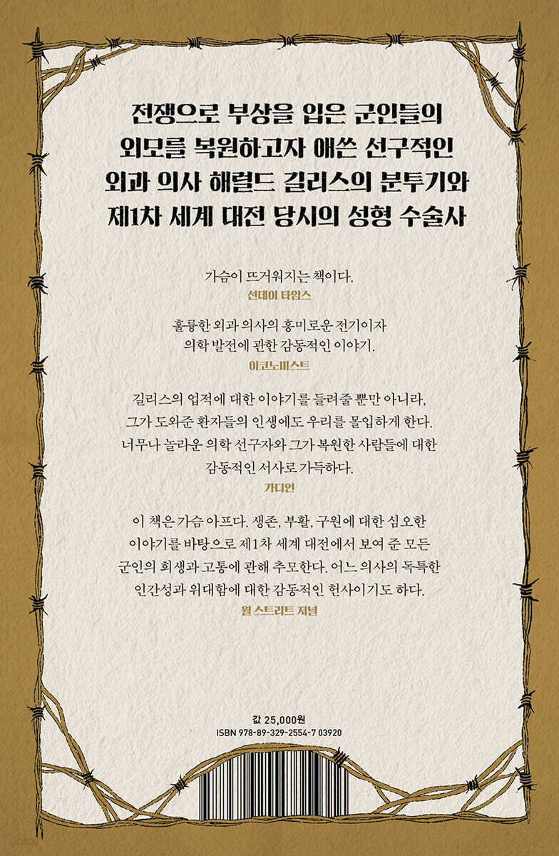 길리스의 업적에 대한 이야기를 들려줄 뿐만 아니라, 그가 도와준 환자들의 인생에도 우리를 몰입하게 한다. 너무나 놀라운 의학 선구자와 그가 복원한 사람들에 대한 감동적인 서사로 가득하다. - 가디언