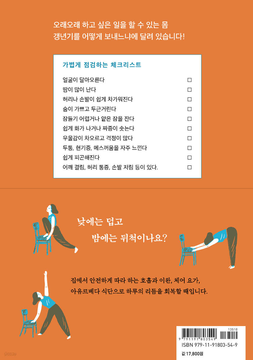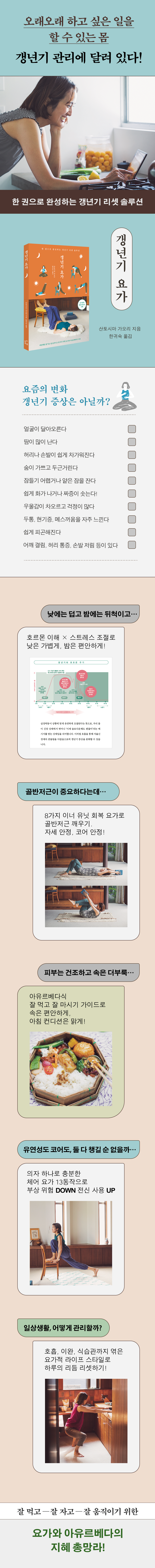 Part 1 갱년기, 몸과 마음의 건강을 점검하는 시기 다양한 갱년기 증상 갱년기 2분 셀프 테스트 갱년기는 병이 아니다 몸과 마음의 흔들림을 요가로 다잡다 짜증을 잠재우는 호흡법 아유르베다 셀프 케어 다섯 가지 원소와 세 가지 도샤 피타에서 바타로 전환되는 시기 몸과 마음이 까칠해지지 않도록 column 긍정적인 변화를 위한 노력들 Part 2 이너 유닛 회복 프로그램 갱년기장애, 이너 유닛 단련으로 예방할 수 있다 골반저근 깨우기 이너 유닛의 역할 ·이너 유닛 회복 요가 1 ·이너 유닛 회복 요가 2 ·이너 유닛 회복 요가 3 ·이너 유닛 회복 요가 4 ·이너 유닛 회복 요가 5 ·이너 유닛 회복 요가 6 ·이너 유닛 회복 요가 7 ·이너 유닛 회복 요가 8 Part 3 아유르베다 식이요법과 일상 케어 갱년기를 위한 식사 설계 소화와 대사의 흐름 일곱 가지 체내 조직 갱년기에 아그니를 건강하게 유지하는 법 아유르베다적인 수분 섭취 갱년기를 위한 복합 탄수화물과 채소, 단백질 바타를 보살피는 갱년기 식사 디저트, 먹어도 될까? Part 4 집에서 따라 하는 체어 요가 부담은 줄이고 효과는 살리는 체어 요가 체어 요가 수련 시 주의할 점 체어 요가의 호흡 ·체어 요가 1 등과 허리를 기분 좋게 늘이는 다운독과 업독 ·체어 요가 2 전신을 강화하는 한 발 다운독 ·체어 요가 3 다리를 스트레칭하는 런지① ·체어 요가 4 다리를 스트레칭하는 런지② ·체어 요가 5 근력을 기르는 하이런지 ·체어 요가 6 전신을 강화하는 전사 자세Ⅱ ·체어 요가 7 허리를 풀어주는 비둘기 자세 ·체어 요가 8 허벅지를 길게 늘이는 비둘기 자세 ·체어 요가 9 전신을 쓰는 삼각 자세 ·체어 요가 10 가슴을 활짝 여는 물고기 자세 ·체어 요가 11 전신을 이완하는 기도 자세 ·체어 요가 12 거꾸로 이완하는 브리지 & 어깨서기 자세 ·체어 요가 13 원하는 만큼 쉬는 사바아사나 Part 5 요가적인 라이프 스타일 요가로 평화로운 매일 짬짬이 나 자신을 돌보기 기분을 좋게 하는 걷기 스쿼트로 근육 저축! 균형 감각을 지키는 법 가벼운 전굴로 등 풀기 고개를 들면 마음도 열린다 나 자신을 만나는 명상법 아침은 밝게, 저녁은 깊게 덕질이 가져오는 의외의 효과 오늘의 아름다움, 만끽하고 있나요? 함께 연결되는 연습 나 자신을 소중하게 여기기 일상에서 찾은 신성함 둘도 없는 나 자신을 사랑하기 숙면을 위한 지혜 리트리트로 달라지는 일상 사바아사나로 새롭게 태어나다 에필로그 |