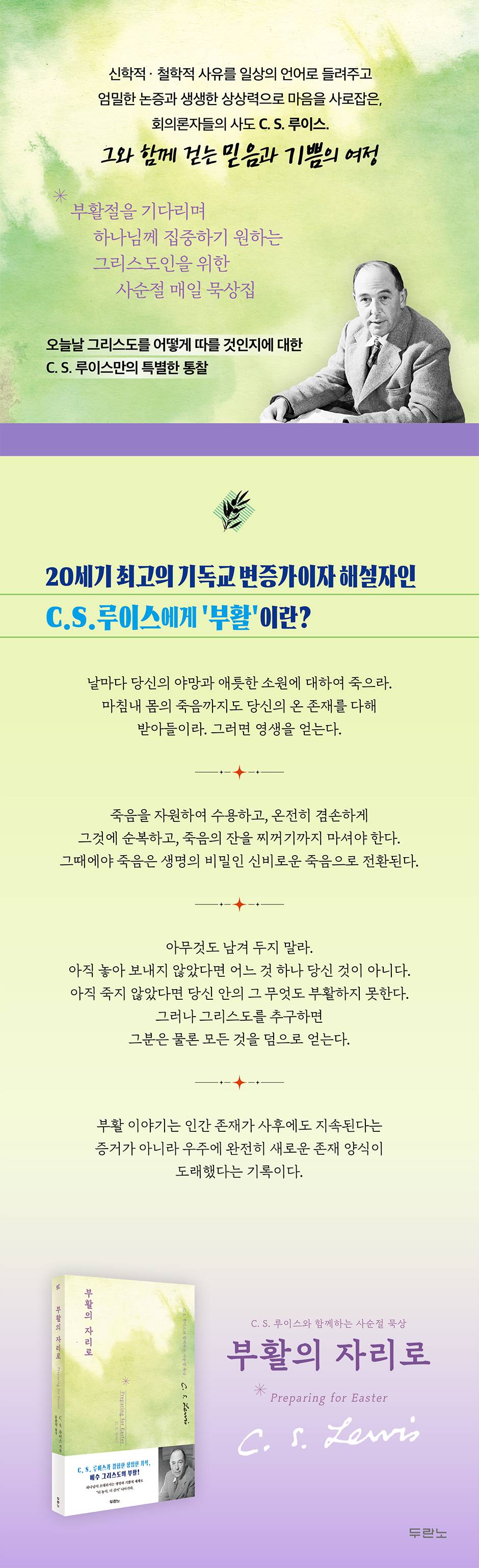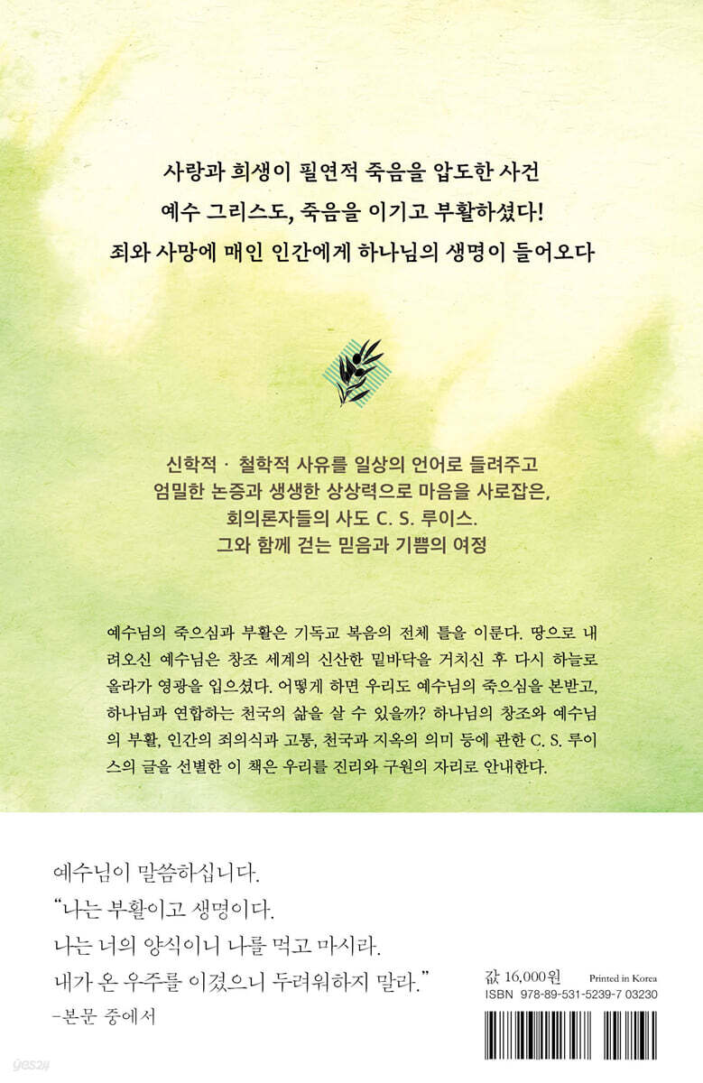 예수 그리스도, 죽음을 이기고 부활하셨다! 죄와 사망에 매인 인간에게 하나님의 생명이 들어오다 신학적·철학적 사유를 일상의 언어로 들려주고 엄밀한 논증과 생생한 상상력으로 마음을 사로잡은, 회의론자들의 사도 C. S. 루이스. 그와 함께 걷는 믿음과 기쁨의 여정 예수님의 죽으심과 부활은 기독교 복음의 전체 틀을 이룬다. 땅으로 내려오신 예수님은 창조 세계의 신산한 밑바닥을 거치신 후 다시 하늘로 올라가 영광을 입으셨다. 어떻게 하면 우리도 예수님의 죽으심을 본받고, 하나님과 연합하는 천국의 삶을 살 수 있을까? 특히 부활절을 앞둔 사순절 기간이 되면 예수님의 고난과 죽으심, 부활을 더 깊이 생각하게 된다. 부활의 주를 고대하는 심정으로 하나님 말씀을 묵상하고 하나님께 더욱 집중하려는 그리스도인을 위해 C. S. 루이스의 사순절 매일 묵상집이 출간되었다. 『부활의 자리로』는 C. S. 루이스의 방대한 저작에서 예수님의 죽으심과 부활, 하나님의 창조, 인간의 죄의식과 고통, 천국과 지옥의 의미 등에 관한 글을 엄선해서 묶은 책이다. 십자가를 통해 이루신 그리스도의 “장엄한 기적”을 묵상하며 그 의미를 재발견하고 그리스도와 온전히 연합하고자 하는 그리스도인에게 더할 나위 없이 유익한 책이다. 흔히 C. S. 루이스를 20세기 최고의 기독교 변증가로 꼽는다. 루이스의 변증이 위력적인 이유는 기독교와 성도의 삶을 보는 그의 관점에 예리한 시선과 따뜻한 포용력이 함께 있기 때문이다. 이 묵상집에서는 변증가 C. S. 루이스뿐만 아니라 오늘날 그리스도를 어떻게 따를 것인지에 대한 비전을 제시하는 전도자 C. S. 루이스도 만날 수 있다. 기독교 복음과 관련해서 영적, 지적, 정서적으로 만족을 얻을 뿐 아니라, 하나님이 초대하시는 구원과 진리와 기쁨의 세계로 “더 높이, 더 깊이” 들어가는 데 도움이 될 책이다. |