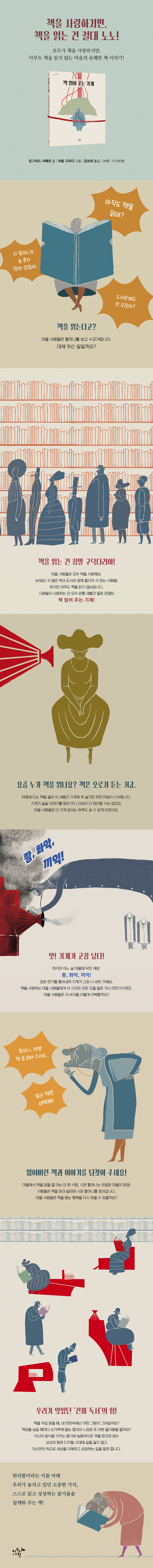 하지만 책을 읽는 건 너무나 구닥다리 같은 일이죠! --- pp.4-5 그리고 도서관 한복판에 자리를 잡은 바로 그 기계에 책을 넣기만 하면 돼요. 줄이 잔뜩 연결된 새빨간 그 기계 말이에요! 사람들은 그걸 이렇게 불렀답니다. 책 읽어 주는 기계! --- pp.12-13 그런데 2월인가, 3월쯤 되는 어느 날, (정확히 언제였는지는 이제 아무도 모른답니다) 도서관에서 콰앙 하는 커다란 소리가 울려 퍼졌어요. 그러고는 촤악 하더니, 끼익 하고서 다시 콰앙 했지요! --- pp.16-17 그런데 그게 끝이 아니었어요……. 아니다마다요. 책 읽는 기계의 안쪽에서 새카만 연기가 뿜어져 나오는 게 아니겠어요! --- pp.16-17 도시 전체가 슬픔에 잠기고 말았어요. 도서관은 텅 비어 버렸고, 책들은 책꽂이에서 조금도 움직이지 않았죠. --- pp.28-29 사람들은 모든 걸 잃은 듯이 이리저리 방황했어요. --- pp.30-31 |