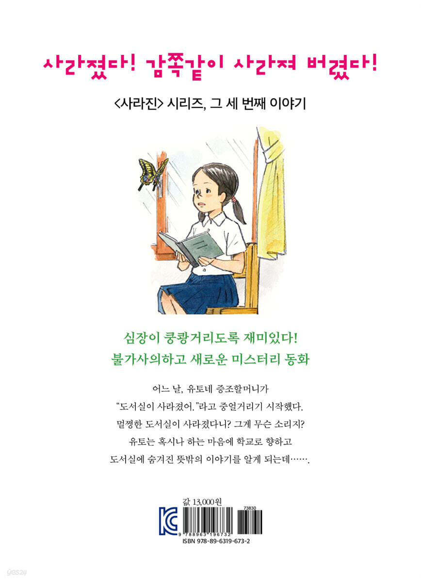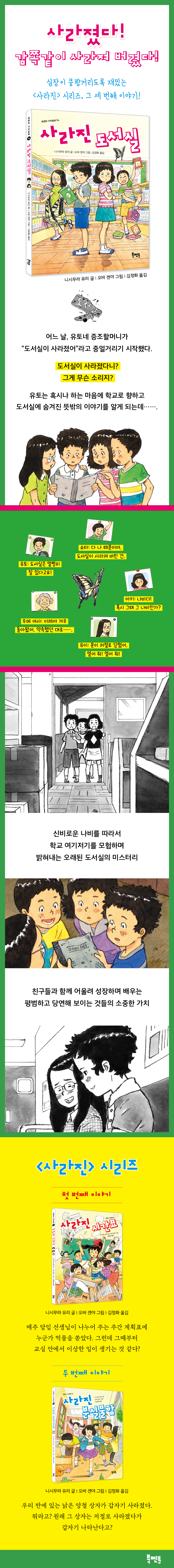 수상함을 넘어 불가사의한 새로운 미스터리 동화 시리즈 사라졌다! 도서실이 감쪽같이 사라져 버렸다! 〈사라진〉 시리즈, 그 세 번째 이야기 여름 방학을 맞아 유토는 증조할머니댁에 방문합니다. 증조할머니는 40대의 나이에 할머니가 되었고, 할머니라 불리기에는 어색하다는 이유로 ‘우메 여사’라는 별명을 가지게 됐지요. 우메 여사는 오랜만에 만난 유토에게 얼마 전에 유토네 학교에 갔었고, “도서실이 사라졌다.”는 말을 합니다. 이 말을 들은 유토는 우메 여사가 뭔가 잘못 알고 있다고 생각하는데, 그 이유는 바로 며칠 전에 유토가 직접 도서실에 다녀왔기 때문이었지요. 그러나 우메 여사는 유토의 말을 듣는 것인지 마는 것인지 계속해서 도서실이 사라졌다는 말만 할 뿐이었습니다. 유토는 이 이상한 이야기를 친구들에게 하게 되고, 쇼타와 아키, 유이가 “도서실이 사라졌다.”는 말의 진짜 의미를 찾을 수 있도록 유토를 돕기 시작합니다. 도서실에 무언가 숨겨진 비밀이 있다고 생각한 아이들은 실제로 도서실을 찾아가 비밀을 조사하게 되고, 그곳에서 날아다니는 나비를 마주치지요. 갑작스러운 나비의 등장에 깜짝 놀란 아이들은 엉겁결에 도서실 지하로 가는 문의 열쇠를 발견하게 되고, 몇십 년 동안이나 아무도 들어가 본 적 없는 도서실의 지하로 향하게 되는데……. 과연 아이들의 운명은 어떻게 될까요? 아이들은 “도서실이 사라졌어.”라는 우메 여사의 말의 진짜 의미를 찾아낼 수 있을까요? 신비로운 나비를 따라가며 깨닫는 배움과 기억의 소중한 가치 “도서실이 사라졌다.”라는 증조할머니의 알 수 없는 한마디에 이끌려 시작되는 이 이야기 곳곳에는 나비가 등장합니다. 호랑나비만 한 크기의 빛나는 나비 한 마리. 나비는 학교 안내도 틈새에 끼어 목숨이 위태로웠다가 쇼타의 도움으로 가까스로 살아나기도 하고, 마치 보답이라도 하듯 아이들이 도서실의 비밀 열쇠를 찾을 수 있도록 인도하지요. 어두운 도서실 안에서도 잠시 등장하고, 이 작품이 끝날 때까지 줄곧 나타났다 사라집니다. 마치 아이들을 수호하는 수호신처럼 잊을 만하면 한 번씩 등장해 아이들을 새로운 국면으로 이끌지요. 이 책은 우메 여사라는 인물이 가난한 시절 어렵게 학업을 이어 가야 했던 사연을 바탕으로 진행되는 이야기인데, 여기서 나비는 오래전 가난했던 옛 시절과 현재를 잇는 매개체로써, 또한 풍요 속에서 점점 사라져 가는 배움에 대한 열정과 추억의 상징으로서 등장합니다. 이 책의 곳곳에서 나비는 살며시 나타나 이제는 돌아갈 수 없는 과거에 대한 향수를 남긴 채 아스라이 사라집니다. 마치 배움의 가치를 소중히 생각했던 시절이 이젠 다시 돌아올 수 없다는 것을 잘 안다는 듯이 무심하게 사라지는데, 이는 우메 여사의 심경 변화와 맞물려 말할 수 없이 뭉클한 감동을 주지요. 그러나 이 책은 단순히 추억에 젖는 이야기가 아닙니다. 이야기가 진행될수록 도서실에 꽂혀 있는 책 따위에는 별 관심이 없던 아이들이 점차 책에 대한 태도의 변화를 보여주는데 이 과정 안에 이 책이 어린이에게 거는 희망이 있습니다. 모든 것이 부족하고 기회가 없던 시절, 한 권의 책은 너무나 소중했지요. 그런데 그 모든 것이 흔해진 지금은 그런 소중함을 우리는 잘 모르고 살아갑니다. 이 책은 과연 이런 상황이 맞는 것인지, 우리가 복잡한 현대 사회를 산다는 핑계로 무언가 놓치고 있는 것은 아닌지 어린이 독자가 한 번쯤 스스로 생각해 보게 합니다. 마치 외할머니가 인자한 웃음으로 타이르듯이, 삶의 지혜를 소중히 전하듯이 아이들에게 가만히 말을 건네지요. 부디 더 많은 미래의 주인공이 이 책을 읽고 내가 못 가진 것들보다 내가 가진 많은 것에 집중하고, 감사하고, 소중히 할 줄 아는 어른으로 자라날 수 있기를 바랍니다. [교과 연계] * 3-2 국어 1. 재미가 솔솔 * 4-1 국어 10. 인물의 마음을 알아봐요 * 5-2 국어 1. 문학이 주는 감동 * 6-1 국어 7. 이야기의 구성 |