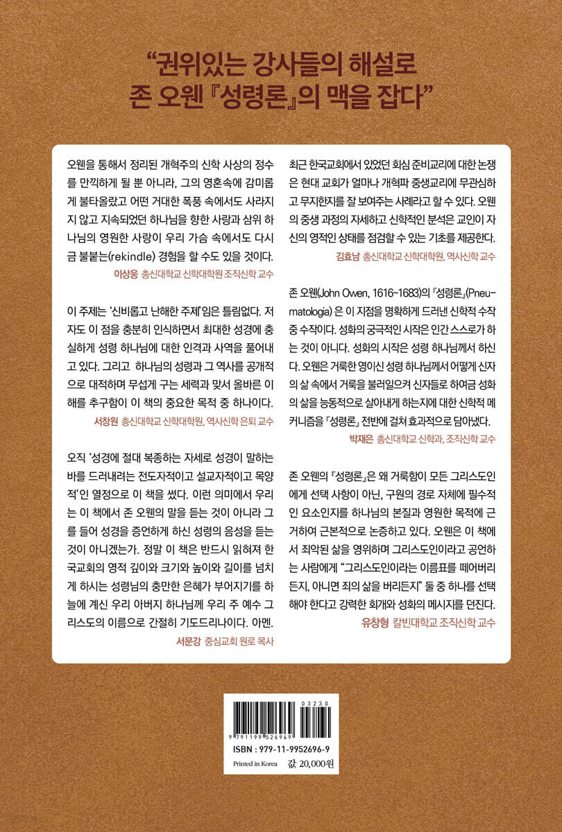 01. 존 오웬의『성령론』: 역사적 배경과 개요 _ 이상웅·총신대학교 신학대학원 조직신학 교수 1. 들어가는 말 20 2. 존 오웬의 생애 24 2.1. 존 오웬의 초기 생애 25 2.2. 존 오웬의 공적인 전성시대(1649~1660) 27 2.3. 존 오웬의 후기 생애(1660~1683) 28 3. 존 오웬의 성령론 관련 저술들과『성령론』(1674) 32 3.1. 존 오웬의 성령론적 저술 33 3.2. 존 오웬의『성령론』(1674) 개요 36 4. 감사의 글과 본서의 활용에 관하여 44 02. 존 오웬의『성령론』제1권 핵심 요약·평가·적용 _ 서창원·총신대학교 신학대학원 역사신학 은퇴 교수 1. 저술 의도 53 2. 성령과 그 역사에 대한 보편적 이해 54 2.1. 은사들의 수여자이신 성령은 누구신가? 56 2.2. 성령의 이름들과 호칭 66 3. 성력의 신적 본질과 인격성 70 3.1. 하나님의 본질과 존재의 고유성 70 3.2. 참된 예배와 순종의 원칙과 방도 70 3.3. 성령의 하나님 되심을 증거하는 것들 72 3.4. 성령의 인격적인 소양들 75 4. 옛 창조에서 나타난 성령의 고유한 역사 80 4.1. 성경에 계시된 성령의 고유한 행사들 81 5. 성령의 신적 경륜과 그 방식에 대하여 83 5.1. 성부와 성령의 관계 83 5.2. 하나님의 관대하심과 성령의 은사들과 은혜들을 부어 주시는 세 요점 84 5.3. 성부께서 성령의 일에 적용하시는 방식 85 03. 존 오웬의『성령론』제2권 핵심 요약·평가·적용 _ 서문강·중심교회 원로 목사 1. 존 오웬의 저작들의 방식 93 2. 제2권 전체 개요 94 2.1. 신약시대를 준비하신 구약시대 성령의 역사들 95 2.2. 새 창조를 위한 성령의 보편적인 경륜 97 2.3. 새 창조의 머리이신 그리스도의 인성과 성령의 역사 99 2.4. 그리스도의 인성에 역사하신 성령 104 2.5. 교회의 지체들을 새롭게 창조하시는 성령의 보편적인 역사 110 3. 결론적 적용 - 교회의 초석이신 성령 112 3.1. 그리스도의 영광을 나타내시는 성령 112 3.2. 성령의 주권과 우리의 힘씀 113 4. 마치는 말 114 04. 존 오웬의『성령론』제3권 핵심 요약·평가·적용 _ 김효남·총신대학교 신학대학원 역사신학 교수 1. 거듭나게 하시는 성령의 새 창조 역사 116 1.1. 중생의 본질과 유효한 동인(원인) 116 1.2. 중생의 특성: 도덕적 개혁 및 열광주의와의 구별 117 1.3. 중생 사역에 대한 실천적 강조점 118 1.4. 실천적 / 목회적 적용 119 2. 거듭남을 준비하시는 성령의 역사 120 2.1. 거듭남을 준비하는 성령의 역사의 본질 121 2.2. 예비 사역의 목적과 한계 122 2.3. 오류에 대한 반박과 실천적 권면 123 2.4. 실천적 / 목회적 적용 124 3. 죄로 말미암아 부패한 사람의 지성 125 3.1. 중생의 필요성: 전적 타락과 지성의 부패 125 3.2. 자연인에게 속한 이성(reason)의 한계 126 3.3. 중생: 성령의 초자연적인 조명 127 3.4. 결론: 지성의 부패와 성령의 주권적 은혜 128 3.5. 실천적 / 목회적 적용 128 4. 사망과 생명의 영적 실상 비교 129 4.1. 인간의 비참한 상태: 영적 사망 130 4.2. 구원의 상태: 영적 생명 131 4.3. 결론: 중생의 절대적인 필요성 확증 132 4.4. 설천적 / 목회적 적용 132 5. 거듭남의 본질과 동인과 방편 134 5.1. 거듭남의 외적 방편: 말씀 설교 135 5.2. 거듭남의 유효한 동인: 성령의 직접적인 역사 135 5.3. 결론: 하나님의 전적인 사역 136 5.4. 실천적 / 목회적 적용 137 6. 어거스틴의 경우로 예증된 회심의 방식 138 6.1. 어거스틴의 사례를 제시하는 이유 139 6.2. 어거스틴의 영적 투쟁과 성령의 역사 139 6.3. 결론: 중생은 성령의 권능이다 140 7. 제3권의 내용에 대한 신학적 평가 141 7.1. 중생이 본성적으로 성령의 단독적(monergistic) 사역이라는 진리를 수호 141 7.2. 성령의 단독사역인 중생에 말씀의 도구성을 확립하여 목회자와 신자 자신의 책임을 배제하지 않음 141 7.3. 인간의 전적 타락 교리와 불가항력적 은혜 교리의 확립 142 7.4. 중생 과정의 자세하고 신학적인 분석 142 7.5. 성령의 예비적 사역에 대한 강조 143 7.6. 중생과 회심의 개념이 명확히 분리되지 않음 143 05. 존 오웬의『성령론』제4권 핵심 요약·평가·적용 _ 박재은·총신대학교 신학과조직신학 교수 1. 들어가는 글 146 2. 오웬의『성령론』제4권 핵심 요약·평가·적용 147 2.1. 성화의 본질과 복음적 거룩함의 개념 184 2.2. 성화의 점진적 성격 152 2.3. 믿는 자들만이 성화의 유일한 대상 156 2.4. 죄의 오염과 실상과 죄를 정결하게 하심 159 2.5. 성령과 그리스도의 피로 씻어지는 죄의 더러움 161 2.6. 성도의 성화를 위한 성령의 적극적인 행사 165 2.7. 성결의 행위들과 의무들 168 2.8. 죄 죽이기의 성질과 그 동인들 171 3. 나가는 글 174 06. 존 오웬의『성령론』제5권 핵심 요약·평가·적용 _ 유창형·칼빈대학교 조직신학 교수 1. 하나님의 성품을 고려할 때 절대 필요한 성결 178 1.1. 하나님의 거룩하신 성품에 근거한 성결의 절대적인 필요성 178 1.2. 그리스도 안에 계시된 하나님의 거룩하심과 성결의 동기 179 1.3. 성결: 하나님의 형상과 회복과 최고의 탁월함 180 1.4. 믿음과 사랑을 통한 성결의 진보 180 1.5. 성결과 영원한 구원의 확증 181 1.6. 거짓된 성결에 대한 경계 192 2. 성결의 원인과 동기가 되는 하나님의 영원한 선택 183 2.1. 하나님의 영원한 작정과 성결의 절대적 필요성 183 2.2. 예정론에 대한 반론과 오웬의 논박 184 2.3. 하나님의 선택에서 비롯된 성결의 구체적인 동기 186 3. 하나님의 명령과 성결의