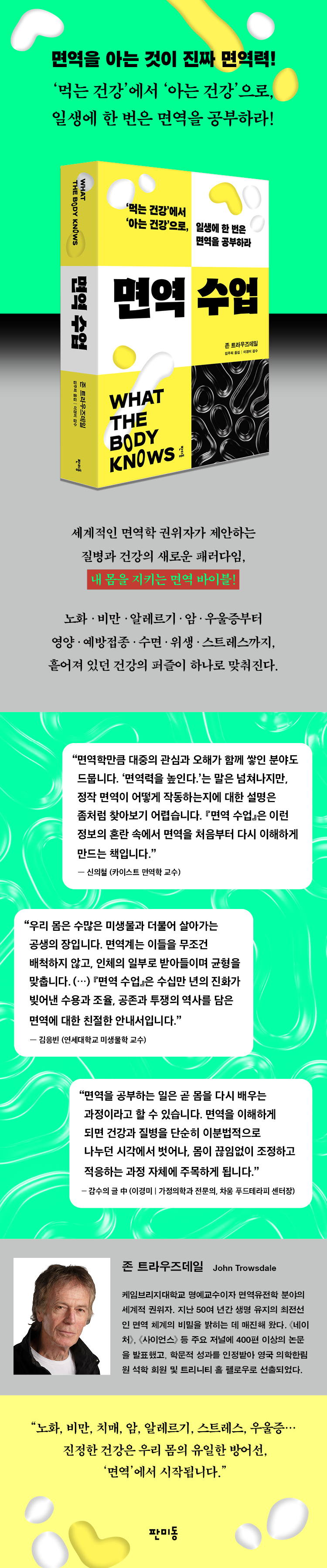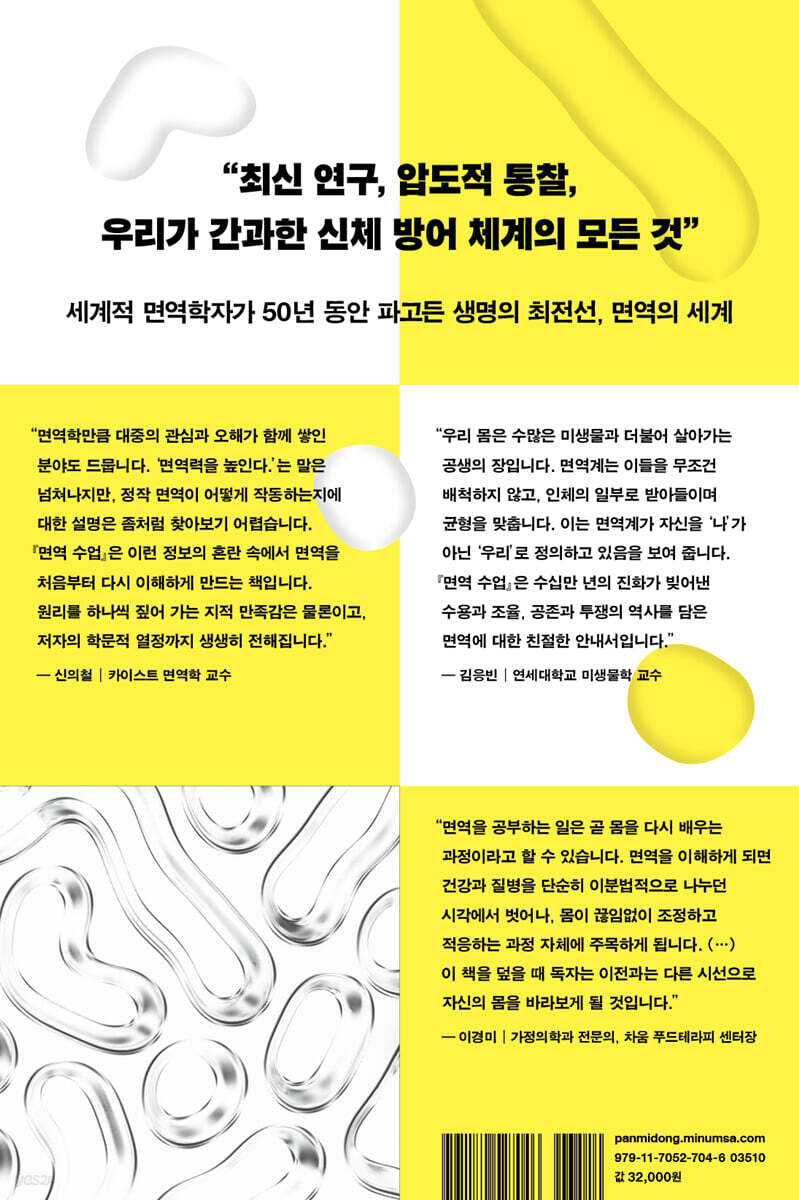 생명의 최전선에서 작용하는 지능적인 시스템 수백만 년에 걸친 진화의 과정 속에서 인류는 끊임없이 새로운 질병과 위협에 노출되었고, 이에 맞서 살아남기 위한 방어 체계를 정교하게 다듬어 왔다. 저자는 “면역계가 얼핏 보면 복잡하고 무질서해 보이지만, 실제로는 시처럼 조화롭고 정교하게 작동하며 대부분의 경우 놀라울 만큼 효과적으로 몸을 보호한다.”고 말한다. 나아가 면역을 ‘보이지 않는 전쟁’에 비유하면서도, 그 본질은 공격이나 파괴가 아니라 ‘협상과 조율’에 있다고 강조한다. 그 근거로 면역이 특정 세포의 활동에 국한된 체계가 아니라, 뇌와 호르몬, 장내 미생물 등 온몸과 끊임없이 소통하며 신체의 균형을 유지하는 지능적인 시스템이라는 점을 짚는다. 이러한 시각은 질병을 ‘적’으로만 여기고 면역을 무조건적으로 강화해야 할 대상으로 바라보던 기존의 관점을 넘어, 건강을 면역 균형의 관점에서 다시 바라보게 해 준다. 비만, 노화, 예방접종에서 우울증까지, 일상에서 작동하는 건강의 기준 『면역 수업』은 면역 지식을 일상과 분리된 과학 이론으로 다루지 않는다. 코로나19 범유행 이후 백신 기술에 대한 관심이 높아진 지금, 저자는 예방접종을 ‘면역 기억’이 형성되는 과정으로 풀어낸다. 또한 많은 사람이 나이가 들수록 치명적인 감염에 취약해지는 이유를, 단순한 시간의 경과가 아니라 면역을 조절하는 능력의 변화에서 찾는다. 비만과 만성 질환, 암 역시 단일한 원인에서 비롯된 결과가 아니라, 면역 불균형이 오랜 시간에 걸쳐 축적된 결과로 제시된다. 이렇듯 이 책은 면역이 고정된 체계가 아니라, 삶의 환경과 경험 속에서 끊임없이 형성되고 변화하는 복합적인 시스템임을 보여 준다. 나아가 식단과 위생, 수면, 에너지 대사 등 반복되는 생활 방식이 면역에 어떤 구조적 영향을 미치는지를 구체적으로 짚으며, 면역에 대한 이해가 곧 건강 관리의 기준을 새롭게 세우는 일임을 설득력 있게 드러낸다. ▶ 추천사 “면역학만큼 대중의 관심과 오해가 함께 쌓인 분야도 드뭅니다. ‘면역력을 높인다.’는 말은 넘쳐나지만, 정작 면역이 어떻게 작동하는지에 대한 설명은 좀처럼 찾아보기 어렵습니다. 『면역 수업』은 이런 정보의 혼란 속에서 면역을 처음부터 다시 이해하게 만드는 책입니다. 원리를 하나씩 짚어 가는 지적 만족감은 물론이고, 저자의 학문적 열정까지 생생히 전해집니다.” - 신의철 (카이스트 면역학 교수) “우리 몸은 수많은 미생물과 더불어 살아가는 공생의 장입니다. 면역계는 이들을 무조건 배척하지 않고, 인체의 일부로 받아들이며 균형을 맞춥니다. 이는 면역계가 자신을 ‘나’가 아닌 ‘우리’로 정의하고 있음을 보여 줍니다. 『면역 수업』은 수십만 년의 진화가 빚어낸 수용과 조율, 공존과 투쟁의 역사를 담은 면역에 대한 친절한 안내서입니다.” - 김응빈 (연세대학교 미생물학 교수) “면역계가 우리를 보호하는 원리를 살펴보고, 면역계를 효과적으로 유지하는 핵심 방법을 짚는다. 나아가 노화와 면역의 관계를 분석하고, 우리 몸이 반복되는 질병에 맞서 싸우는 법을 어떻게 학습하는지 그 과정을 밝힌다.” - 《SHA 매거진》 “면역을 새롭게 보게 하는 흥미롭고 설득력 있는 분석.” - 《네이처》 “신체의 방어 체계에 대한 최신 연구를 명확하고도 흥미롭게 풀어낸 매혹적인 책. 인간의 몸에서 매우 중요하지만, 종종 간과되는 면역에 대한 통찰로 가득 차 있다.” - 조너선 케네디(『세균은 어떻게 역사를 만들었는가』 저자) “흥미로운 과학적 이야기들로 가득해서 유쾌한 이 책은 독자를 면역계라는 경이로운 세계로 안내한다. 호기심 많은 독자라면 누구나 쉽게 읽을 수 있다.” - 메리 캐링턴(프레데릭 국립암연구소 수석 책임연구원) “이 분야 최전선에서 쌓아 온 풍부하고 다양한 경험을 바탕으로, 수많은 자료를 능숙하게 엮어낸다. 이 책은 읽는 내내 매혹적일 뿐 아니라, 무척 재미있다.” - 폴 클레너먼(옥스퍼드대학교 소화기내과 석좌교수) “면역이라는 학문을 일반 독자에게도 우아하고 날카로운 방식으로 매우 이해하기 쉽게 전달한다. 개인적으로도 큰 즐거움을 안겨 준 책이다.” - 미할 슈바르츠(와이즈만 과학연구소 신경면역학 교수) “교과서식으로 설명하는 책이 아니라, 스스로 생각하게 만드는 책. 다채로운 일화로 가득해 읽는 즐거움이 크다.” - 대니 올트먼(임페리얼 칼리지 런던 면역학 교수) |