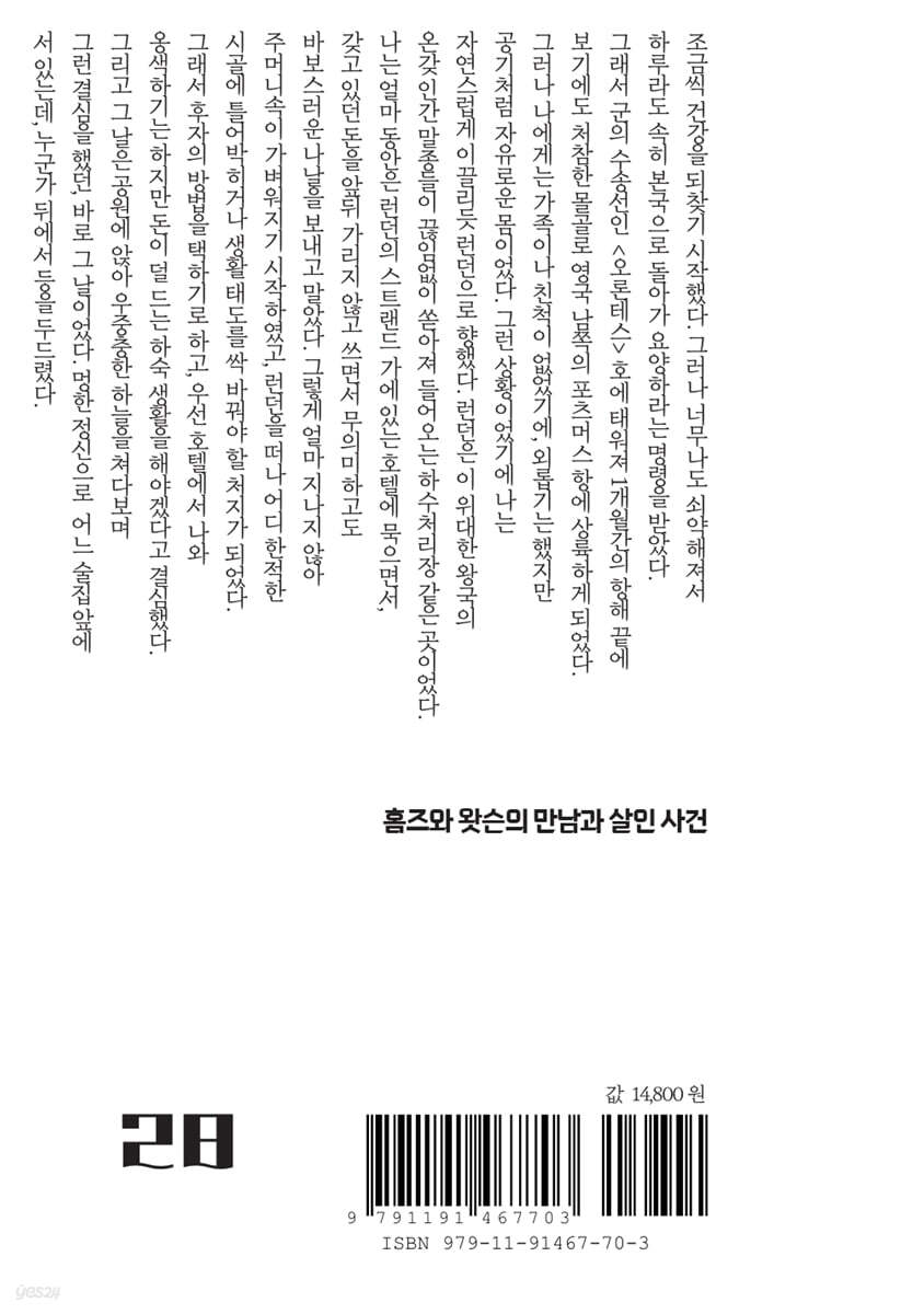 나는 후방의 병원으로 보내졌다. 그 곳에서 어느 정도 건강이 회복되어 병원 안을 걸어 다니기도 하고, 베란다에 나가 일광욕도 할 만큼 회복되어갈 무렵, 불운하게도 이번에는 장티푸스에 걸리고 말았다. 그로부터 몇 달 동안 사경을 헤매다가, 가까스로 의식을 회복하고는 조금씩 건강을 되찾기 시작했다. 그러나 너무나도 쇠약해져서 하루라도 속히 본국으로 돌아가 요양하라는 명령을 받았다. 그래서 군의 수송선인 ‘오론테스’호에 태워져 1개월간의 항해 끝에 보기에도 처참한 몰골로 영국 남쪽의 포츠머스 항에 상륙하게 되었다. 그러나 나에게는 가족이나 친척이 없었기에, 외롭기는 했지만 공기처럼 자유로운 몸이었다. 그런 상황이었기에 나는 자연스럽게 이끌리듯 런던으로 향했다. 런던은 이 위대한 왕국의 온갖 인간 말종들이 끊임없이 쏟아져 들어오는 하수처리장 같은 곳이었다. 나는 얼마 동안은 런던의 스트랜드 가에 있는 호텔에 묵으면서, 갖고 있던 돈을 앞뒤 가리지 않고 쓰면서 무의미하고도 바보스러운 나날을 보내고 말았다. 그렇게 얼마 지나지 않아 주머니속이 가벼워지기 시작하였고, 런던을 떠나 어디 한적한 시골에 틀어박히거나 생활 태도를 싹 바꿔야 할 처지가 되었다. 그래서 후자의 방법을 택하기로 하고, 우선 호텔에서 나와 옹색하기는 하지만 돈이 덜 드는 하숙 생활을 해야겠다고 결심했다. 그리고 그 날은 공원에 앉아 우중충한 하늘을 쳐다보며 그런 결심을 했던, 바로 그 날이었다. --- 본문 중에서 |