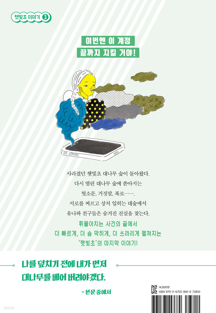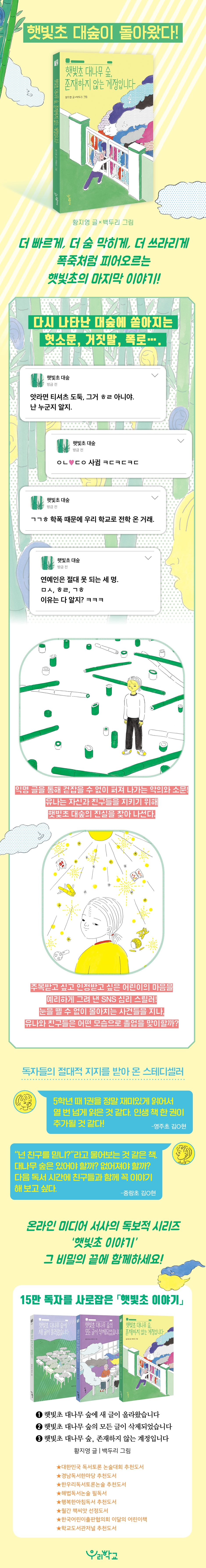 눈을 뗄 수 없이 몰아치는 마지막 이야기 SNS 익명 계정에서 자신의 정체를 숨긴 채, 다른 사람에게 드러낼 수 없었던 적나라한 마음을 주고받는 아이들의 이야기를 담은 「햇빛초 이야기」는 어린이 독자들에게 큰 사랑을 받으며 창작 동화 분야에서 명실상부한 스테디셀러의 자리를 지켜 오고 있다. 이 시리즈가 어린이 독자들로부터 절대적인 지지를 받은 이유는 무엇보다 「햇빛초 이야기」가 어린이가 깊이 공감할 수 있는 이야기를 담고 있기 때문일 것이다. 황지영 작가는 어른들은 잊어 버린 어린이의 복잡한 심리를, 한 단어로 설명할 수 없는 친구 사이의 미묘한 마음을 섬세하게 이야기 속에 녹여 내었다. 밝고 단단해 보이지만 친구들과의 관계 속에 많은 상처를 가진 유나. 유나와 함께 지내며 좋은 사람이 되어 보려고 하지만 사람들에게 친절해지지 못하는 건희. 둘의 모습은 강한 면과 약한 면, 좋은 면과 나쁜 면을 함께 지닌 채, 자신이 지닌 모순을 부정하면서도 인정받기를 바라는 어린이의 마음을 대변한다. 여기에 새로 햇빛초에 전학 온 채연은 남겨 두고 온 친구에게 미안해하면서도 서로 좋은 감정을 나누지 못하는 것을 아쉬워하는, 평범하지만 그만큼 제대로 조명받지 못했던 어린이의 솔직한 마음을 보여 주는 인물이다. 「햇빛초 이야기」는 세 등장인물의 일인칭 시점으로 하나의 이야기를 만들어 나가는 방식을 통해 사건에 얽힌 인물들의 솔직한 심리를 예리하게 포착해 왔다. 이번 『햇빛초 대나무 숲, 존재하지 않는 계정입니다』에서도 유나와 건희, 새로운 인물 채연의 시점이 교차하며 다시 나타난 대나무 숲에 숨겨진 진실을 밝혀 가는 과정이 눈을 뗄 수 없이 숨 가쁘게 펼쳐진다. 유나와 동우의 연애, 유나에게 비밀로 했던 건희의 과거, 채연이 친구를 위해 했던 선의의 거짓말. 누군가가 너무 소중해서, 지키고 싶어서, 손가락질당하고 싶지 않아서 숨기고 싶었던 비밀은 어떤 끝을 맞이하게 될까? 진실과 거짓, 그리고 그것을 전하는 말의 무게 인터넷과 함께 성장하는 우리 시대 어린이의 필독서 유나는 대숲에 올라오는 글을 동우와 함께 보며 재미있어하기도 하고, 누구에게라도 속마음을 말하고 싶을 때 곧바로 대숲을 떠올리기도 한다. 대숲에서는 내가 올린 글에 깊은 책임을 느낄 필요도, 누가 나를 알아볼까 봐 걱정할 필요도 없다. 그렇기에 대숲은 숨기고 싶은 비밀을 가진 아이들에게 마음 기댈 곳이 되어 주는 곳이기도 하지만, 진실을 확인할 수 없는 글이 퍼져 나가는 곳이기도 하다. 결국 유나는 더 이상 자신과 아이들이 상처받지 않도록 대숲의 주인을 추적하기 시작한다. 「햇빛초 이야기」의 첫 번째 책인 『햇빛초 대나무 숲에 새 글이 올라왔습니다』에서도, 그리고 마지막 이야기인 『햇빛초 대나무 숲, 존재하지 않는 계정입니다』에서도 대숲은 아이들이 비밀을 나누는 장소인 동시에, 당사자가 바란 적 없는 폭로와 사실을 확인할 수 없는 거짓 뉴스가 가득한 공간이다. 누군가 내 말에 귀를 기울이고 있다는 느낌, 내 목소리가 많은 이에게 영향을 미치고 있다는 감각은 나를 잃어버리게 할 만큼 매력적이고 짜릿하다. 게다가 익명 뒤에 숨어 책임마저 피할 수 있다면, 폭로와 거짓말이라는 달콤쌉쌀한 자극에서 눈 돌리기란 쉽지 않다. 『햇빛초 대나무 숲, 존재하지 않는 계정입니다』는 흡인력 넘치는 서사와 치밀한 심리 묘사를 통해 독자의 깊은 몰입을 이끈다. 그리고 그 몰입의 끝에, 독자들이 답해야만 하는 몇 가지 날카로운 질문을 던진다. 진실이라고 해서 당사자가 바라지 않는 사실을 널리 알려도 되는지? 폭로를 통한 ‘정의 구현’은 옳은지? 거짓 소문을 퍼트리는 것이 타인으로 하여금 어떤 감정을 느끼게 하는지? 독자들은 각 장의 화자인 유나가 되어, 건희가 되어, 또 채연이 되어 이러한 질문들에 답을 찾아가게 될 것이다. 그리고 누구나 인터넷에 글을 올릴 수 있고, AI가 무엇이든 진짜처럼 만들어 낼 수 있는 오늘날, 무엇을 말하고 믿으며 살아야 하는지 스스로 생각하게 될 것이다. 완벽한 행복이 기다리지 않는다 해도, 단단한 마음으로 맞이하는 새로운 시작 「햇빛초 이야기」의 주인공 유나는 여러 사건을 경험하면서도 마음의 균형을 잃지 않는 단단한 주인공이다. 많은 동화 속 주인공이 마법적인 힘을 통해, 혹은 특별한 기회와 도움을 통해 고난을 극복할 실마리를 붙잡는다면, 유나는 자신의 힘과 의지로 여러 사건을 극복해 나간다. 『햇빛초 대나무 숲, 존재하지 않는 계정입니다』에서도 유나는 자신과 동우의 연애 사실을 불쾌한 방식으로 폭로하는 대숲 익명 글을 발견한 뒤, 동우와의 관계를 더 단단히 지키려고 노력하고 대숲을 엉망으로 운영하는 대숲 계정의 주인을 찾기 위해 혼자 힘으로 추적을 시작한다. 또 대숲에 올라온 폭로 글 때문에 건희에게 깊은 배신감을 느끼면서도 자신이 알아야 할 진실에 더 다가가기 위해 노력한다. 유나는 괴롭지만 필요한 과정을 차근히 밟아 가며 진짜 우정이 무엇인지, 친구와 함께한다는 것이 무엇인지 깨달아 나간다. 한편, 자신이 저지른 잘못으로부터 전학으로, 자신의 의지가 아