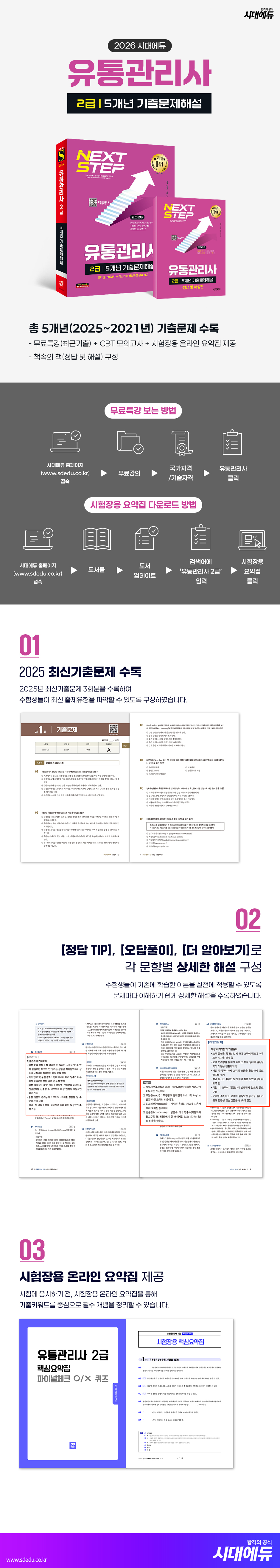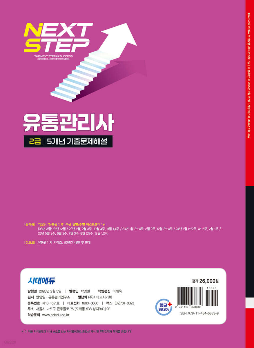 2025년부터 2021년 시험까지의 모든 기출문제 수록! 시험 준비의 완성은 실전연습만 한 것이 없습니다. 실제 기출을 접해보면서 문제 스타일이 어떠한지, 어느 개념들이 주로 나오는지 파악해야 합니다. 이론을 공부한 다음 직접 문제풀이에 적용해보는 단계가 필요합니다. 이 책은 유통관리사 전 과목을 공부한 수험생들이 문제풀이에 익숙해지도록 돕습니다. 최단 시간에 많은 유형의 문제 스타일을 파악한다는 목적 하에, 문제마다 이해하기 쉽게 상세한 해설을 달았습니다. [정답 TIP]은 문제와 직접 관련된 이론을, [오답풀이]는 다른 지문이 틀린 이유를 설명합니다. [더 알아보기]에서는 문제와 연관 있는 추가정보를 제시하여 수험생들의 심화학습을 돕습니다. 또한 최근 기출문제의 해설강의와 CBT 모의고사 3회분을 무료로 제공하여 빈틈없는 완벽한 대비가 가능합니다. 마지막으로, 기출키워드를 분석한 시험장용 온라인 요약집을 통해 시험에 응시하기 전 중요한 개념을 마무리 점검할 수 있도록 하였습니다. 시대에듀는 수험생 여러분의 성공적인 합격을 기원합니다. |