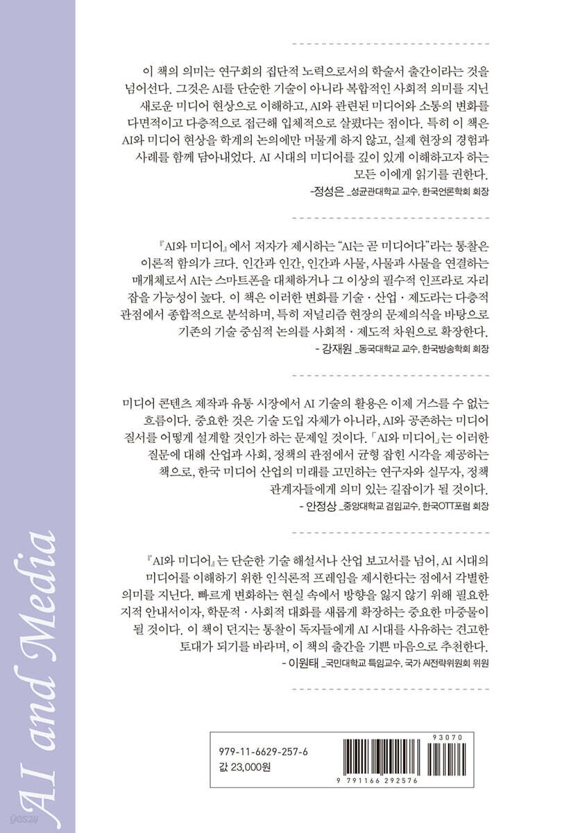 이 책의 의미는 연구회의 집단적 노력으로서의 학술서 출간이라는 것을 넘어선다. 그것은 AI를 단순한 기술이 아니라 복합적인 사회적 의미를 지닌 새로운 미디어 현상으로 이해하고, AI와 관련된 미디어와 소통의 변화를 다면적이고 다층적으로 접근해 입체적으로 살폈다는 점이다. 특히 이 책은 AI와 미디어 현상을 학계의 논의에만 머물게 하지 않고, 실제 현장의 경험과 사례를 함께 담아내었다. AI 시대의 미디어를 깊이 있게 이해하고자 하는 모든 이에게 읽기를 권한다.? - 정성은 (성균관대학교 교수, 한국언론학회 회장)