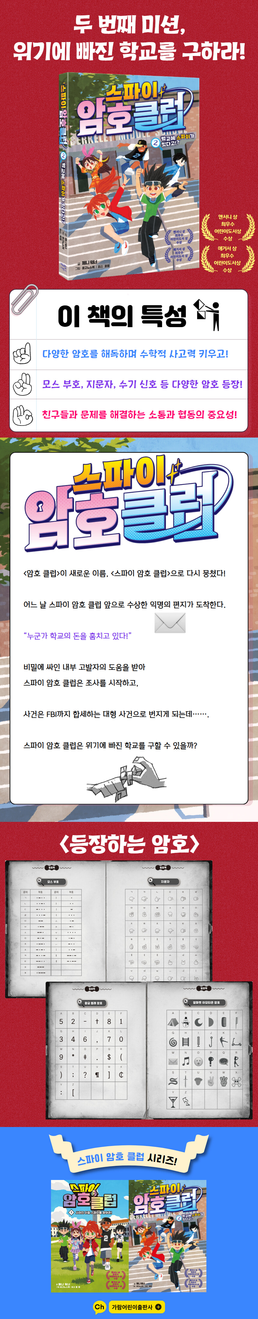 ‘애거서 상’, ‘앤서니 상’ 수상에 빛나는 페니 워너의 신작!인기 베스트셀러 〈암호 클럽〉 시리즈의 뒤를 잇는 흥미로운 두뇌 게임!수수께끼와 암호, 비밀 메시지를 풀어 미스터리 사건을 해결하라!〈스파이 암호 클럽〉 시리즈는 초등학생 대상의 미스터리 탐정 소설이다. 전 20권으로 인기리에 막을 내린 〈암호 클럽〉의 주인공 코디, 퀸, 루크, 마리아, 미카가 한층 업그레이드된 〈스파이 암호 클럽〉으로 또다시 독자들을 찾아왔다.이 책의 주인공인 코디, 퀸, 루크, 마리아, 미카는 암호를 만들고 푸는 걸 매우 좋아한다. 〈암호 클럽〉의 뒤를 잇는 〈스파이 암호 클럽〉을 만들어 각자의 비밀 우편함과 클럽하우스를 만들고, 주변에서 일어나는 갖가지 사건들에 숨겨진 암호를 풀어 나간다.각 장마다 해결해야 할 암호가 주어지며, 이 책을 읽는 독자들은 스파이 암호 클럽 멤버들과 함께 적극적으로 암호 풀이에 참여할 수 있다.『학교에 스파이가 있다고!?』는 첫 권 『사라진 이중 스파이를 찾아라!』의 뒤를 잇는 시리즈 두 번째 권으로, 중학교 3학년이 된 코디와 친구들이 학교를 배경으로 펼치는 흥미진진한 모험을 다루고 있다.암호와 추리, 탐정 소설은 언제나 아이들의 호기심을 자극한다. 다섯 명의 또래 아이들이 등장하는 이 소설은 탐정 추리 소설이라는 기본 틀에 암호 해독이라는 흥미 요소를 더했다. 독자와 대화하는 방식으로 이루어진 이 흥미진진한 책에는 다양한 암호들이 등장한다. 한글 자모음으로 이루어진 문자숫자식 암호, 지문자, 모스 부호, 수기 신호, 애너그램 등 간단하고도 비교적 보편적으로 알려진 암호들을 책의 주인공들과 독자들이 함께 풀이해 나간다.스파이 암호 클럽 멤버들은 비밀을 유지하기 위해 평소에 암호를 주고받고, 암호는 사건 해결에서 중요한 단서가 된다. 독자들에게 다양한 암호를 제시하고 읽는 법을 안내함으로써 단순히 이야기의 줄거리를 쫓아가는 데 머물지 않고 암호를 풀고 사건을 추리하도록 이끈다. 독자들은 이 책에 나오는 암호를 직접 풀면서 부담 없이 여러 교과의 내용을 익힐 수 있다. 이 책에 실린 암호들은 난이도가 제각각 다르므로, 학업 수준이 서로 다른 아이들도 자신에게 맞는 암호를 찾고 ‘암호 언어’들에 익숙해질 수 있다.책을 읽고 나서 독자들은 직접 암호를 만들어 볼 수도 있고, 서로 비밀 메시지를 보내서 상대방의 암호를 풀어 볼 수도 있다. 새로운 암호를 만들고 해결하면서 자신도 모르는 사이에 논리력과 추리력이 향상될 것이다.