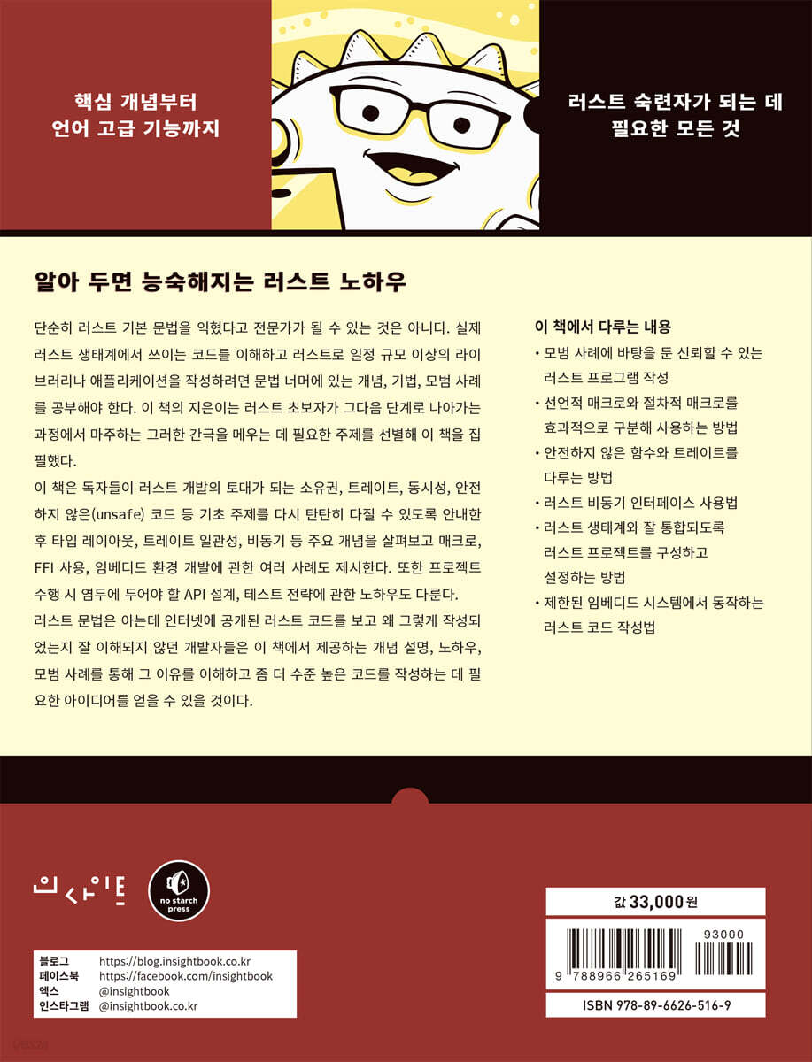 -모범 사례에 바탕을 둔 신뢰할 수 있는 러스트 프로그램 작성 -선언적 매크로와 절차적 매크로를 효과적으로 구분해 사용하는 방법 -안전하지 않은 함수와 트레이트를 다루는 방법 -러스트 비동기 인터페이스 사용법 -러스트 생태계와 잘 통합되도록 러스트 프로젝트를 구성하고 설정하는 방법 -제한된 임베디드 시스템에서 동작하는 러스트 코드 작성법 |