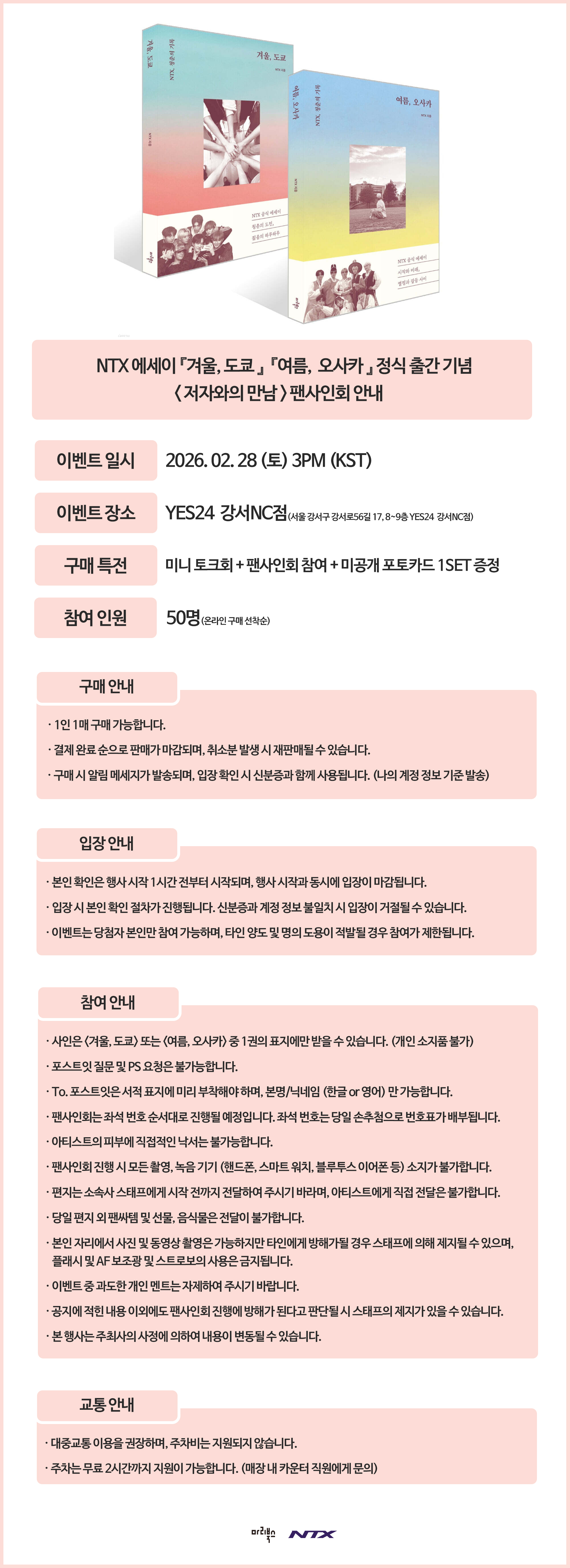 2021년에 데뷔한 5년 차 K-POP 아이돌 그룹으로 8인의 멤버 형진, 윤혁, 시하, 창훈, 호준, 로현, 은호, 승원으로 구성되어 있다. 팀명 NTX는 NEO TRACKS NO.X의 약자로 ‘새로운 음악의 길을 개척해 나가는 미지수의 아이들’이라는 뜻을 지녔다. 라이브 퍼포먼스를 주로 하는 NTX는 8인의 멤버 모두 직접 곡을 쓰고 만들고, 안무도 짜는 ‘창작 아이돌’ 그룹이다.