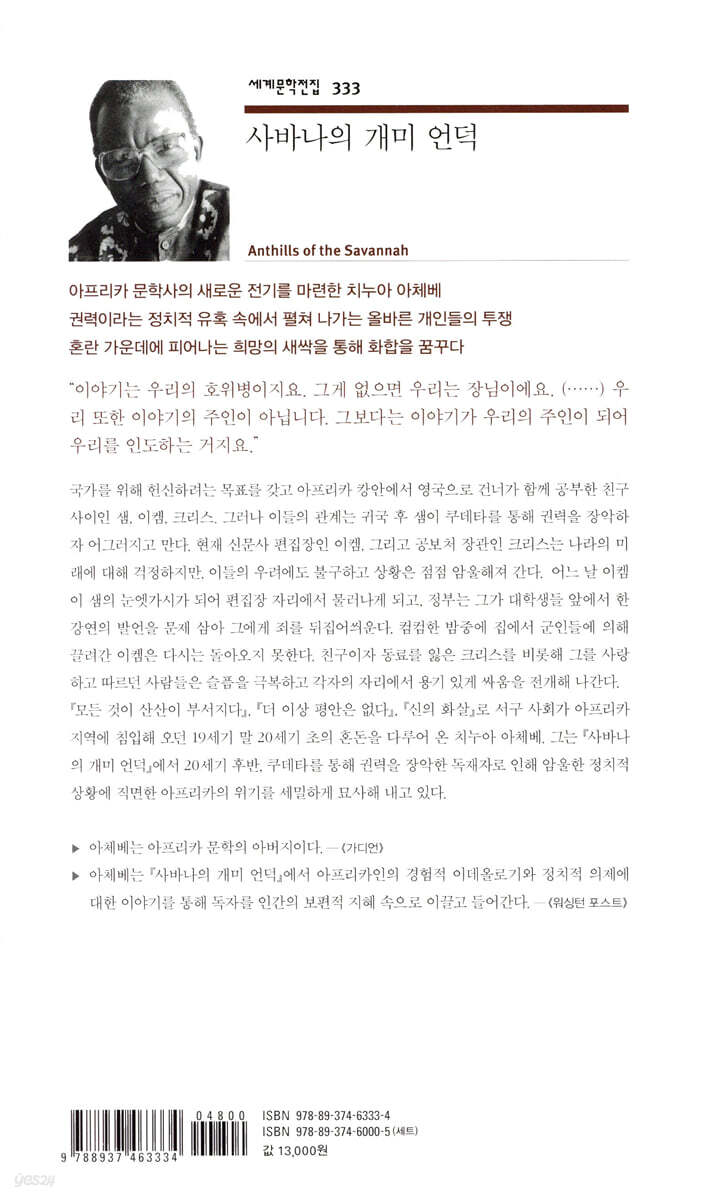 권력이라는 정치적 유혹 속에서 펼쳐 나가는 올바른 개인들의 투쟁 혼란 가운데에 피어나는 희망의 새싹을 통해 화합을 꿈꾸다 ▶ 아체베는 아프리카 문학의 아버지이다.-《가디언》 ▶ 아체베는 『사바나의 개미 언덕』에서 아프리카인의 경험적 이데올로기와 정치적 의제에 대한 이야기를 통해 독자를 인간의 보편적 지혜 속으로 이끌고 들어간다.-《워싱턴 포스트》 현대 아프리카의 모습을 세계에 알리는 작가 치누아 아체베 서구 세력의 침입 이후 이어진 군부 독재의 참상을 낱낱이 펼쳐 내다 “아프리카 문학의 수립자”이자 나이지리아 출신의 세계적인 작가 치누아 아체베. 그가 『모든 것이 산산이 부서지다』, 『더 이상 평안은 없다』, 『신의 화살』로 이루어진 ‘아프리카 3부작’ 이후 이십여 년 동안 침묵하다 발표한 『사바나의 개미 언덕』(1987)이 민음사 세계문학전집 333번으로 출간되었다. 서구 식민 제국주의 지배에 맞닥뜨린 아프리카 사람들의 전통이 무너지는 과정을 그려 온 그는, 『사바나의 개미 언덕』에서 서구 세력이 물러난 다음 새로 건설된 국민 국가에서 벌어지는 이야기를 펼쳐 보인다. 아프리카의 거대하고 황량한 초원 지대를 가리키는 ‘사바나’는 이 소설의 배경인 ‘캉안’이라는 가상의 아프리카 국가를 뜻한다. 또 ‘개미 언덕’은 그 황량한 초원 위에 탑처럼 꿋꿋이 서서 역사를 기억하고 기록하는 집단을 상징한다. 이 작품에서 아체베는 서구 세력의 품에서 갓 벗어난 신생 민주 국가 ‘캉안’에서 벌어지는 민족 지도자들의 고민과 권력의 유혹, 암투, 그리고 독재로 인한 갈등을 크리스, 샘, 이켐이라는 세 친구의 행보와 함께 엮어 나간다. 케냐 작가 응구기 와 시옹오가 “그의 작품에서는 아프리카의 목소리가 영어로 옮겨 가는 것을 느낄 수 있다.”라고 말했듯, 치누아 아체베가 아프리카 민중의 영혼을 담아 세계인에게 전달하는 이야기는 강력한 힘을 갖고 독자의 마음에 큰 울림을 남긴다. 부조리에 맞서 연대하는 과정, 그리고 놓치지 않는 희망 『사바나의 개미 언덕』의 배경인 가상 국가 캉안은 아프리카 국민 국가 건설의 과정에서 진통을 겪는 전형적인 포스트식민주의 국가이다. 그동안 아프리카 국가들이 서구 식민주의에 예속되어 겪는 갈등을 그려 왔던 아체베는, 이 소설 속에서 20세기 후반 서구 세력에 해방되어 새로운 독립 국가를 수립한 이후 국가 운영을 해 나가는 과정에서 발생하는 비민주적 문제에 주목했다. 크리스, 샘, 이켐은 국가 장학생으로 뽑혀 영국으로 유학까지 다녀온 엘리트이자 오랜 친구이다. 샘은 귀국한 후 정치적 야욕에 흔들려 쿠데타를 일으켜 일인자로 올라섰고, 크리스는 그 정권 아래에서 공보처 장관, 이켐은 주요 언론사 편집장을 맡았다. 군인 출신으로 권력의 최고 위치에 올라선 샘은 초반에는 내각 구성에 대해 크리스에게 조언을 요청하는 등 국가 운영을 민주적으로 해 나가는 듯했으나 점점 독재자로서 군림하기 시작하고, 그 압박 아래에서 내각 역시 부패하기 시작한다. 크리스는 점점 변해 가는 샘의 모습에 위기의식을 느끼고, 언론사 편집장인 이켐 역시 정부에 입바른 말을 하지 못하도록 강요받으면서 갈등이 점점 심해진다. 결국 이켐은 정부의 계략에 의해 편집장 자리에서 사퇴하고 강연에서 한 말을 트집 잡혀 공안에 끌려가 살해된다. 예상치 못한 폭력적인 상황이 벌어지자 크리스와 주변 인물들이 함께 연대하여 방법을 모색해 나간다. 크리스의 애인인 비어트리스, 죽은 이켐의 애인인 엘레와, 이켐의 강연을 듣고 감동받은 학생회장 이매뉴얼, 그리고 평소 이켐을 존경해 왔던 택시 기사 등 성별, 사회적 위치와 직업이 서로 다른 이들이 모여 이켐의 죽음이 헛되지 않기 위해 각자의 자리에서 노력하는 모습이 이어진다. 권력에 대한 본능적인 욕망과 암투, 서로 다른 계층 간의 반목, 전통과 현재의 대립, 종교 간의 관용 부재, 정치 이념 투쟁 등 작품 속에서 드러나는 다양하고도 복잡한 문제는 인간 역사와 문명에 편재한 문제들이다. 아체베는 혼란을 겪고 있는 캉안이라는 나라의 한가운데로 독자를 이끌고 들어가 등장인물이 이런 문제를 헤쳐 나가는 과정을 손에 땀을 쥐게 만들 만큼 생생하게 묘사한다. 지식인의 역할에 대한 고민 끝에 발견한 ‘여성’의 가치 작품 전면에 드러나는 것은 엘리트 지식인 3인방의 캐릭터와 행보이다. 특히 돌변해 버린 샘에 대항해 크리스와 이켐은 조국의 미래에 대해 각자의 자리에서 고민하고 토론하며 방법을 모색해 나간다. 낙후된 조국의 현실과 아직 깨어나지 못한 민중에 대한 안타까운 마음, 밝은 미래를 위해 치열하게 고민하는 모습은 특히 인상적이다. 그러나 정부의 눈밖에 난 이켐이 계략에 의해 허무하게 죽고 크리스가 정부에 의해 쫓기게 되면서 이들의 노력은 빛을 잃는 듯해 보인다. 여기서 크리스의 연인인 비어트리스와 이켐의 연인인 엘레와의 역할이 빛을 발한다. 재정부 수석 비서관인 비어트리스와 서민 출신으로 시장에서 장사를 하는 엘레와라는 두 여성 등장인물은 서로 교육 수준이나 사회적 지위는 다르지만, 크리스와 샘의 조
