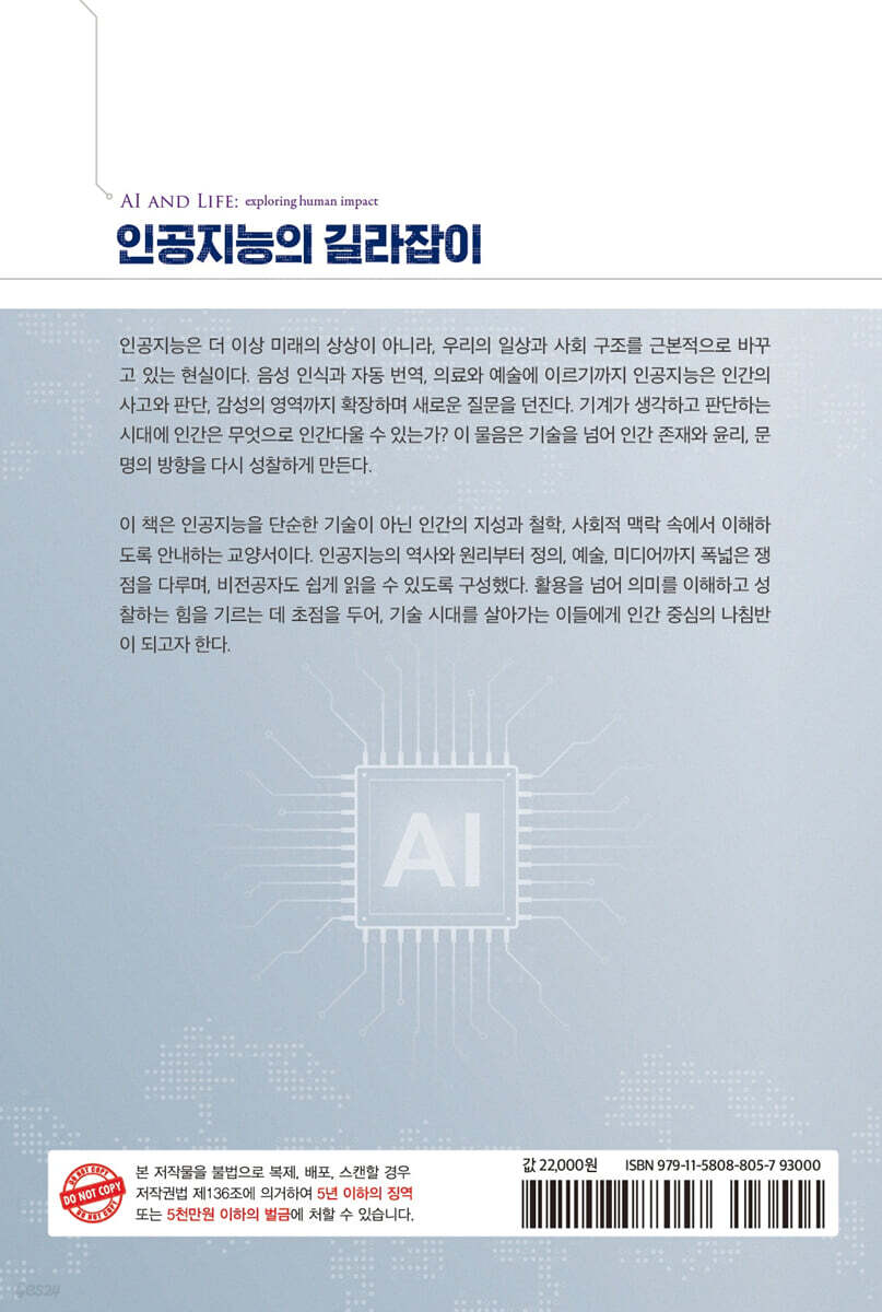 AI의 발전은 우리에게 편리함을 선사하지만, 동시에 깊은 질문을 던진다. “기계가 생각할 수 있다면, 인간은 무엇으로 인간인가?” 이 물음은 단순한 기술의 문제가 아니라 인간 존재의 본질과 윤리, 그리고 문명의 방향을 다시 묻게 만드는 철학적 질문이다. 기술이 인간의 능력을 확장할수록, 우리는 스스로의 존재 이유를 되묻지 않을 수 없다. 인공지능은 하루아침에 등장한 기술이 아니다. 그 뿌리는 인간이 ‘자신을 이해하려는 욕망’에 있다. 고대 그리스의 피그말리온 신화, 유대 전설의 골렘, 중세의 자동인형, 근대의 계산기와 기계적 논리체계는 모두 ‘생각하는 존재’를 만들고자 했던 인간의 오랜 꿈을 보여준다. 이 꿈은 단순한 기술적 호기심이 아니라, 인간의 이성과 의식을 재현하려는 철학적 열망의 역사였다. 20세기 중반, 앨런 튜링은 “기계는 생각할 수 있는가?”라는 질문을 제기하며 인간의 사유를 과학의 언어로 번역하려는 첫 시도를 했다. 이후 인공지능의 발전사는 인간의 지성이 외부로 확장되는 과정이자, ‘인간이란 무엇인가’라는 물음을 기술의 차원에서 되풀이한 지적 여정이었다. 인공지능은 알고리즘의 산물이지만, 그 본질은 인간 사유의 철학적 결과물이다. 다시 말해 인공지능의 역사는 인간이 자신을 닮은 지성을 창조하려는 문명사적 탐구의 연속이었다. 오늘날 인공지능은 사회 전반을 이끄는 핵심 인프라가 되었다. 교육, 의료, 예술, 경제, 미디어, 행정, 정치 전반에서 그 영향력은 전례 없이 확장되고 있다. 그러나 기술의 진화가 인간의 성찰을 앞지르게 된다면, 우리는 편리함 속에서 인간의 주체성과 윤리를 잃을 위험이 있다. AI의 발전은 새로운 사회적 책임을 요구한다. 데이터와 알고리즘이 인간의 판단을 대신하고, 기계가 창작과 결정의 영역에 진입하는 지금, 인공지능을 올바르게 이해한다는 것은 곧 기술을 넘어 인간을 이해하는 일이다. 인공지능의 진보가 인류를 이롭게 하려면, 그 기반에는 인간에 대한 존중과 성찰이 있어야 한다. 이 책 『인공지능의 길라잡이; 인간에서 기술까지』는 이러한 문제의식에서 출발하였다. 인공지능을 단순한 기술의 결과물이 아니라 인간의 지성, 윤리, 예술, 사회적 맥락 속에서 통합적으로 이해하고자 한다. 인공지능을 배운다는 것은 프로그램의 동작 원리를 익히는 것을 넘어, 그 기술이 인간의 사고와 가치, 관계, 문화에 어떤 영향을 미치는지를 살피는 일이다. 본 교재는 인공지능의 기본 개념과 역사, 기술의 원리를 다루는 동시에 정의(Justice), 예술, 미디어, 경영, 통계 등 다양한 영역에서 인공지능이 어떤 의미를 지니는지 탐색한다. 여러 전공의 교수진이 협력해 기술적 설명과 인문학적 사유를 조화롭게 구성했으며, 비전공자도 이해할 수 있도록 서술의 난이도를 조정하였다. 이 책은 인공지능을 ‘활용의 기술’이 아닌 ‘이해의 교양’으로 접근한다. 인공지능을 익힌다는 것은 코드나 시스템을 배우는 것이 아니라, 그 속에 담긴 인간의 철학과 사회의 구조를 읽어내는 통찰을 키우는 일이다. 기술은 인간의 손끝에서 태어나지만, 그 의미와 방향은 인간의 마음이 결정한다. 오늘날 인공지능을 모른다는 것은 곧 현대 사회의 언어를 모른다는 것과 같다. 인공지능은 이미 언어, 경제, 예술, 교육, 윤리 등 거의 모든 분야의 기본 문법이 되었기 때문이다. 따라서 인공지능에 대한 이해는 더 이상 선택이 아니라 모든 시민이 갖추어야 할 교양적 책무이다. AI 시대의 진정한 교양은 기술의 작동 원리를 아는 능력이 아니라, 그 기술의 이면에서 인간의 의도와 철학을 읽어내는 통찰력이다. 기계가 만들어 내는 결과보다, 인간이 그 기술을 통해 무엇을 꿈꾸고 어떤 사회를 지향하는지가 더 중요하다. 인공지능을 통해 우리는 인간의 본질과 한계, 그리고 인간다움의 의미를 새롭게 묻게 된다. 이 책은 인공지능이라는 기술을 매개로 인간의 사고와 감성, 사회의 구조와 윤리를 함께 이해하도록 안내하는 교양 교재이다. 학생들이 기술에 대한 비판적 사고와 창의적 상상력을 함께 키워, 인공지능을 단순히 ‘활용하는 존재’가 아니라 ‘이해하고 성찰하는 인간’으로 성장하길 바라는 마음으로 집필되었다. 인공지능은 인간의 손끝에서 태어났지만, 그 방향은 인간의 사유가 결정한다. 이 책이 인공지능의 세계로 들어가는 독자들에게 기술을 넘어 인간을 바라보는 사유의 나침반이 되길 바란다. 그리고 이 교재가 대학 교양 교육의 현장에서 학생들에게 기술과 인간, 과학과 철학을 잇는 지적 여정을 열어주는 작은 출발점이 되기를 기대한다. 좋은 책을 위해 최선을 다했으나 부족한 부분이 있을 수 있다. 이 점은 양해를 바라며, 추후 수정사항이 있을 경우에는 자유아카데미 홈페이지 자료실(www.freeaca.com)을 통해 제공할 예정이니 참고해 주기 바란다. 끝으로, 이 책의 출간에 도움을 주신 자유아카데미 여러분께 감사드린다. --- 머리말 중에서 |
