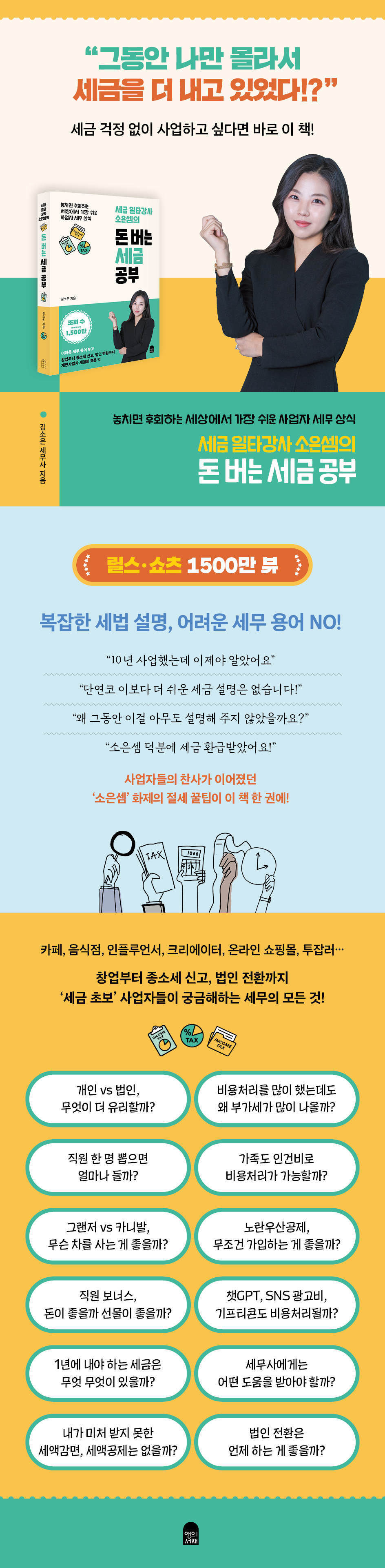 PART 1. 창업하기 전에 꼭 알아야 할 것들 프리랜서 vs 사업자, 어떤 게 유리할까? 개인사업자 vs 법인사업자, 무엇이 더 좋을까? [Tip] 집 사려면 개인? 건물 사려면 법인? 내 사업은 과세일까, 면세일까? [Tip] 면세사업자는 세금 안 내도 될까? 일반과세자와 간이과세자 [Tip] 간이과세자 1월에 사업을 시작하면 좋은 이유 사업자 주소지 똑똑하게 정하는 방법 사업자등록하기 PART 2. 세금의 시작, 부가가치세 부가가치세 제대로 알기 [Tip] 부가가치세 예정고지 일정을 기억하라! [Tip] 부가가치세, 어떻게 하면 줄일 수 있나요? 부가가치세 계산구조 쉽게 이해하기 [Tip] 간이과세자 부가가치세 계산구조 부가가치세 신고로 매출액이 확정된다 [Tip] 매출 누락, 국세청은 다 알고 있다! 부가가치세 신고로 매입액이 확정된다 부가가치세 공제가 안 되는 항목들 비용처리와 부가세 공제는 다르다 사업용 카드와 부가가치세 공제 부가가치세를 줄이기 위해 활용하면 좋은 제도 PART 3. 원천세부터 4대보험까지 인건비의 모든 것 인건비의 기본, 원천세 근로소득과 사업소득, 무엇이 더 유리할까? [Tip] 대표와 직원이 서로 절대 이해할 수 없는 이유 4대보험 쉽게 이해하기 [Tip] 4대보험료를 줄여주는 지원제도, 두루누리 대표자의 4대보험료 [Tip] 개인사업자, 건강보험료 줄이려면 어떻게 해야 하나요? 직원의 퇴직연금 PART 4. 개인사업자 세금의 종착지, 종합소득세 종합소득세란 무엇일까? [Tip] 누진세율과 누진공제 [Tip] 11월의 세금 폭탄, 중간예납 사업소득 신고의 모든 것 [Tip] 간편장부 작성과 종소세 셀프신고 [Tip] 셀프신고 했다가 세금을 토해내는 경우가 있다? 세금을 줄여주는 비용처리 세금을 줄여주는 소득공제 세금을 줄여주는 세액감면과 세액공제 [Tip] 세액감면을 받아도 세금이 많이 나와요! 종합소득세를 줄이는 3가지 기본 원칙 성실신고 확인 대상 사업자인지 확인하자! 이것만 해도 세액감면 기본은 한다! PART 5. 알아두면 득이 되는 비용처리 꿀팁 사업자등록을 하자마자 무조건 해야 하는 5가지 직원 한 명 뽑으면 세금이 얼마나 줄까? 차를 구입하면 얼마나 비용처리될까? [Tip] 법인 명의로 슈퍼카를 구입하는 이유 그랜저 vs 카니발, 무슨 차를 사는 게 더 이득일까? 3천만 원짜리 장비를 샀는데 전액 비용처리될까? 가족, 인건비로 비용처리가 가능할까? 노란우산공제는 필수일까? 직원 보너스, 돈이 좋을까, 선물이 좋을까? 챗GPT, SNS 광고 등의 해외결제, 비용처리될까? 기부하면 세금 줄이는 데 도움이 될까? 청첩장, 부고문자도 비용처리가 된다 상품권과 기프티콘도 비용처리 가능할까? 주말에 거래처와 골프 치면 비용처리될까? PART 6. 법인 전환, 언제 하는 게 좋을까? 개인사업자와 법인사업자의 차이 법인 대표는 종합소득세를 안 내도 될까? 법인 전환, 이럴 때 고려하자! [Tip] 법인 전환했더니 매출액이 증가했다? 법인 돈, 합법적으로 개인 자금화하는 방법 [Tip] 법인을 운영할 때 유의해야 할 점 부록 Ⅰ. 연간 세무/노무 일정 부록 Ⅱ. 현금영수증 의무발행업종 |
